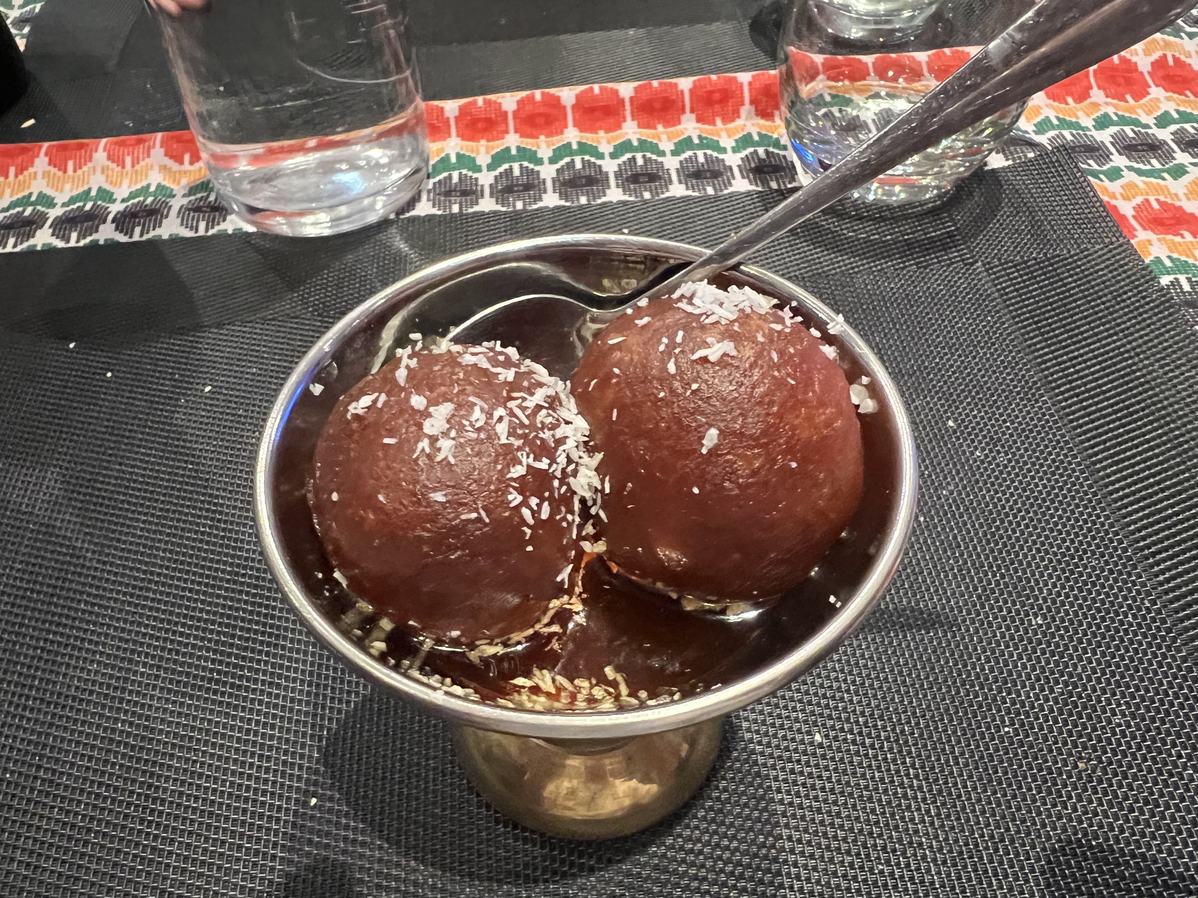 Dernière expérience d’un restaurant népalais à Paris il y a plusieurs dizaines d’années. Vu qu’un restaurant indien ouvrait à deux pas de chez moi proposait ces spécialités, me suis promis de venir pour celles-ci. Petite tricherie de ma part en commandant un naan garlic fromage. Désolé, trop tentant ! Mutton Sekuwa en entrée : morceaux de gigot d’agneau mariné. Simple, bon, mais viande avec quelques nerfs. Dal Bhat Masu : le plat national avec un curry de poulet (agneau ou crevette possibles). Très bon, varié, peu pimenté, pas si épicé. Fait voyager. Pas pu finir le riz, c’est dire que c’était copieux. Carte des vins avec l’essentiel en bouteilles, demi-bouteilles ou verres, bière népalaise ou indienne. On est accueilli avec beaucoup d’amabilité avec en fond une musique apaisante. Vaut le déplacement depuis quelques kilomètres à la ronde…