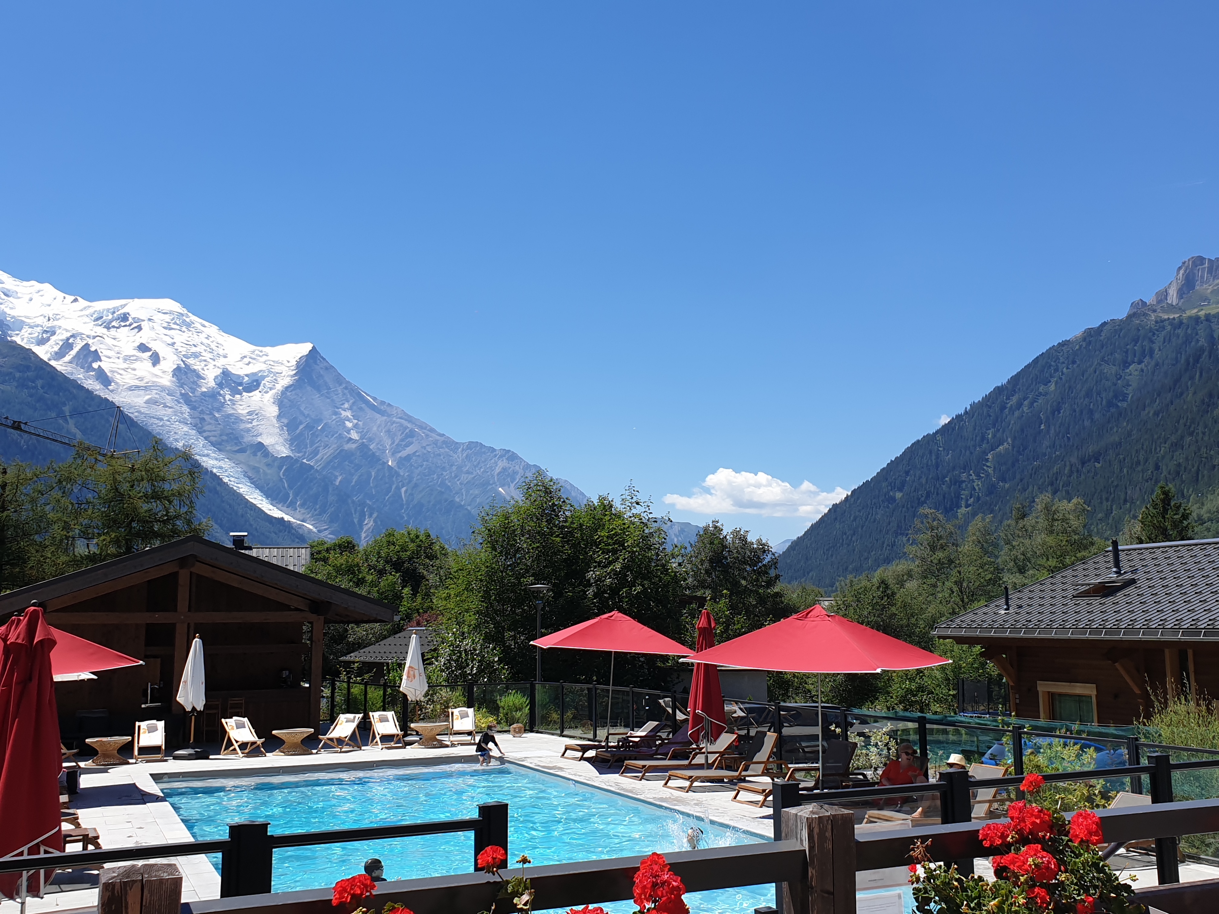 bien placé juste en dehors de Chamonix. Il y a un bus pour visiter Chamonix sans le problème du parking en août. Dernier noctambus 23h. Gande piscine avec vue sur mont blanc, plan anticanicule !! petit déjeuner copieux au jardin également. Personnel aimable.