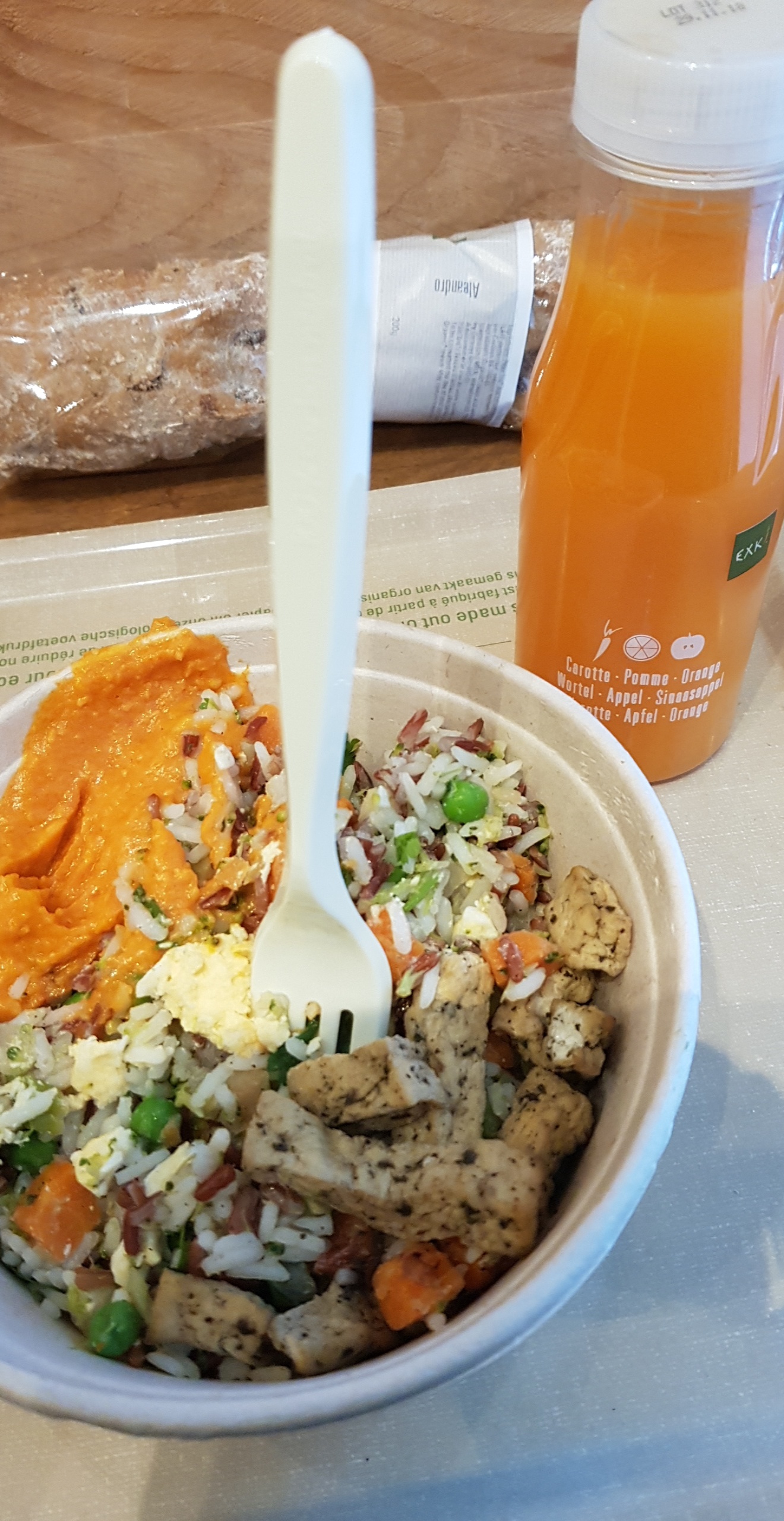 J'y suis allée pour essayer car le concept avait l'air attrayant (cadre agréable, cuisine bio), mais grosse déception en fait : les plats sont insipides, emballés dans du plastique, et les employés pas très sympas. En bref, passez votre chemin.