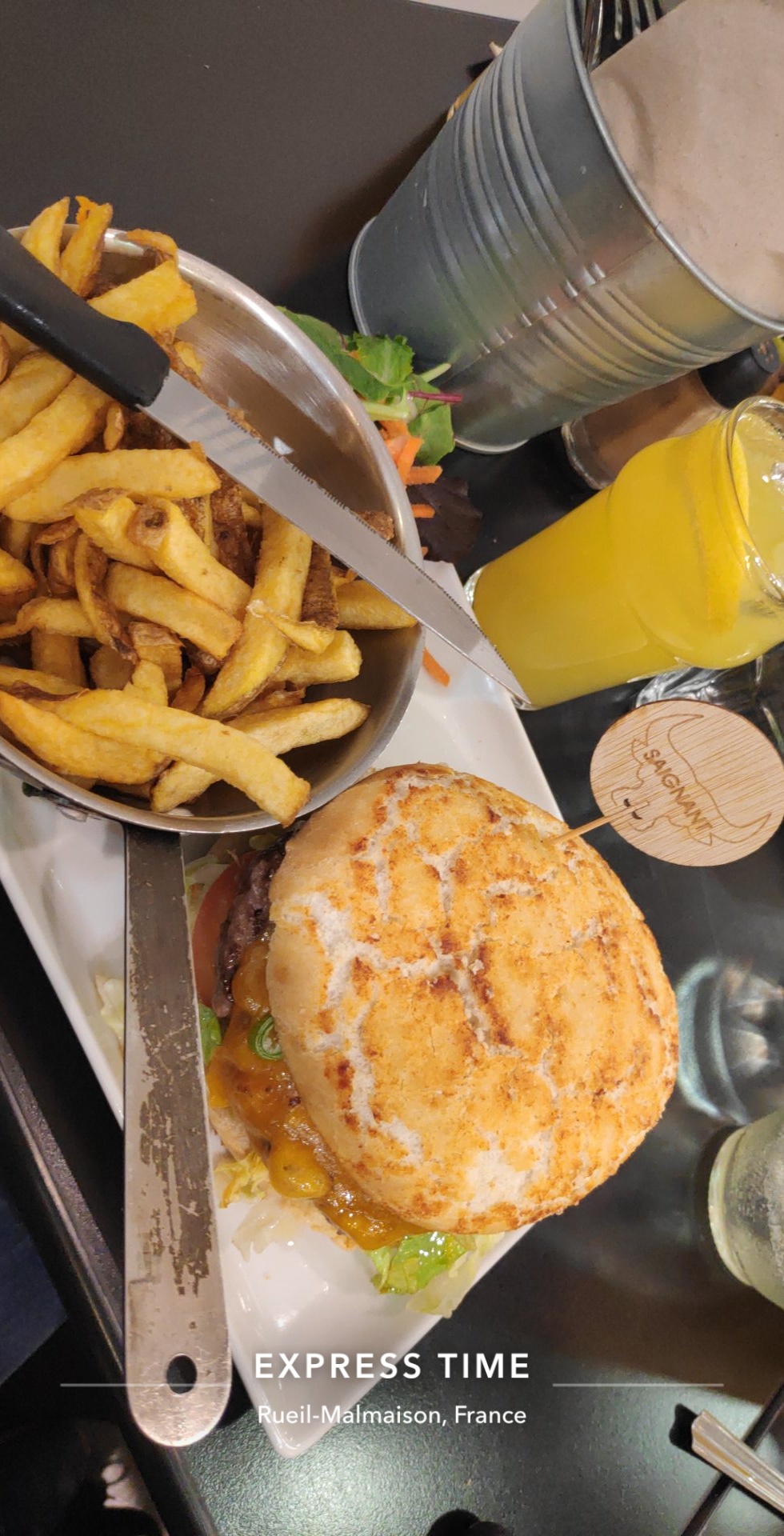 Repas entre collègues, les burgers étaient préparés à l'avance donc très secs et pas très chaud. Ce n'est pas du fait maison.