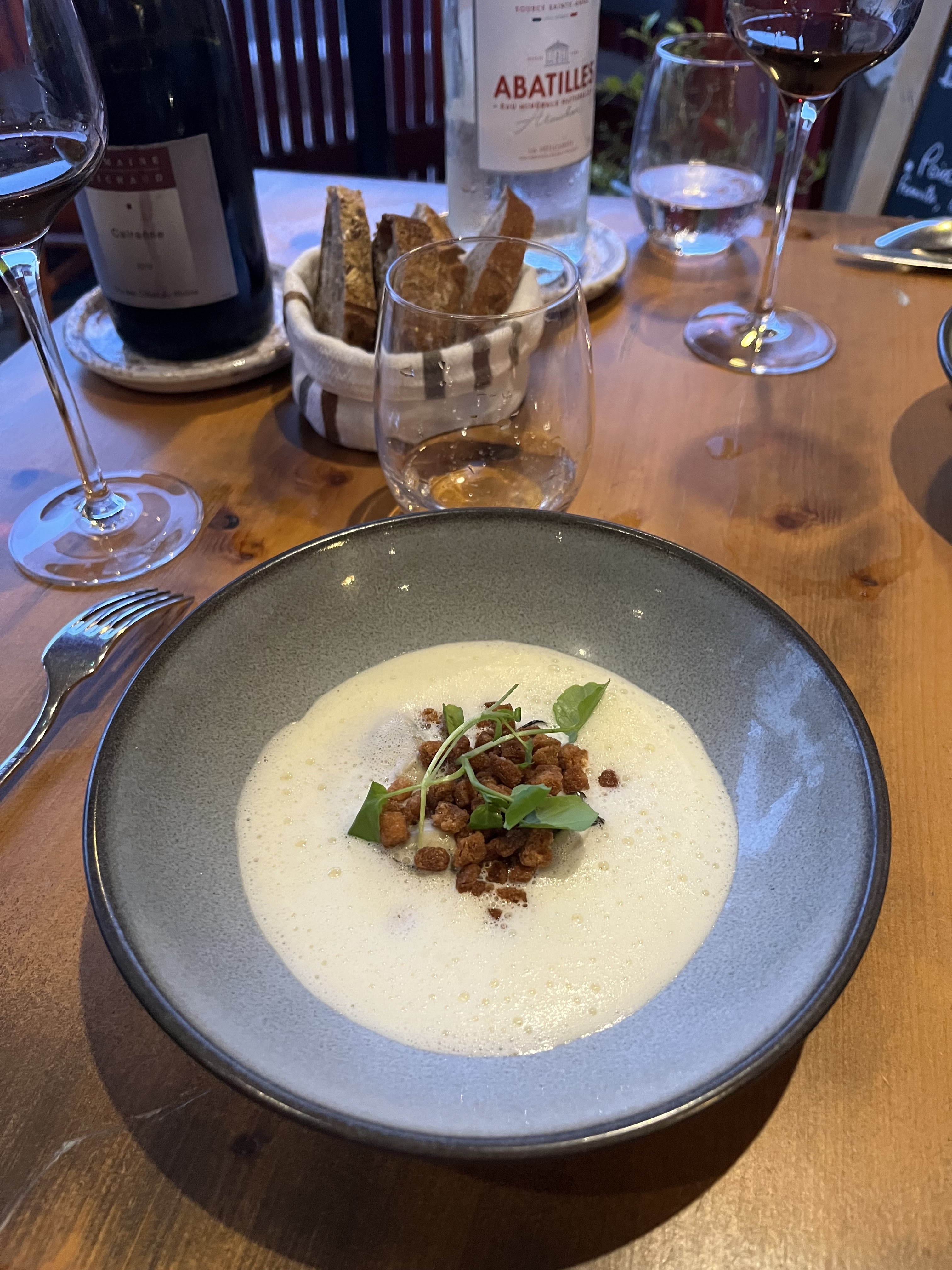 FANTASTIQUE!! Combinaison intéressante de saveurs mais plats simples axés sur d'excellents ingrédients locaux. Moins est plus. Des plats auxquels on n'aurait jamais pensé mais où les saveurs se mariaient parfaitement (nous rappelait la cuisine « minimaliste » scandinave). Étoile supplémentaire pour les vins locaux ludiques au verre et au pichet, qui permettent d'en déguster plusieurs. Cadre et personnel charmants également, gérer un restaurant avec seulement 2 personnes est impressionnant. C'était bien mieux et plus intéressant que la semaine que nous venons de passer dans des restaurants Michelin coincés en Champagne et à Saint Emilion ! MERCI!