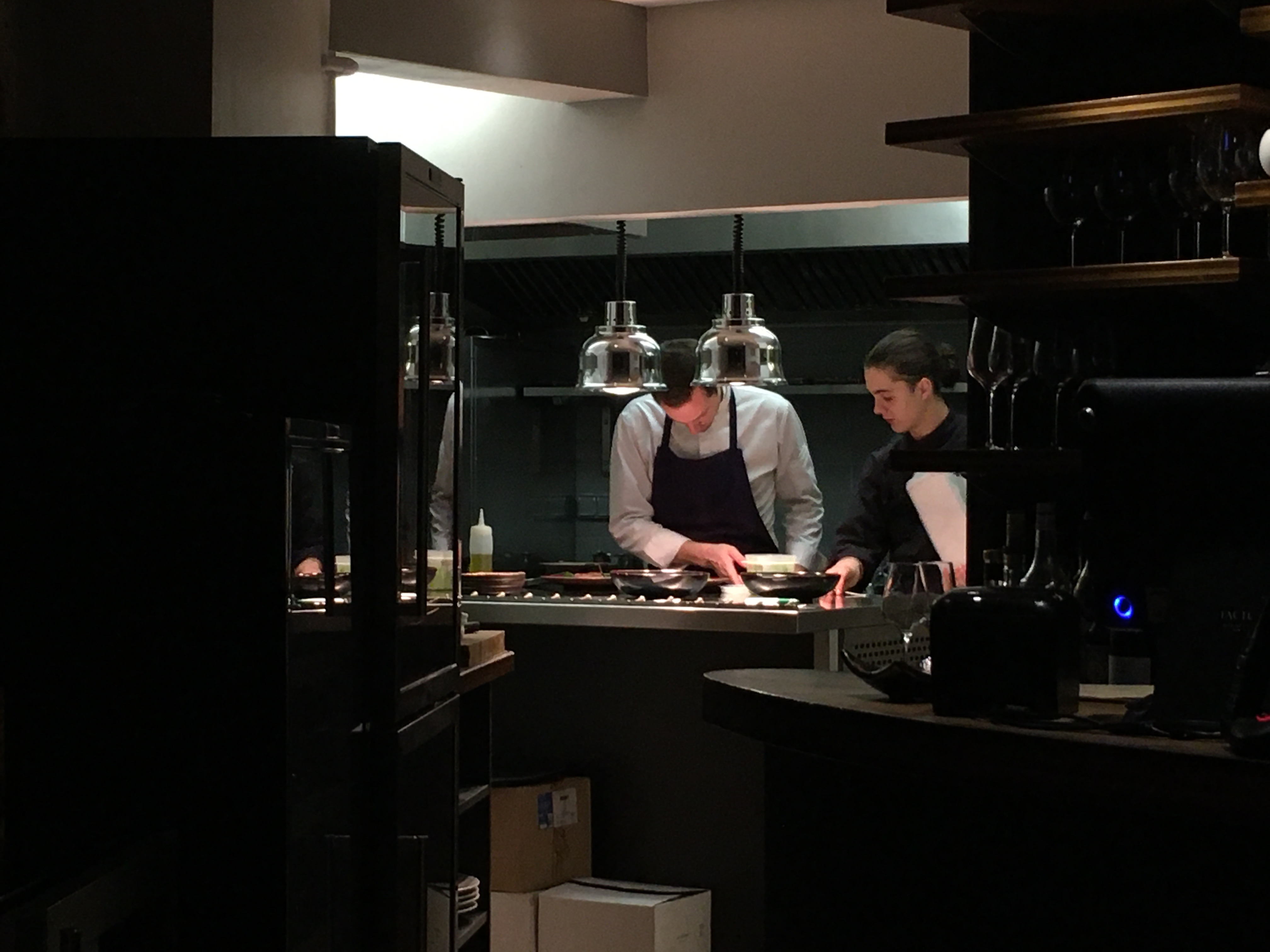 Un grand équilibre entre l’inventivité, le savoir-faire et des complexités qui ne doivent rien à l’esbroufe et tout au talent. On est là en présence d’un chef qui n’a sans doute pas achevé sa progression mais fait preuve d’une très belle maîtrise. Le service est compétent, efficace sans pour autant oublier la convivialité. La déco en revanche dans sa grande sobriété confine presque à une aridité qui ne correspond pas trop à la cuisine, un effort peut-être de ce côté à prévoir ? Quoiqu’il en soit nous emportons un beau souvenir de ce menu dégustation en 5 plats très inspirés. Merci à vous aussi d’avoir adapté le menu pour me permettre de ne pas manger de viande.