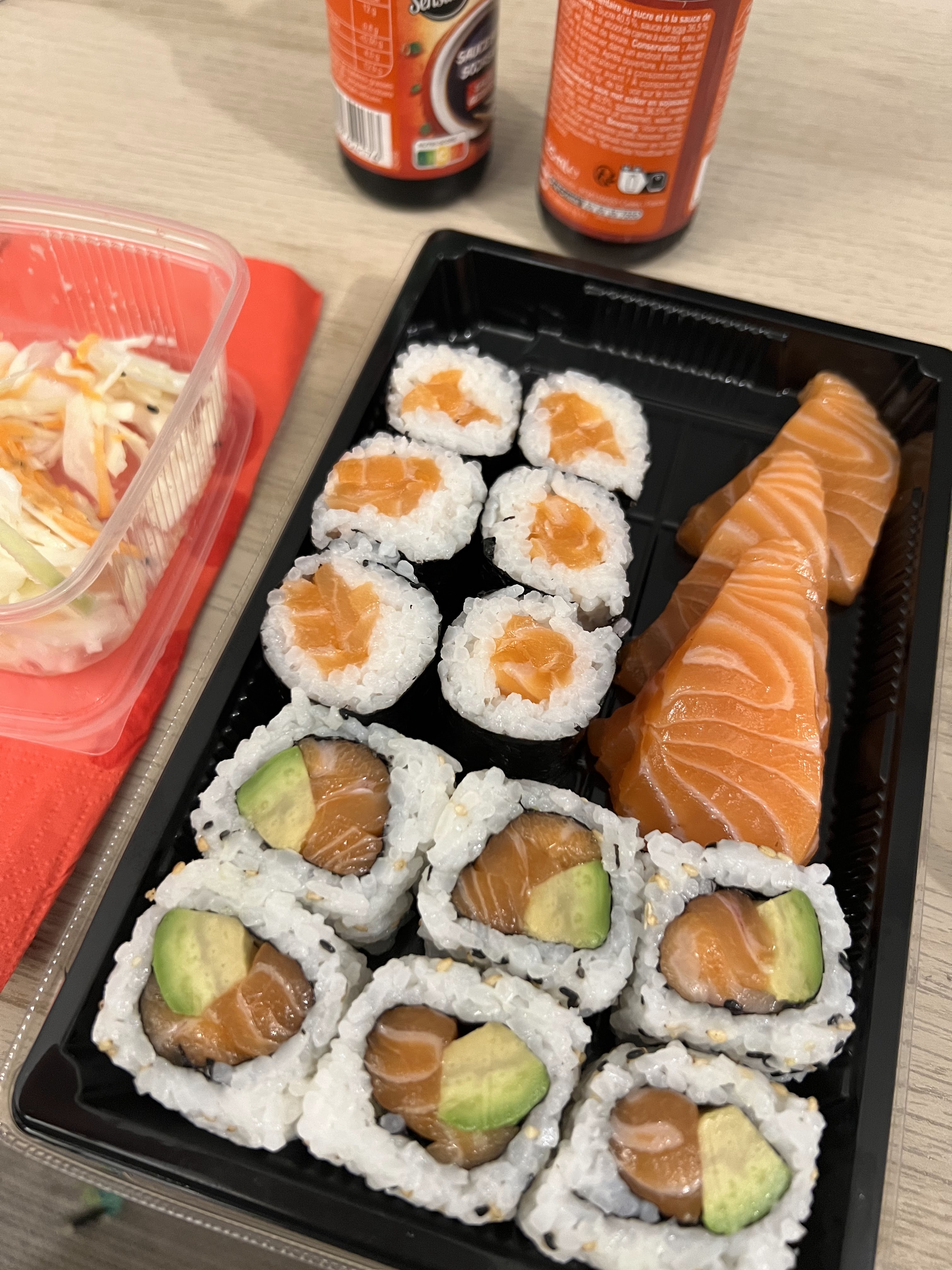 Salade au saumon et sushis délicieux , produits très frais. Accueil agréable, juste un peu d 'attente car beaucoup de commande.