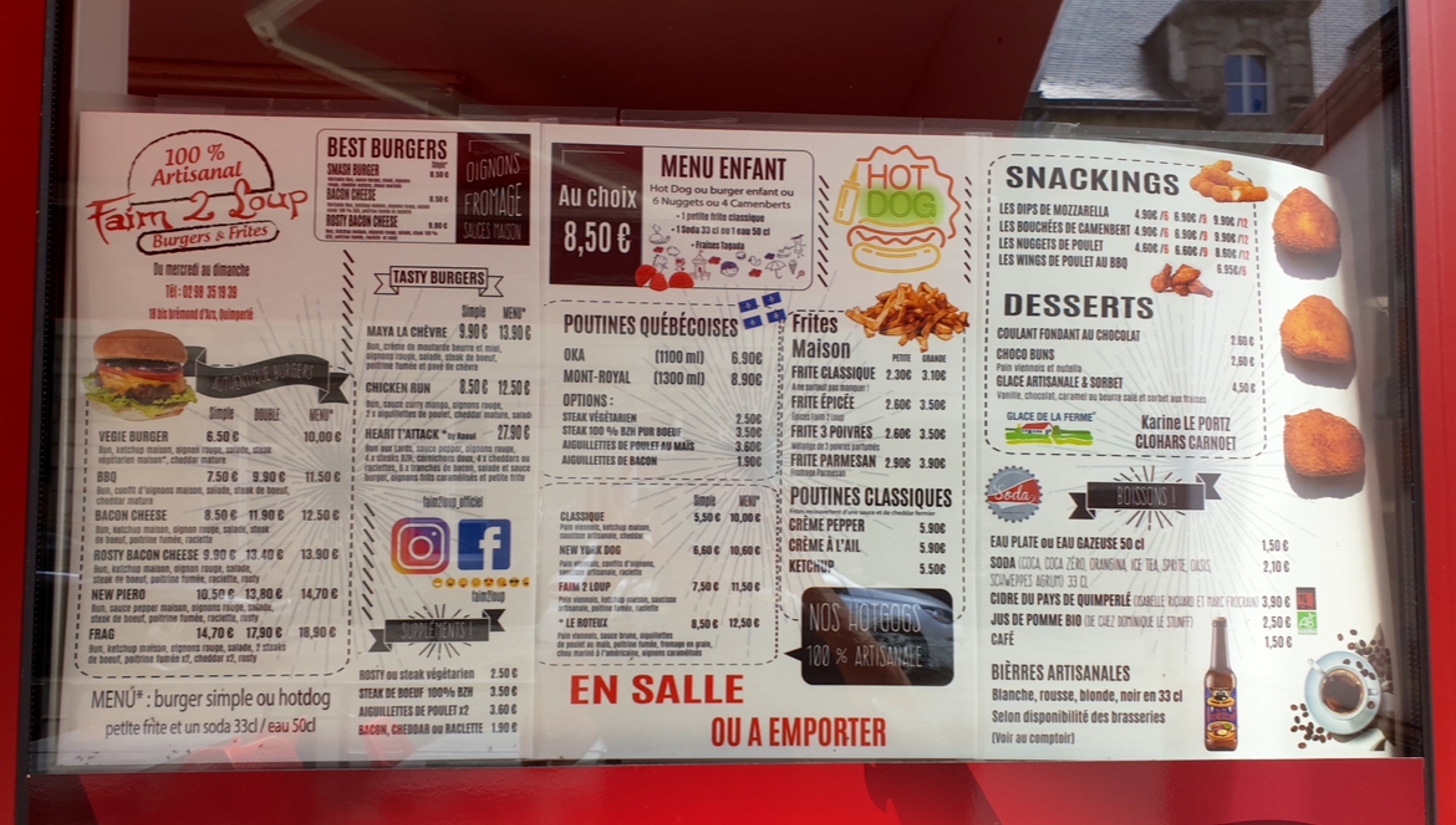 Si jamais vous vous trouvez à Quimperlé, en France, rendez-vous service et arrêtez-vous chez Faim 2 Loup. Ils ont une configuration intéressante, avec des repas à l'intérieur disponibles et une fenêtre côté rue pour commander. Beaucoup d'options intéressantes pour les mangeurs de viande et une très délicieuse option de burger végétarien pour les végétariens. J'ai mangé ici au moins 4 fois pendant mon voyage.
