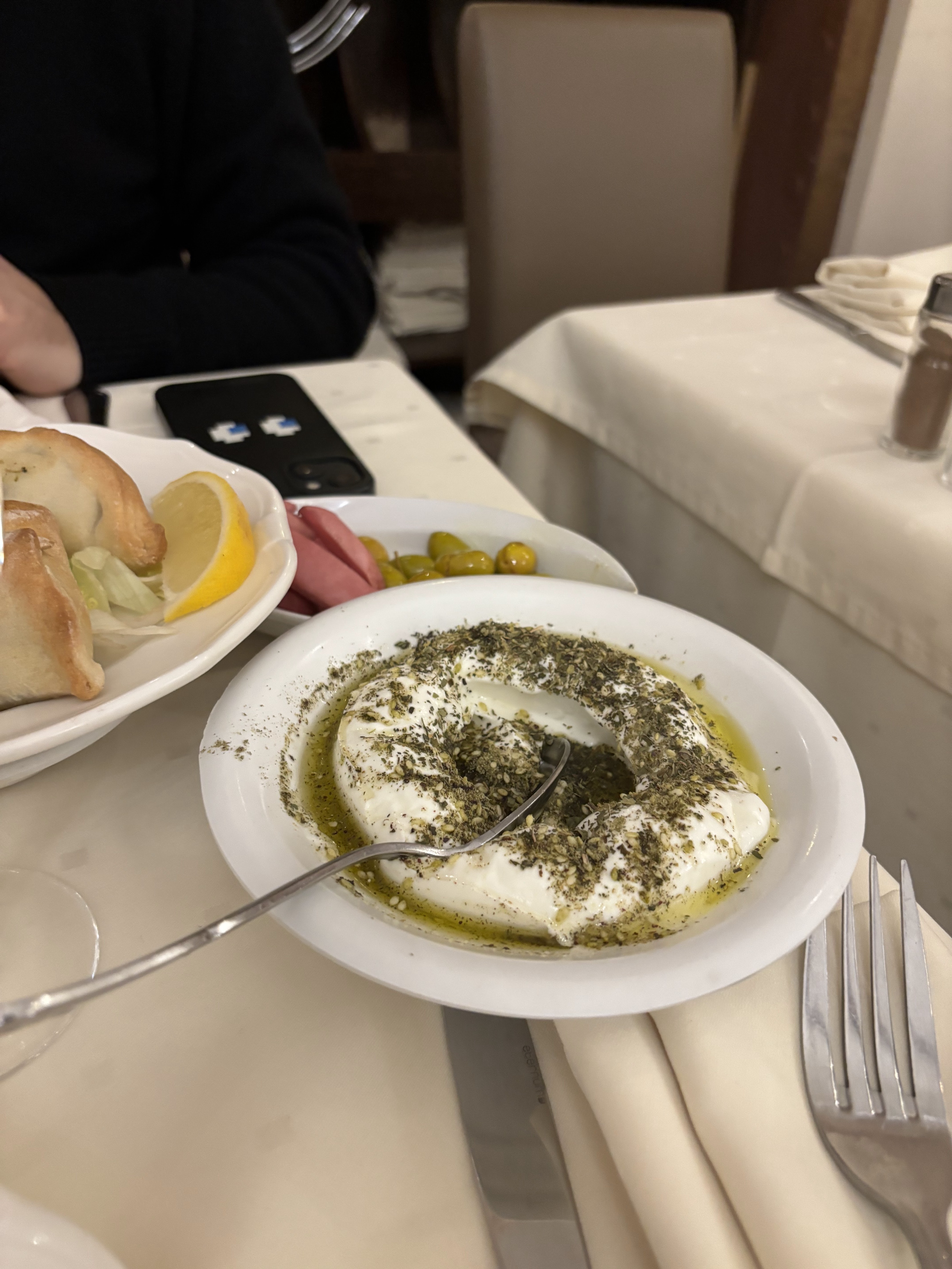 Arrivées à 21h, on a pris la formule Mezze pour deux..comment dire ? Notre table a été envahie par une farandole de plats plus savoureux les uns que les autres..12 spécialités en portion copieuse..et tout était super bon avec un petit vin blanc libanais super doux. Le personnel était au petit soin pour nous, on a même eu la chance d avoir une ambiance d enfer avec un violoniste talentueux qui a mis le feu a la salle ! Je recommande vivement : pour l ambiance et le rapport qualité prix J'ai même pas fait de photos tellement je me suis régalée