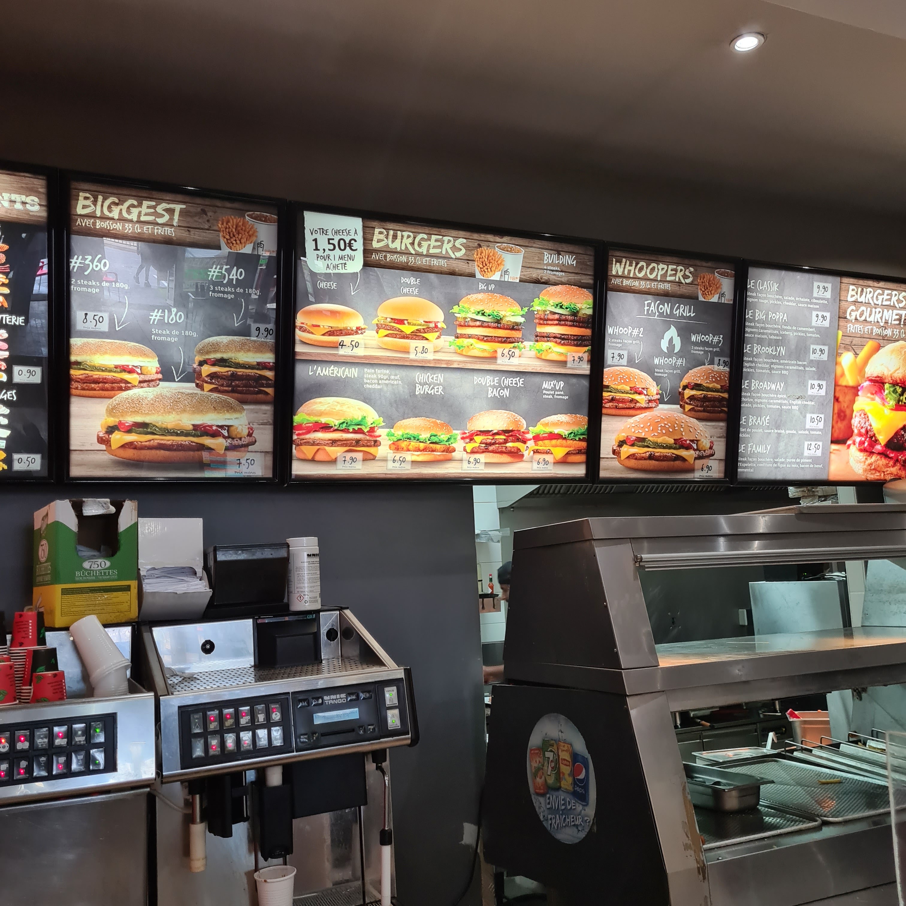 Bonjour, Hamburger réceptionné dès le bip, et à peine tiède, idem pour les frites. Woope 1, steak trop cuit et sec, une vrai semelle. Quand on veut imiter Burger King, il faut mettre les moyens. On vous prend pour des pigeons. Toilettes salles, rien pour se sécher les mains. L accueil est à déplorer. Bref ne vous y arrêtez pas.
