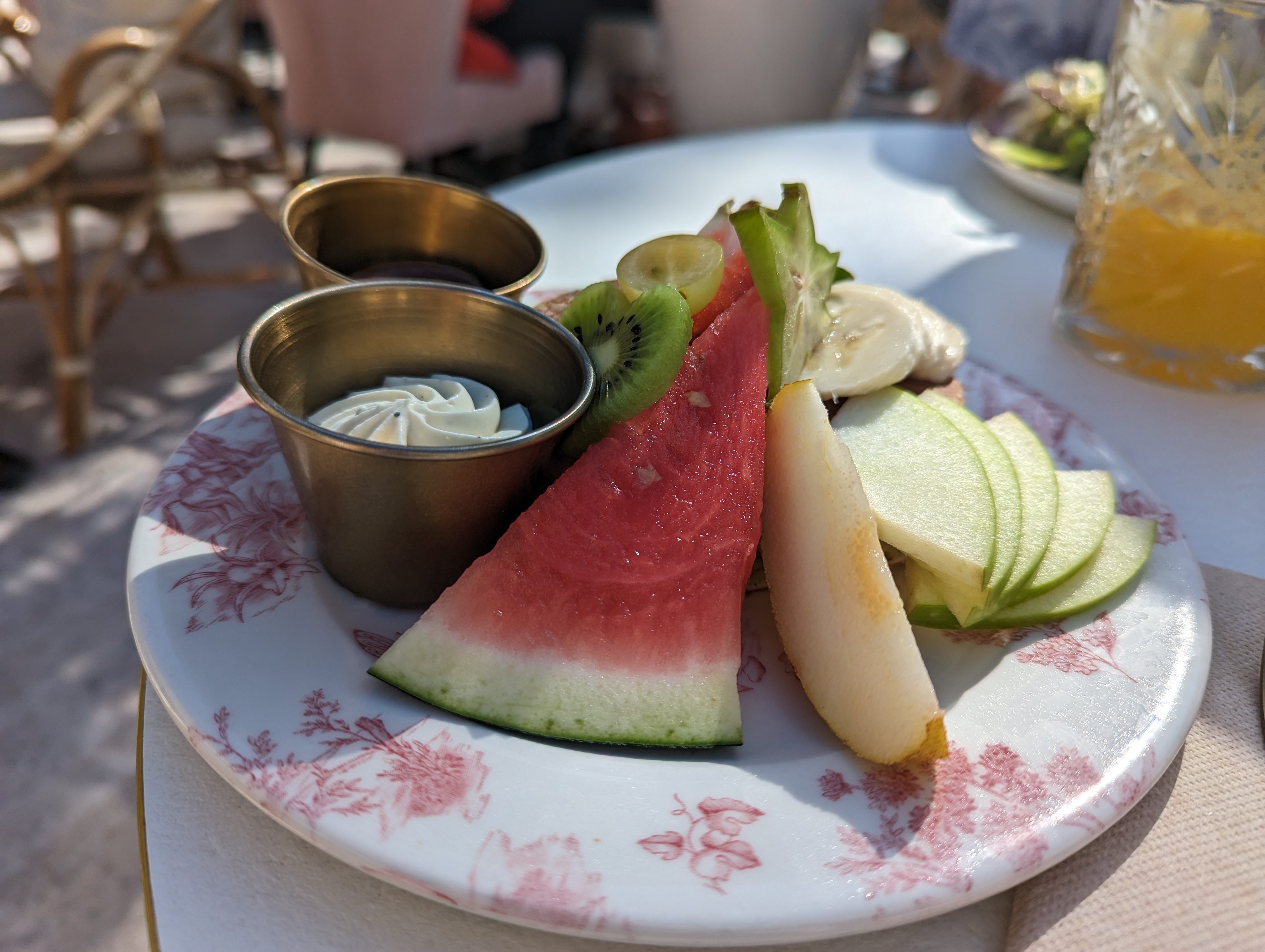 Le petit déjeuner était bon mais à ce prix on s'attend à l'excellence ou à être surpris. Par contre je n'avais jamais attendu près de 15 minutes pour un cappuccino et 30 minutes pour un pain au chocolat bon mais brûlant.. La terrasse et le service sont sympathiques.