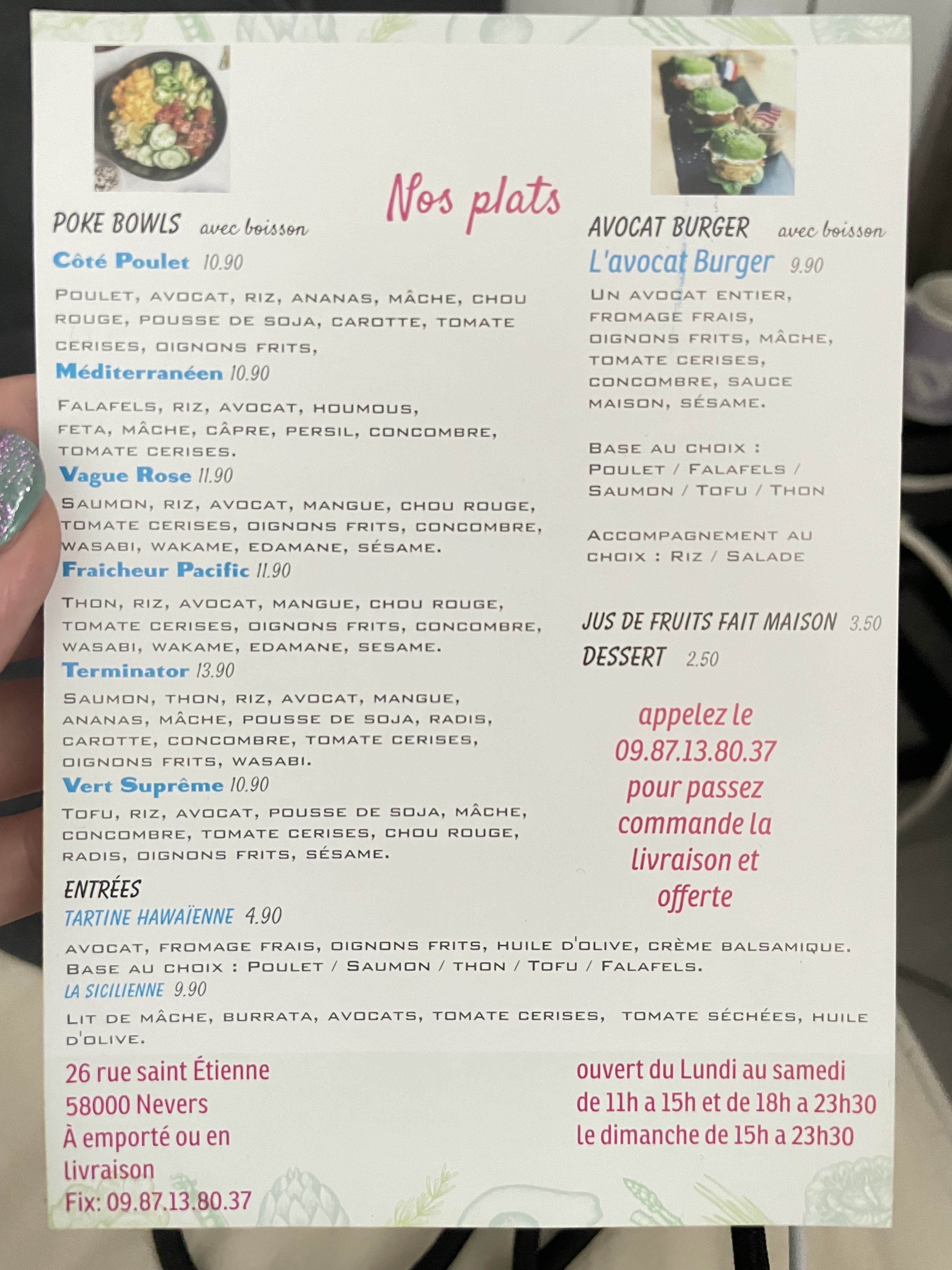 Très bonne adresse ! Les Poke bowls sont délicieux et extrêmement généreux. Les burgers avocat sont succulent mais beaucoup moins copieux. Service au top, on est toujours bien accueilli. Musique d'ambiance très agréable. À savoir que la livraison sur Nevers est gratuite donc ne passez pas par Uber eats ! Je recommande fortement.