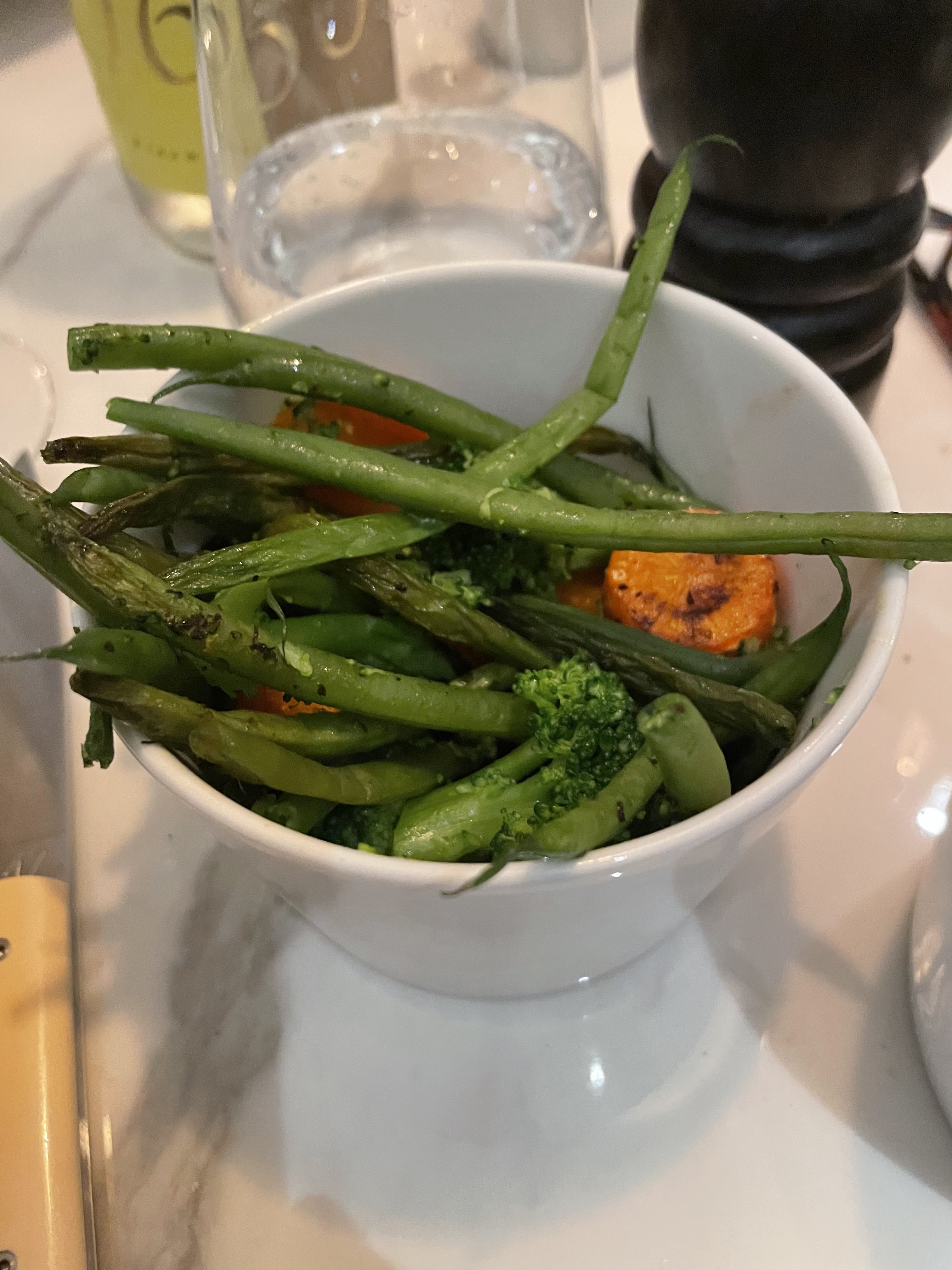 Entrecote de veau à peine cuite et à peine chaude,wok de Brocoli quasiment cru à la place d'une poélee de legumes annocée et impossible d'ajouter une cuillère de purée en garniture supplémentaire.C'est la première fois que ce restaurant habituellement bon me déçoit. J'espère que c'était juste une mauvaise expérience