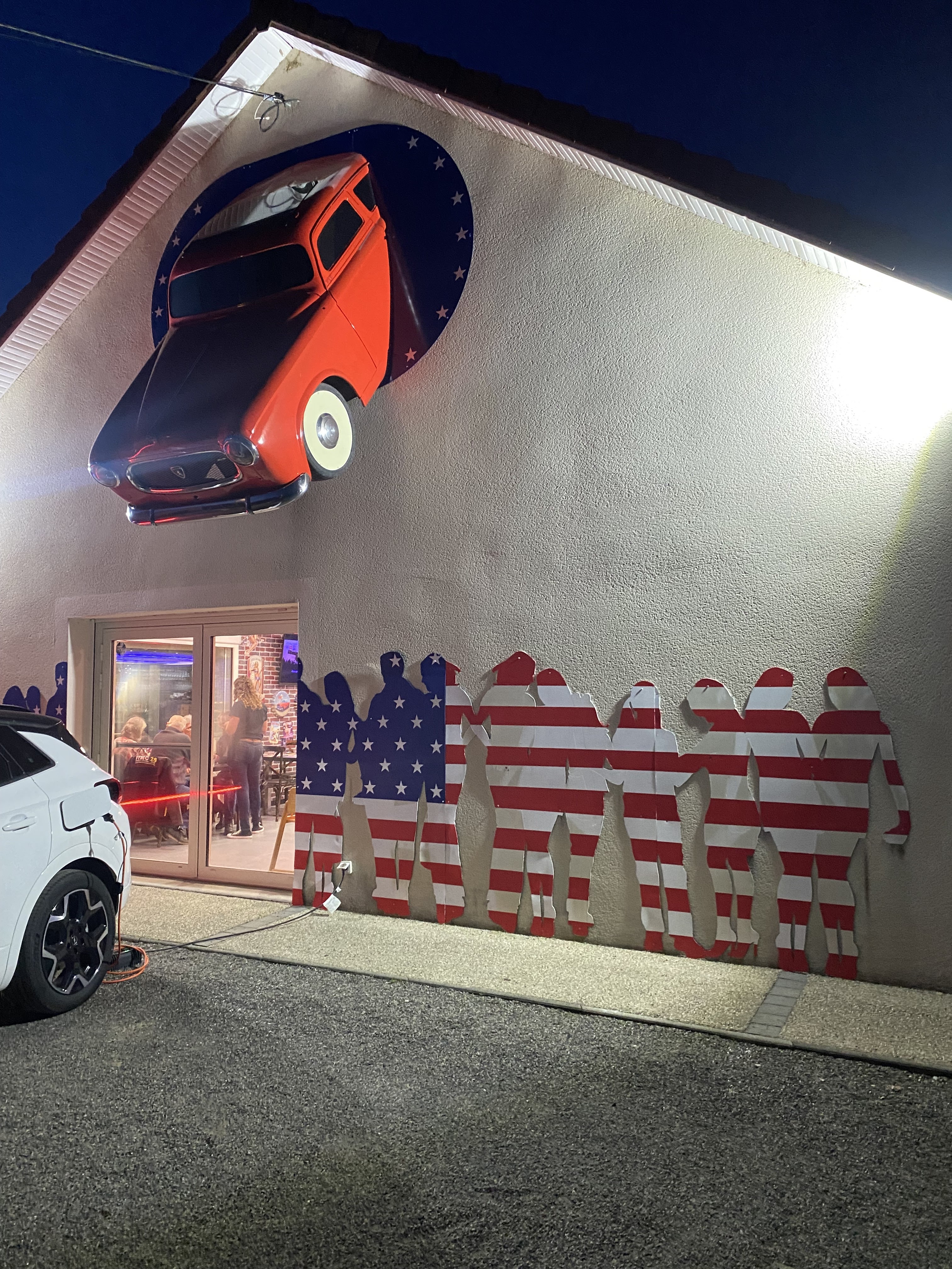 Juste magnifique decor americain. Véhicule incrusté dans la façade. Repas au top.