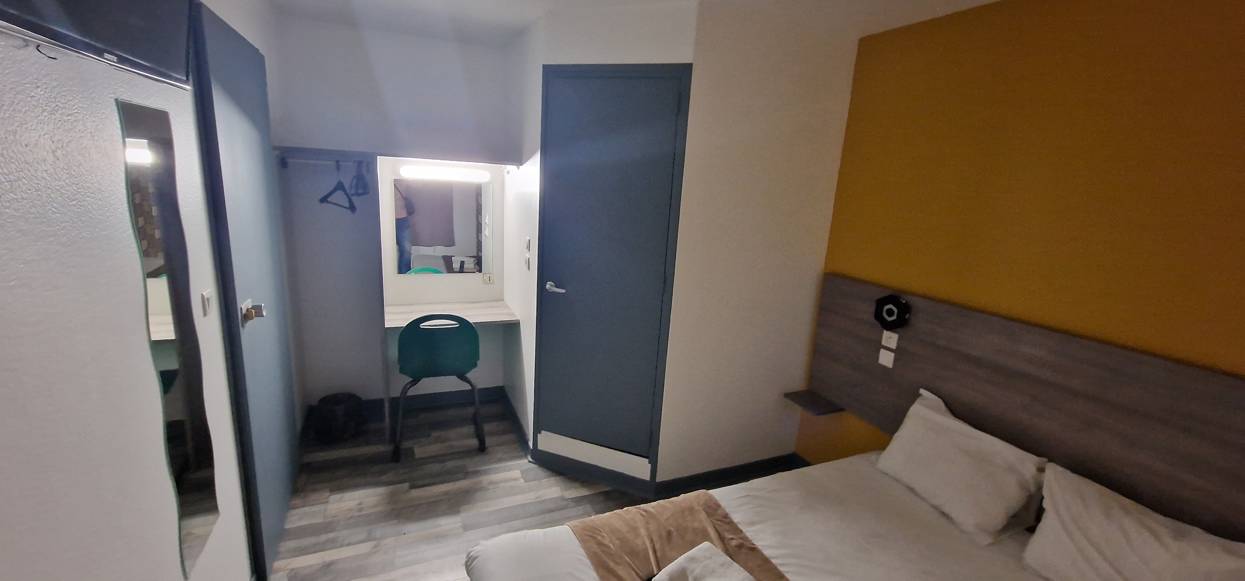 Accueil sympathique à l'arrivée La chambre était propre par contre le point négatif clairement c'est la salle de bain , minuscule , et en prenant une douche vous l'avez toute la salle de bain , il y avait un trou dans le lavabo , et les WC avaient une petite fuite quand on tirait la chasse d'eau il y avais de l'eau au sol (chambre 119) Mais pour 37 euros la nuit ça fait le job! Concernant la télé , il aurait été judicieux de la mettre plus bas car on se casse le cou si haut