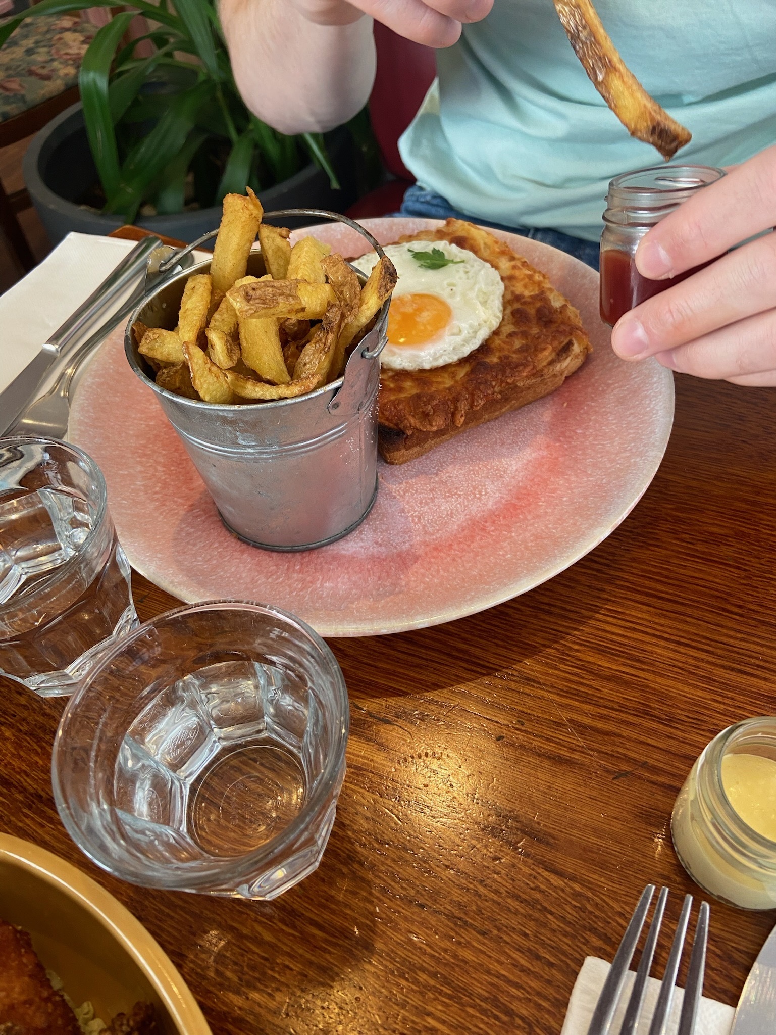 Bon café, croque madame avec des frites maison. Ambiance conviviale.