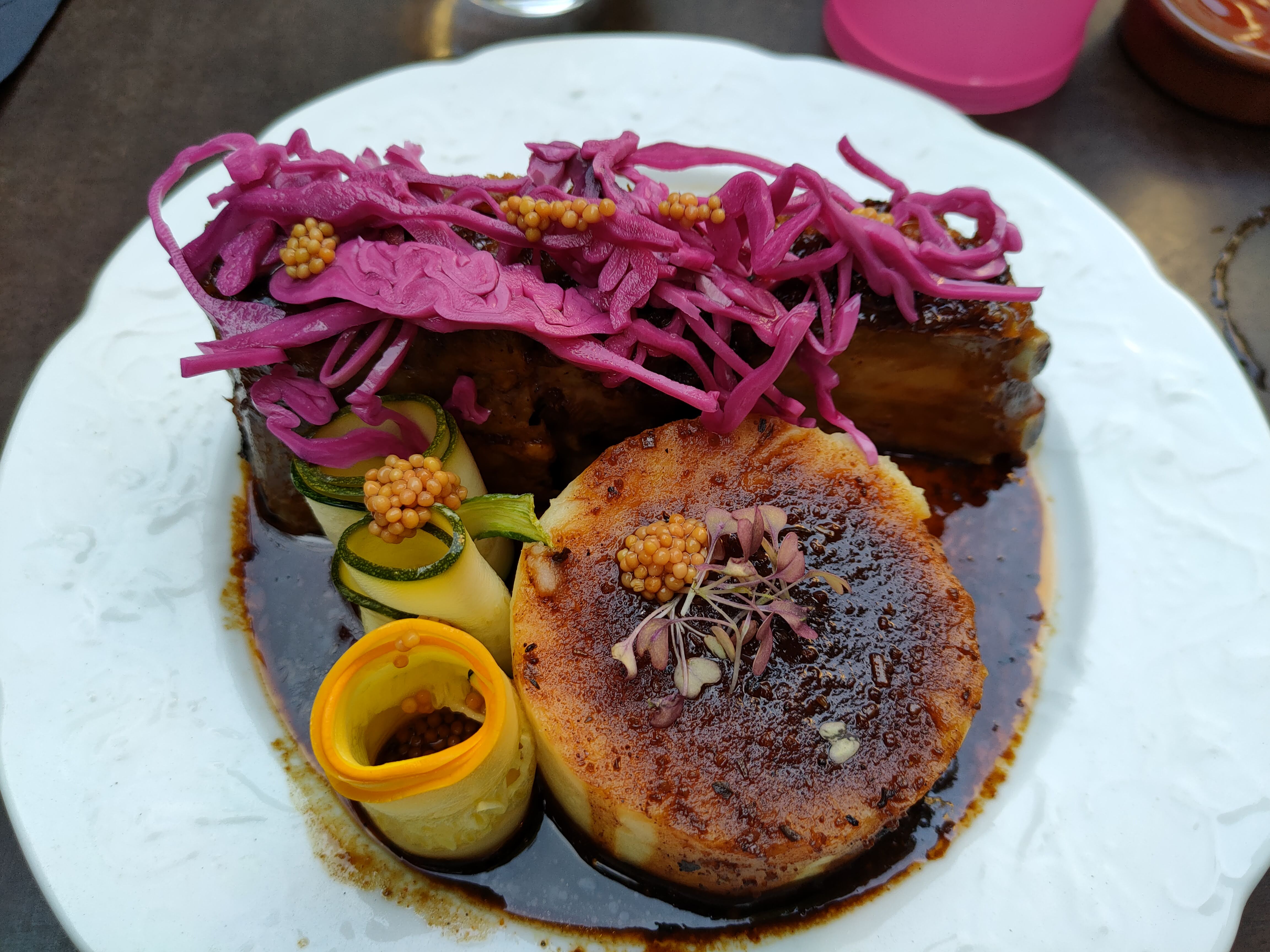 Déjeuner pour deux en terrasse (plat-dessert : veau mariné au miel et carpaccio de poire) cuisson du veau rosée ok, service bienveillant et efficace, bon timing. Une très bonne adresse.