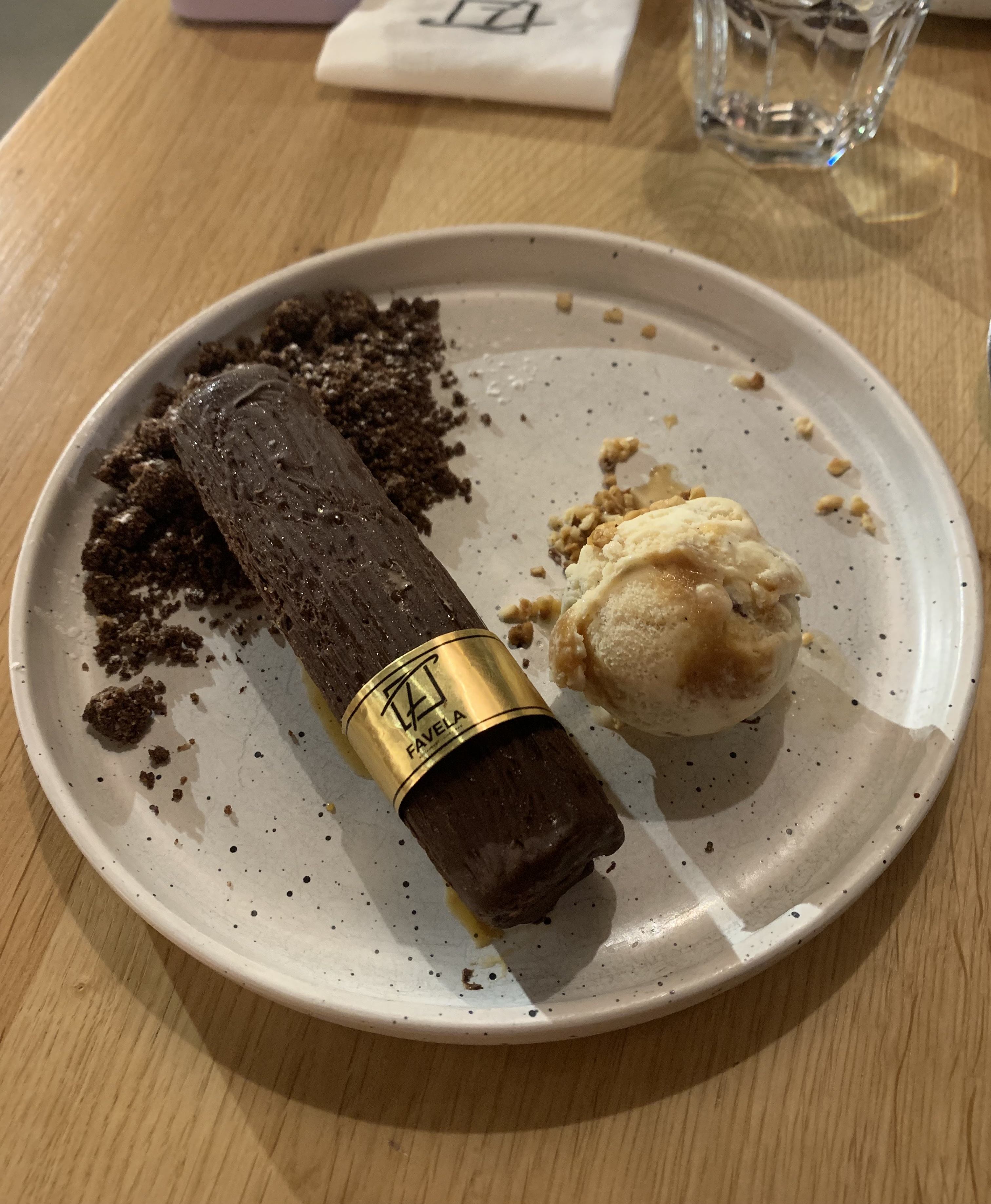 Favela est un restaurant sympathique, idéal pour les grandes tablées entre collègues. Le service a été impeccable de bout en bout et d'une efficacité redoutable. Le tartare est proposé en modèle à composer soit même de l'assaisonnement à la sauce. J'aime quand une proposition est faite sur le goût sinon c'est difficile d'évaluer la cuisine. Le cigare façon snikers en trompe l'oeil est particulièrement bon. Les croquants de biscuits chocolats qui l'accompagne sont en revanche très dispensables. 1€ de moins sans les croquants et c'est un sans faute 👍. En résumé, il n'y a aucune fulgurance mais on y passe un bon moment.