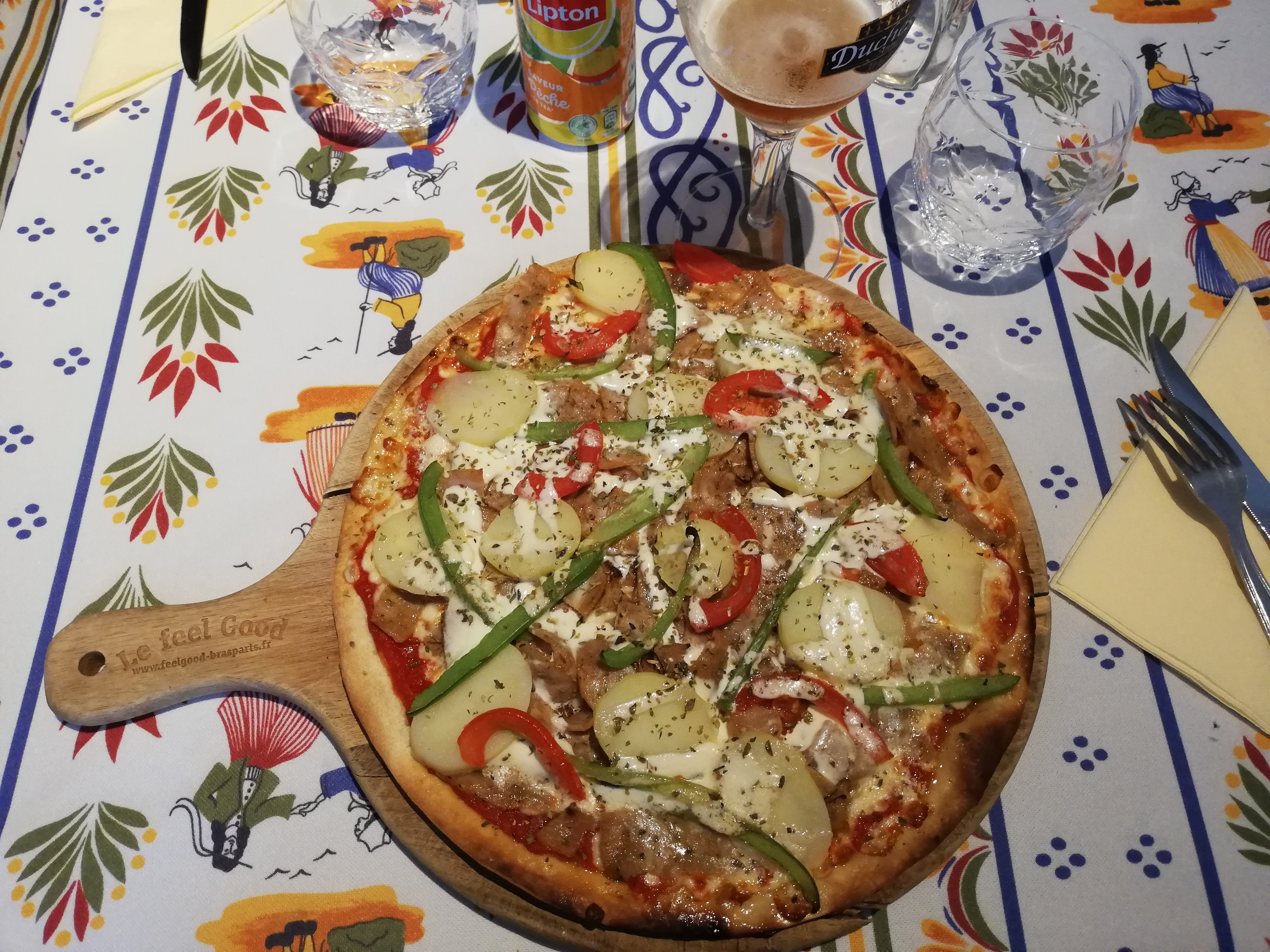 La planche apéro était très bonne. Mon conjoint a pris une pizza qui était bonne également mais la mienne (poulet, chorizo, poivrons, fromage) ne l’était pas. Pourtant j’ai l’habitude de manger des pizzas au poulet je n’ai jamais eu de soucis. La pâte était cependant bonne mais le poulet avait une texture étrange, était servi froid dessus et inmangeable.. j’ai été malade directement en sortant du restaurant.. donc je déconseille.