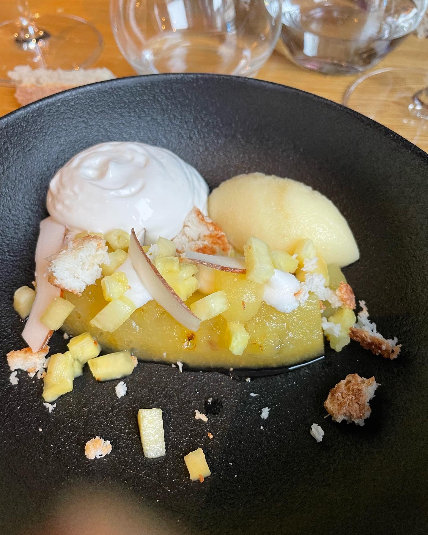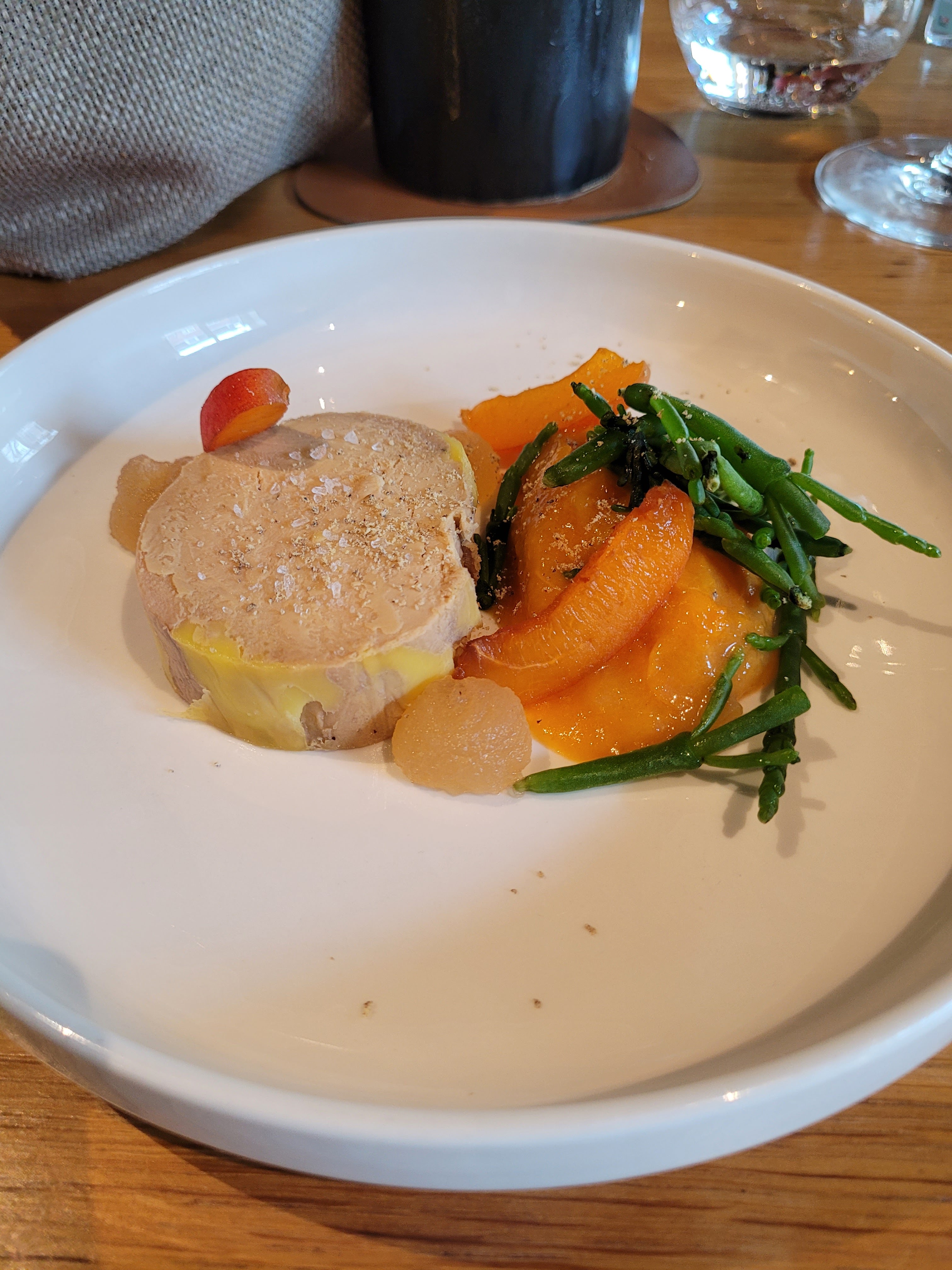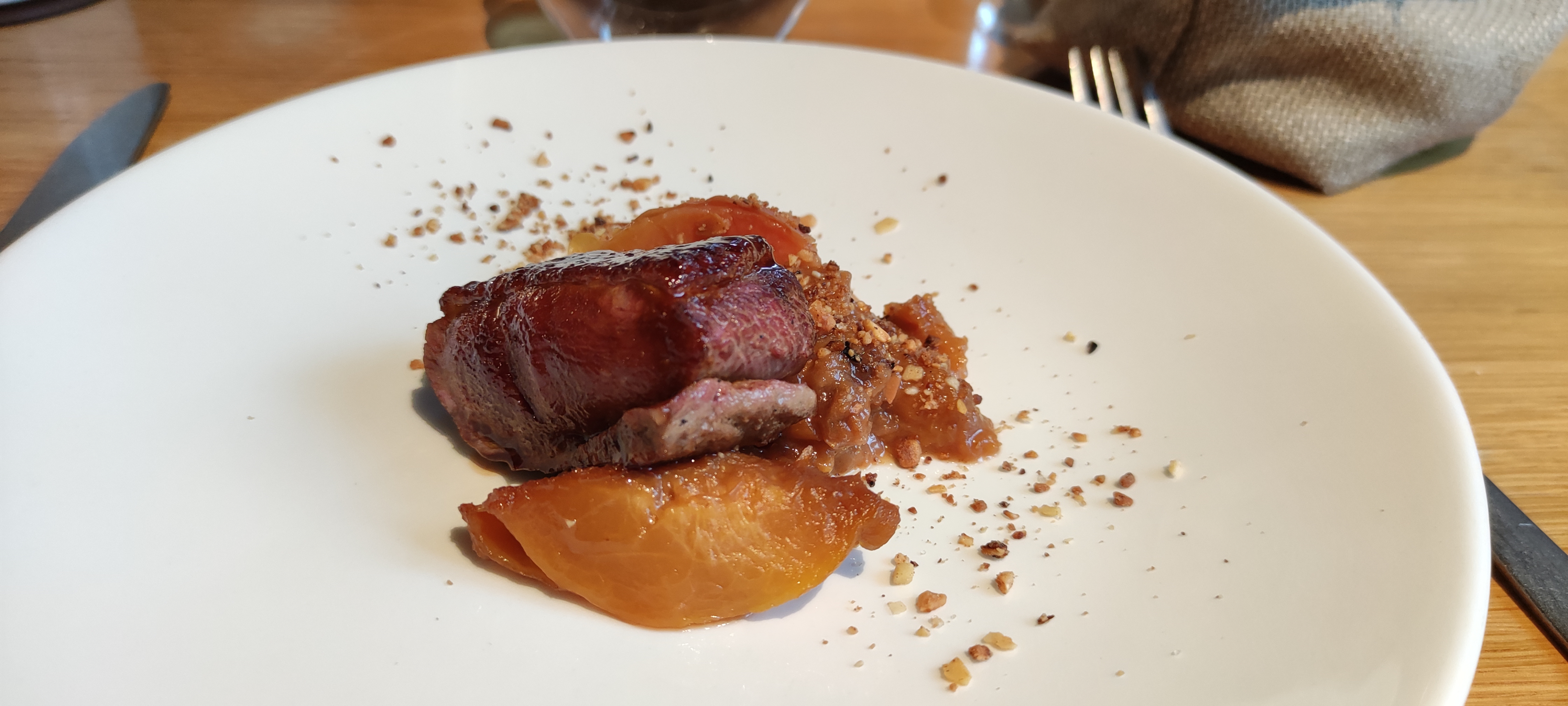 Un peu déçue Les apéritifs arrivent 20 mins après la mise en bouche. Le dessert croustillant mirabelle n'a pas les saveurs attendus Par contre le dessert poivron/ citron avec l accord pétillant pêche est judicieux Le service est agréable mais les tables trop proches les unes des autres placées à l entrée du restaurant