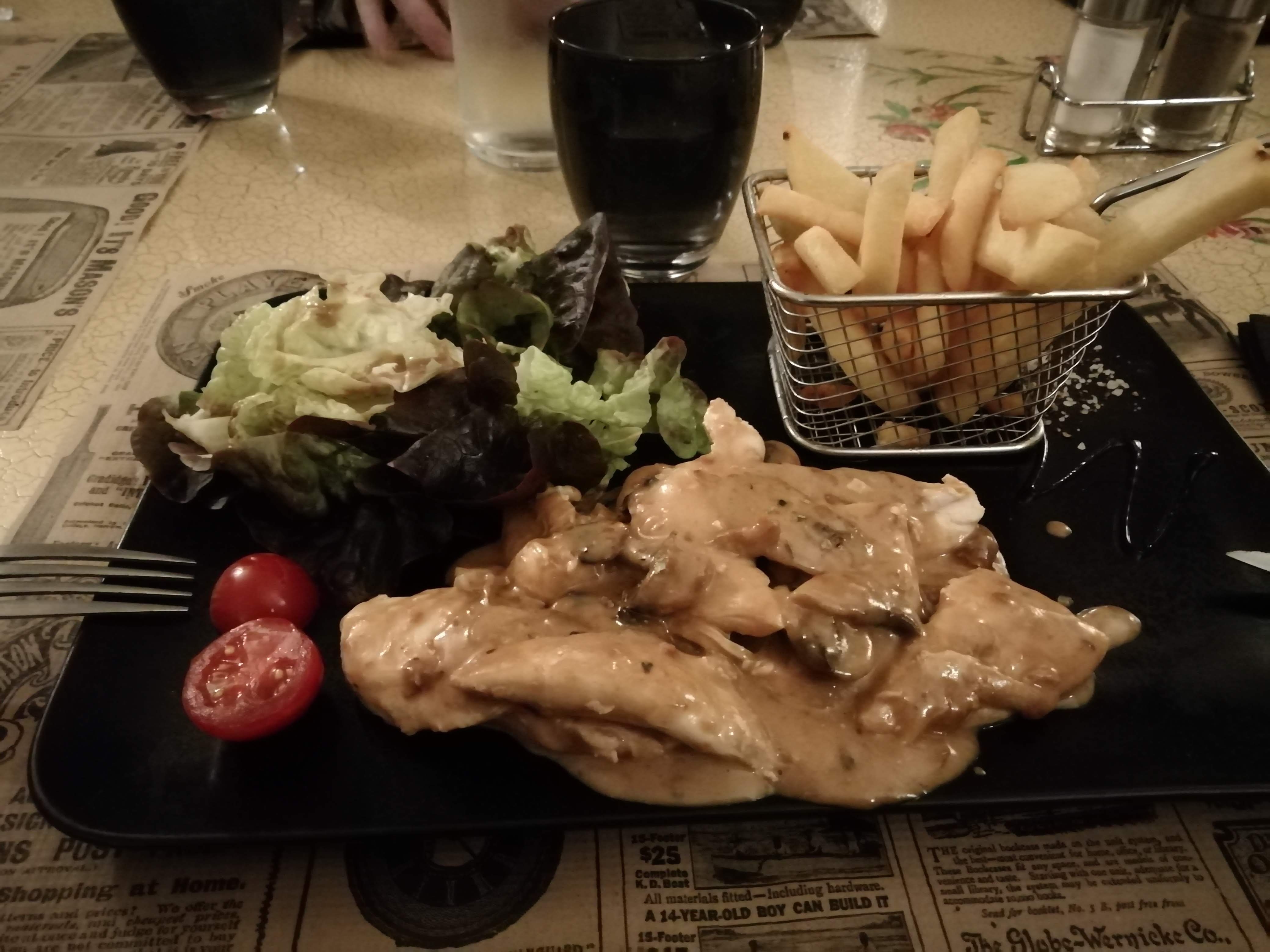 Trop cher pour du blanc de poulet à la creme avec des frites congelées 13,90 dessert trop cher aussi Verre de pinot gris excellent Pas