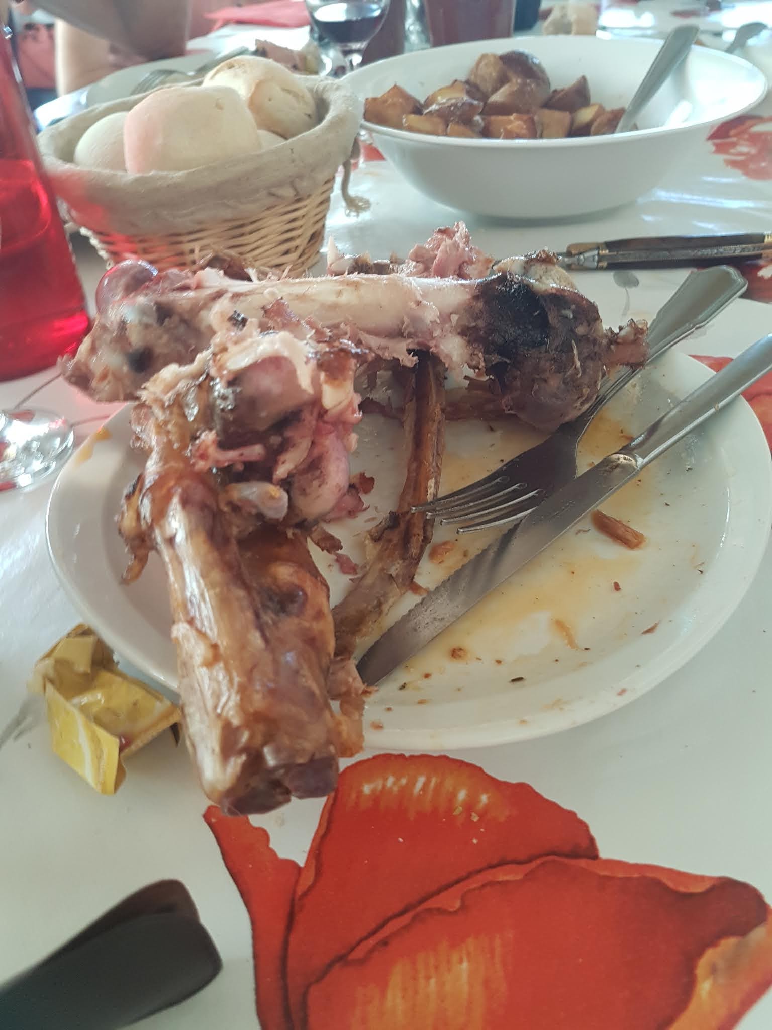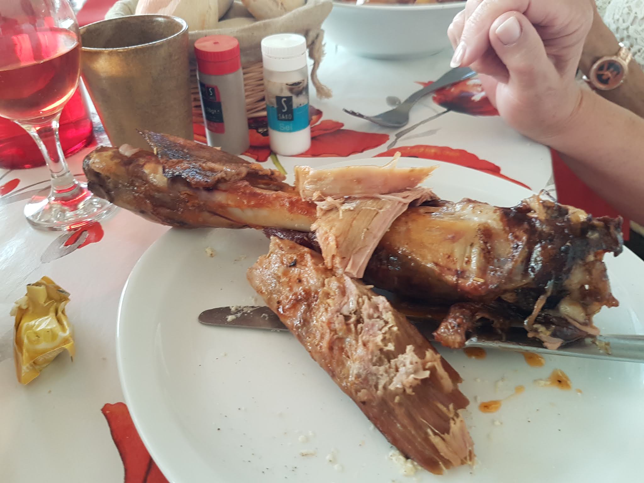 Bons produits servis à table et copieux le cochon à la broche avec ses pommes de terre un pur délice à refaire