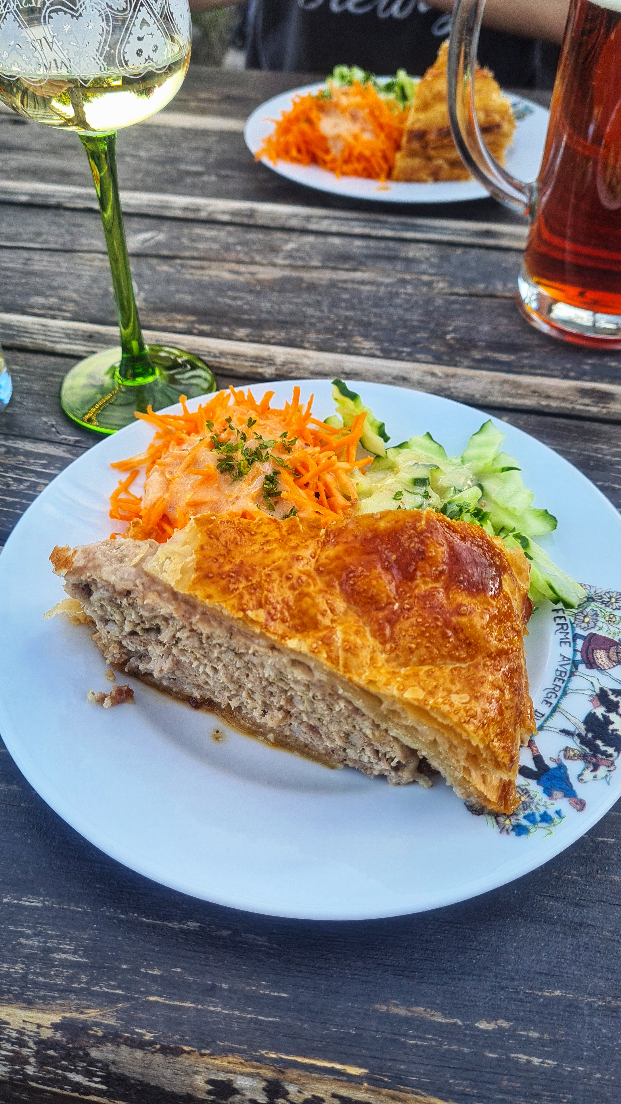 On a pu goûter la tourte avec les crudités ainsi que la tarte à la quetsche à la chantilly avec un café.. tout était excellent, un service plus que rapide, des serveurs au top, une décoration super rustique et chaleureuse et le cadre extérieur est magnifique! Je recommande fortement cet endroit, c’est comme à la maison! Merci pour cette expérience
