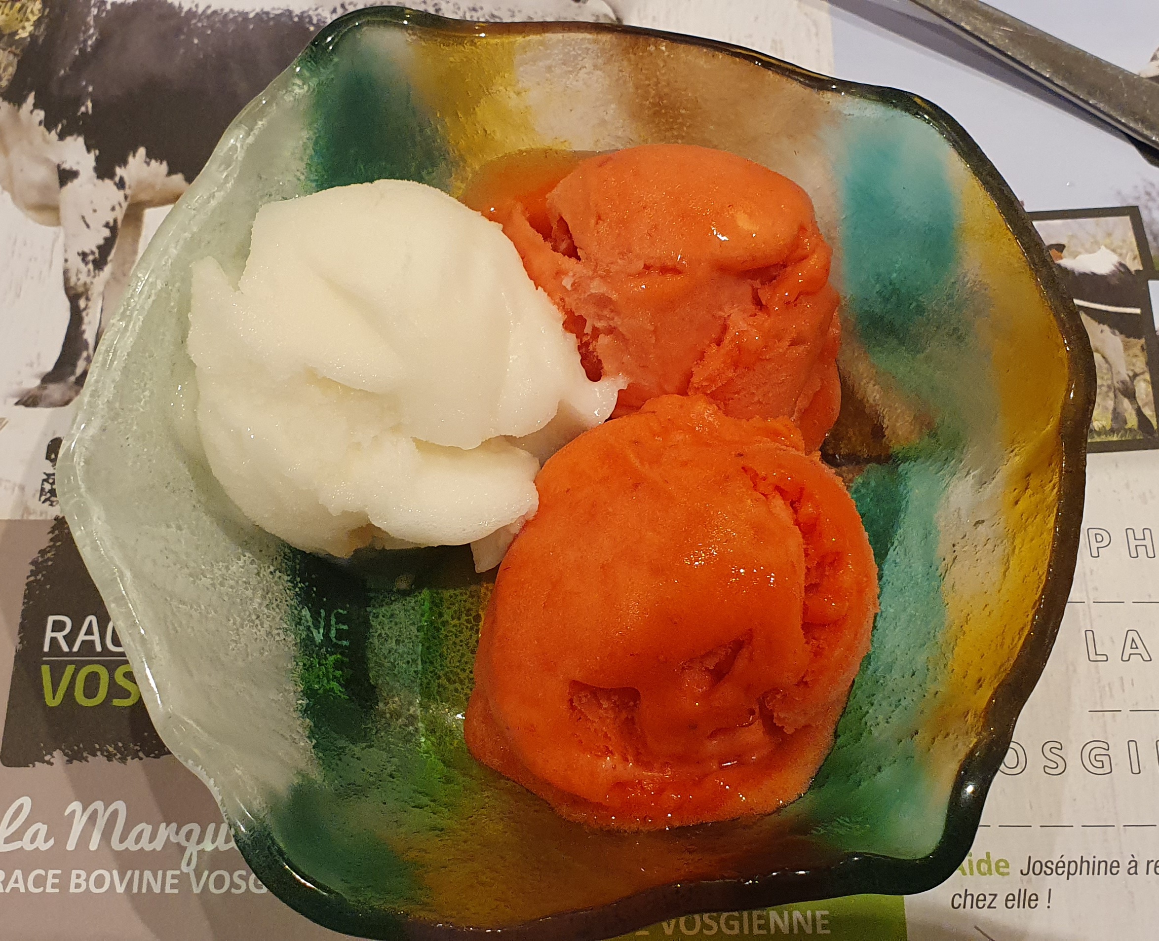 Sorbets-maison framboise et citron à tomber !!! Quant à la tarte-maison aux myrtilles, elle était parfaite sauf pour les fruits pas assez mûres (mais avec ce mois de juillet pluvieux, pas étonnant !), cependant j'ai pris ça comme un signe de qualité car je préfère cela plutôt que du sucre rajouté artificiellement au fruit (il n'y a qu'un soupçon de sucre glace sur le dessus). Pour le cadre : vue extraordinaire vers les Vosges moyennes, le Climont à 5 km et sa forme trapézoïdale reconnaissable entre mille, les éoliennes de Saales au loin, à 10 km, assis en terrasse sur 3 grandes tables à bancs, à coté d'un magnifique bosquet de fleurs, d'une fontaine traditionnelle en grès, au calme de 2 chemins de randonnées. Incroyable petite ferme typique de montagne aux minuscules fenêtres si mignonnes ! Attention : réservation obligatoire, et attente de service parfois conséquente (du moins au moment où j'y étais car nous étions très nombreux) mais le cadre se prête à la détente et à prendre enfin son temps.. Je conseille très vivement cet incontournable de la vallée de la Bruche !