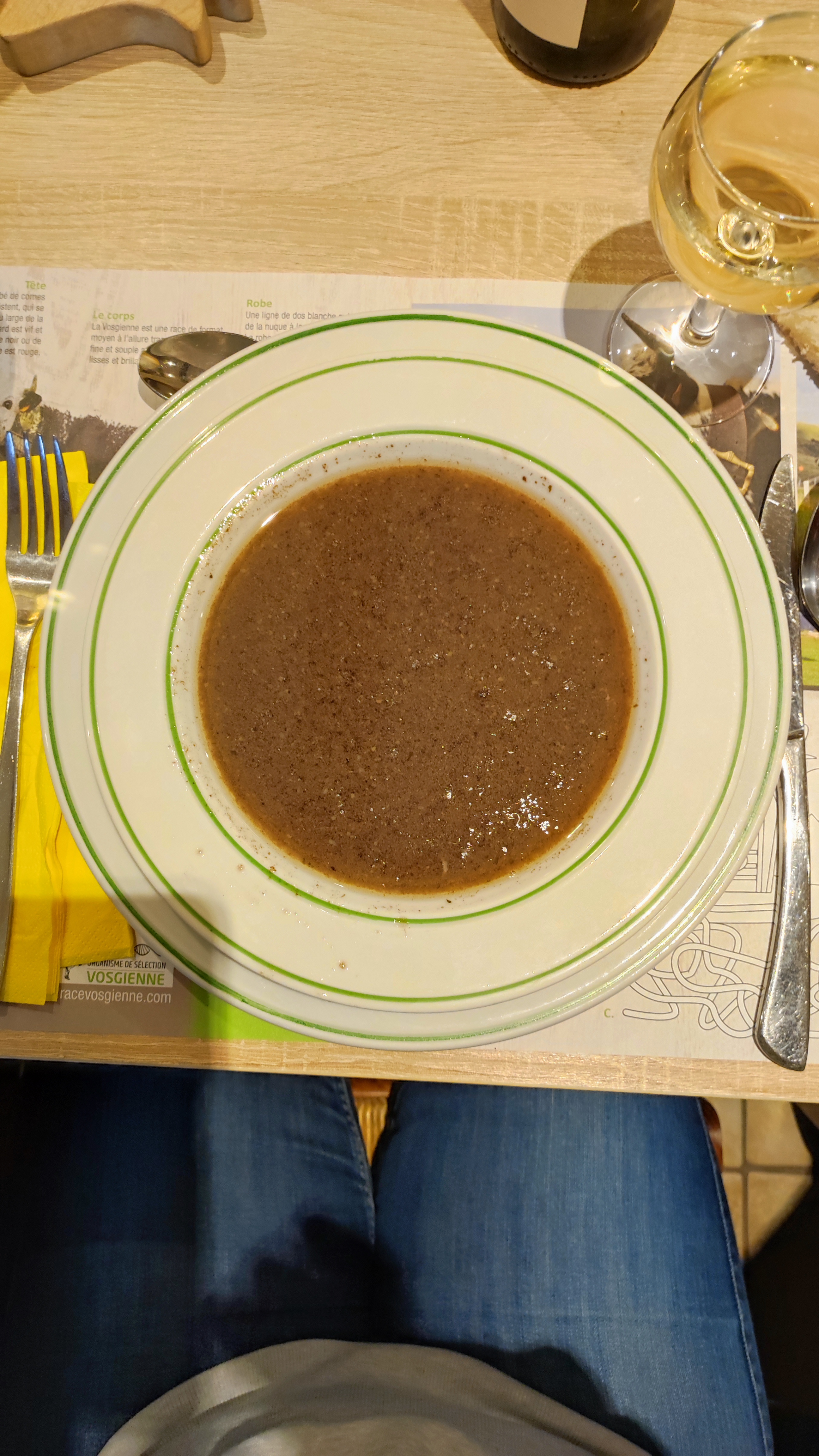 Ambiance familiale : les tables sont réparties dans 2 pièces d'une ferme vosgienne ; le paysage est de toute beauté au sommet d'une colline. On y accède par une toute petite route. Le service est agréable, toujours aimable. Le repas repose sur un seul menu (entrée plus plat, dessert au choix), copieux, avec beaucoup de salades diverses en accompagnement. Notre coup de coeur : la viande en sauce, d'une tendreté... ! et la sauce à tomber, j'ai pris du pain pour saucer le reste ! Mais je n'oublie pas la tourte en entrée et la tarte aux myrtilles au dessert : une vraie cuisine de grand-mère, réconfortante et régressive, comme on n'en trouve plus. A la table voisine ils s'extasiaient sur la crème chantilly maison comme on n'en fait plus... Tout vient de la ferme aux assiettes, y compris de savoureuses confitures à acheter selon l'envie. Bref, une pépite tant pour la qualité que pour le prix très raisonnable (attention, réserver longtemps à l'avance, il n'y a que 30 places maxi !)