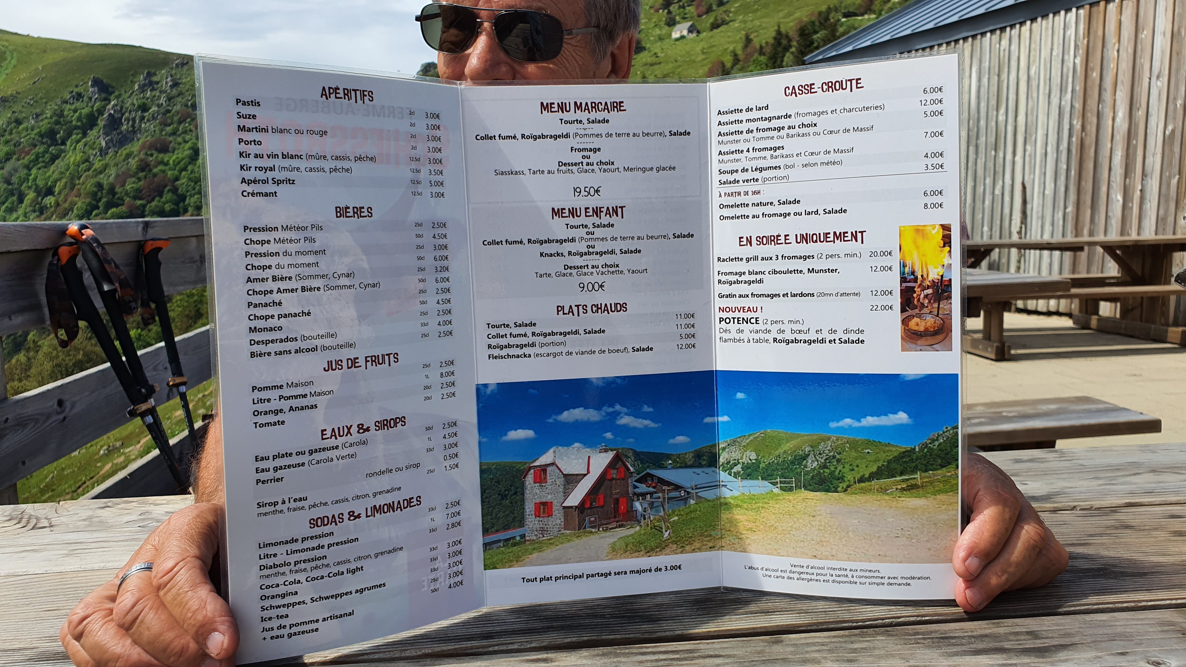 Après une très belle promenade aux environs, un repas roboratif de spécialités locales (Fleischnacka, assiette de charcuterie, une généreuse tarte aux myrtilles... et le Siasskass : fromage de Münster frais arrosé de Kirsch, Hmmmmm!). Arrivés tardivement, nous avons été parfaitement accueillis dans une salle lumineuse avec vue sur les magnifiques paysages avoisinants. Nous recommandons !