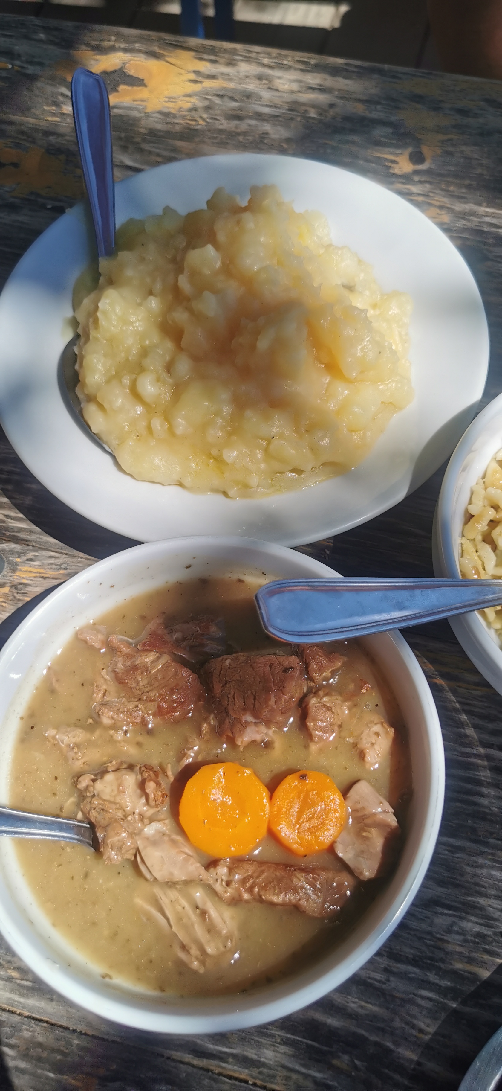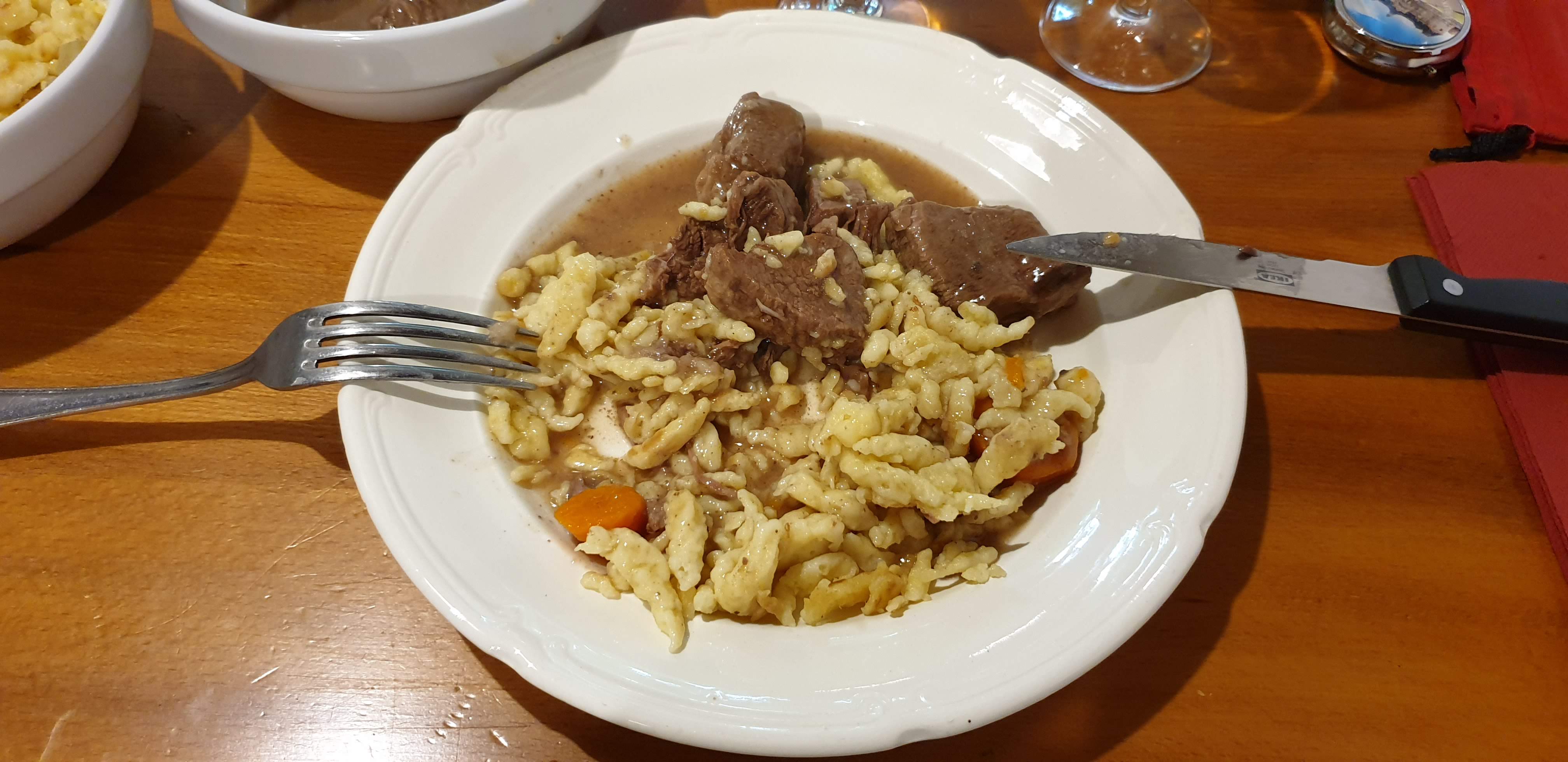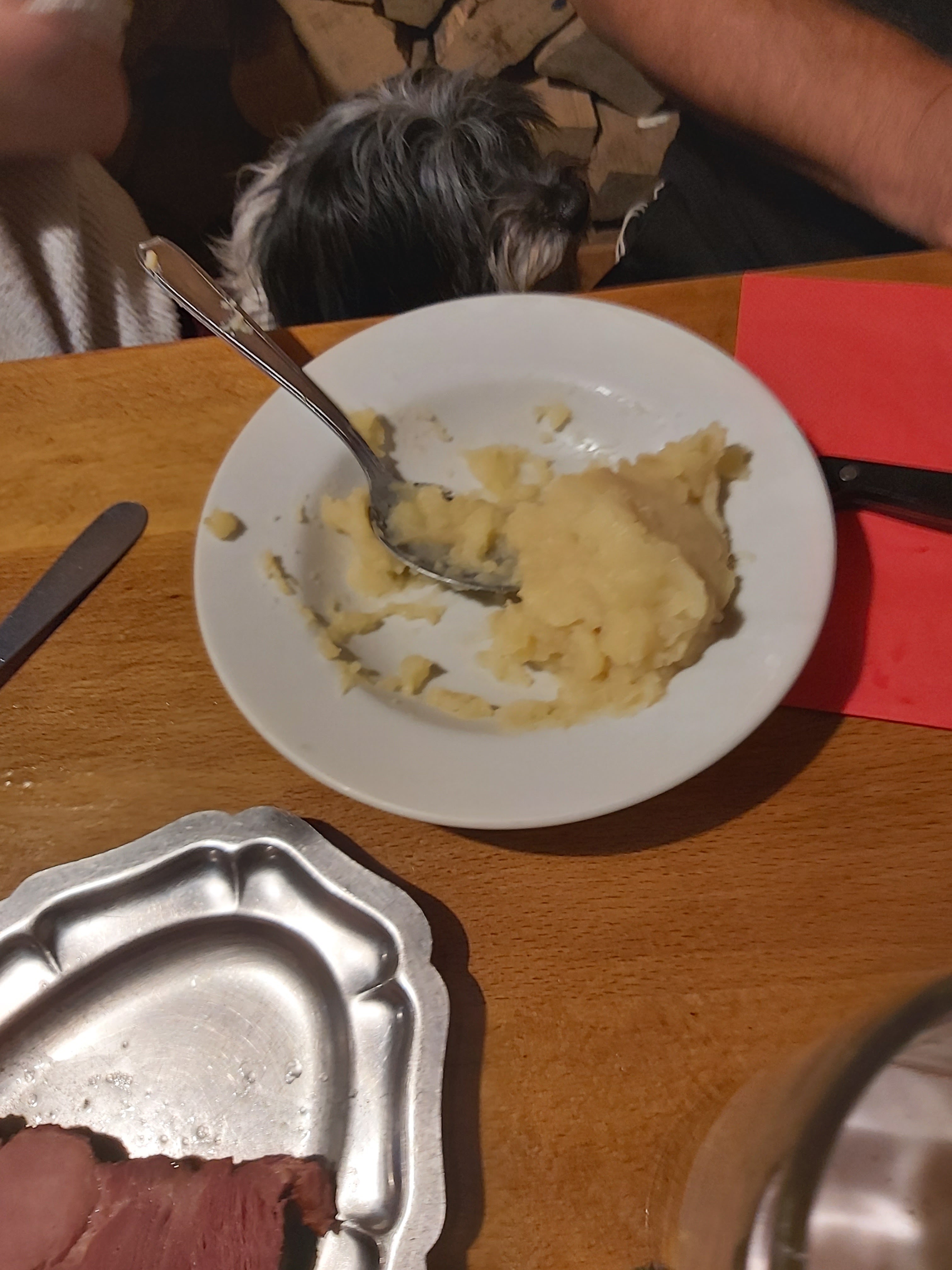 Menu un peu cher pommes de terre en purée moins bien qu’avant et pâtes alsaciennes pas bonnes dommage bonne ambiance ; service bien