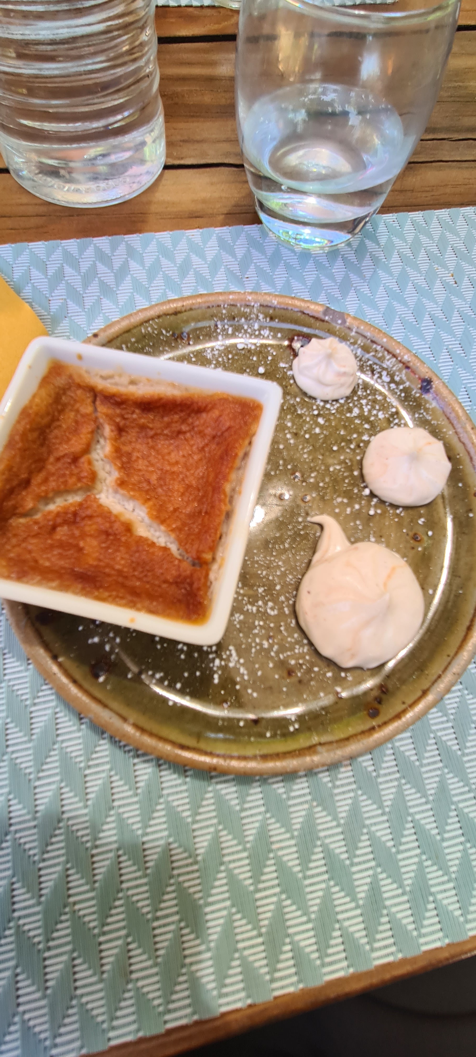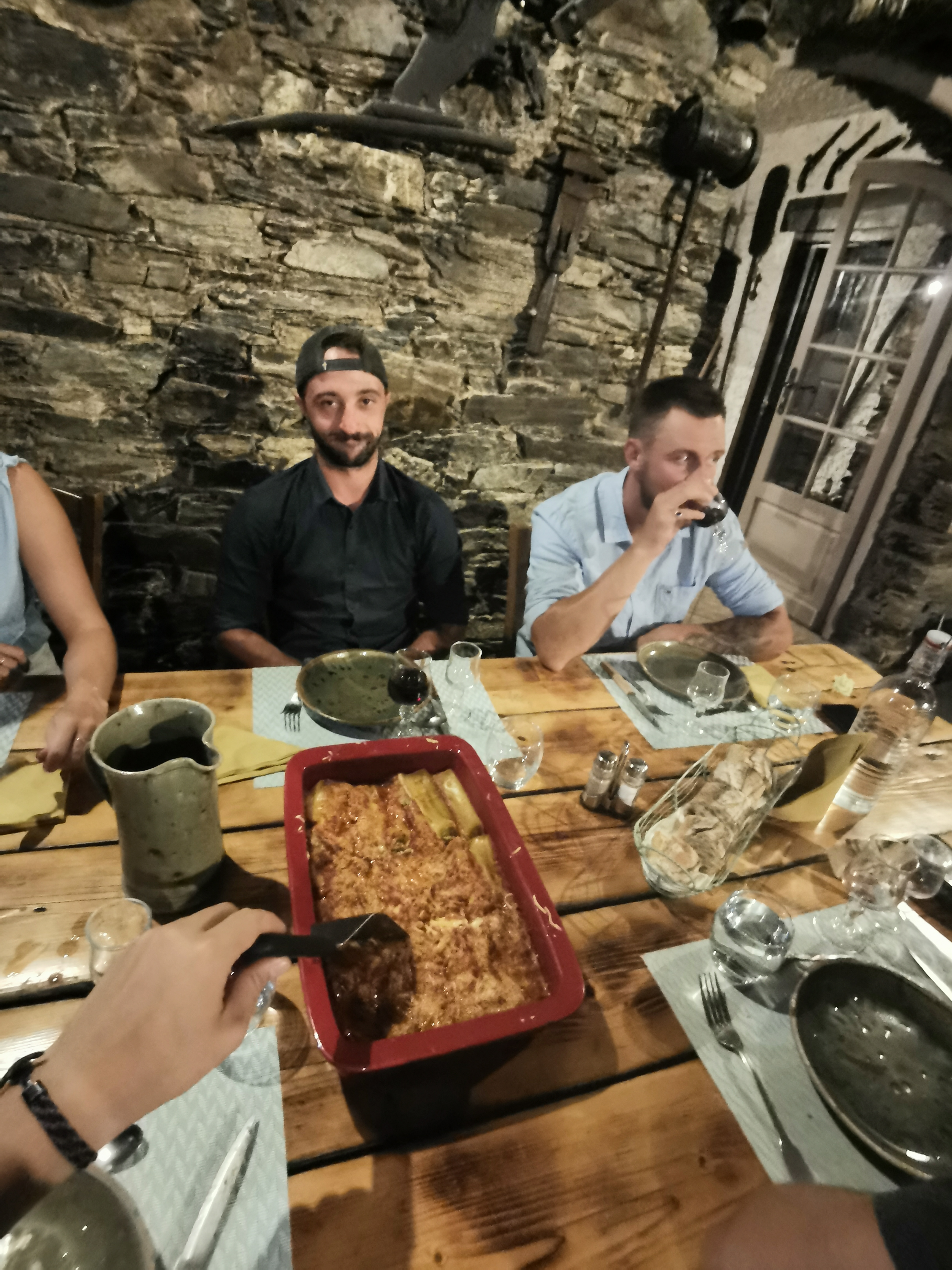Un moment de joie autour d'un repas, cuisine Corse traditionnelle : la soupe avec beaucoup de légumes coupés en petits morceaux et non mixée, une peu de charcuterie, puis une sorte de beignet aux courgettes, puis des cannelloni au bruccio. Le tout accompagné d'un apéritif, une carafe de vin, entre les plats, un marc de raisin. Merci à vous pour l'accueil et la bonne chère dont nous nous sommes régalés !