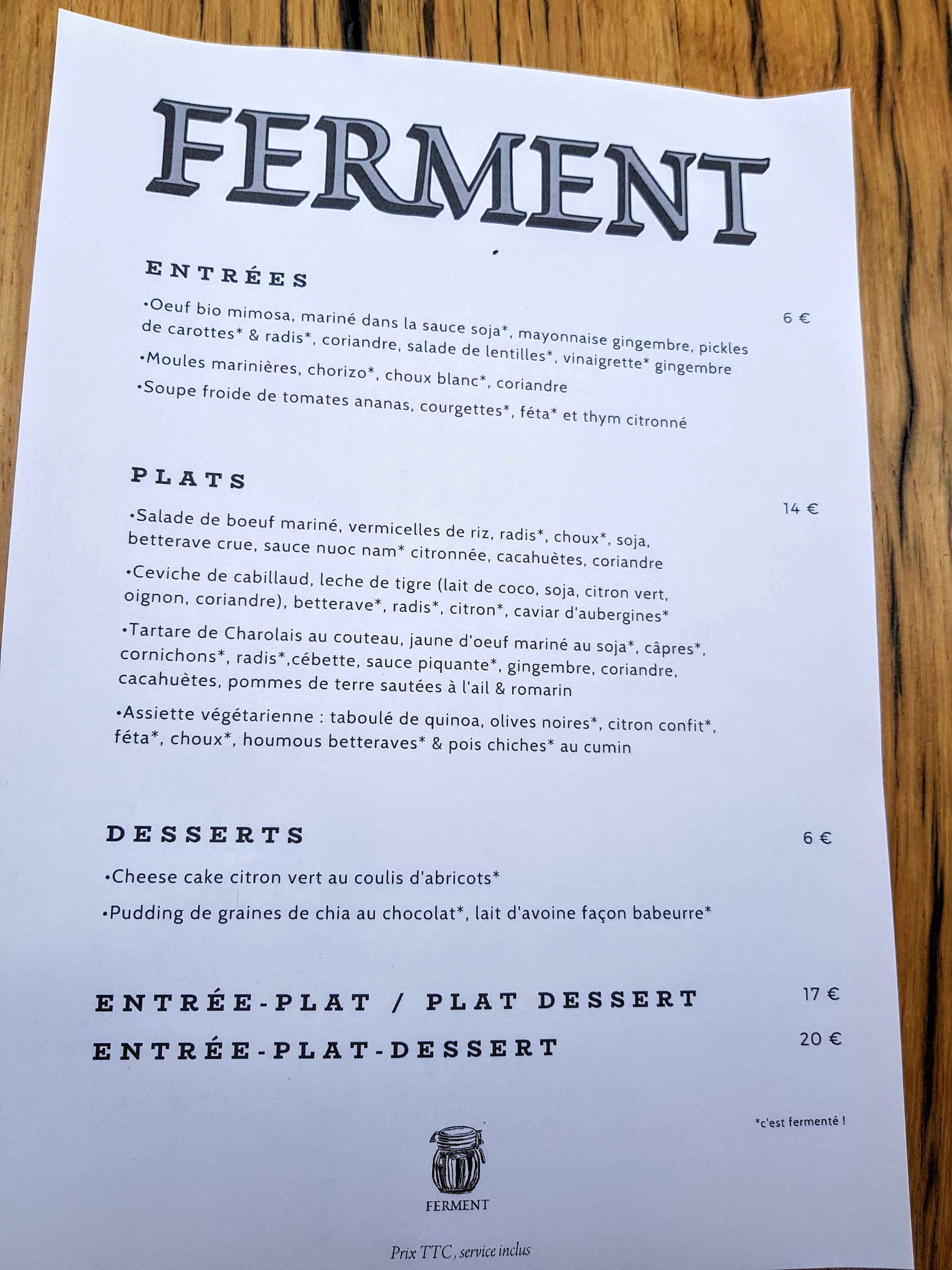 Très bon moment dans ce petit bistrot de quartier mettant en avant des aliments fermentés ! Equipe chaleureuse, rapide et efficace Très belle ambiance Bons plats au gré des saisons Je recommande, et pensez à réserver PS : les boulettes de Charolais étaient légèrement trop cuites à mon goût.