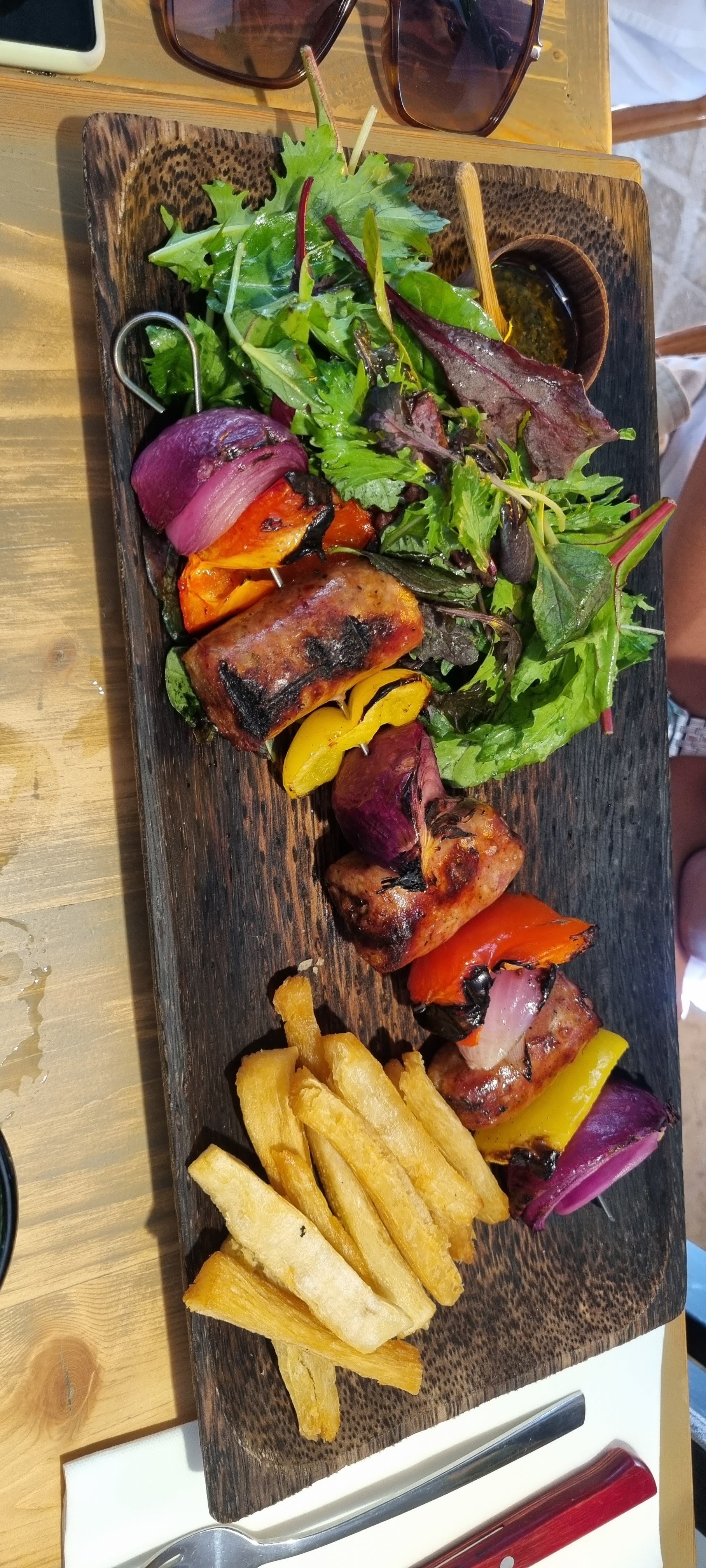La nourriture est plutôt bonne. Malheureusement, les couteaux (lames de rasoir) n'étaient pas lavés correctement... donc il y avait beaucoup de sable dedans. Les tomates séchées pour le poulpe n'étaient parfois pas très bien nettoyées. Le service en lui-même était sympa mais très oublieux, une bouteille d'eau devait être commandée 4 fois avant son arrivée. Mais le hamburger était très bien fait (en fait comme commandé).