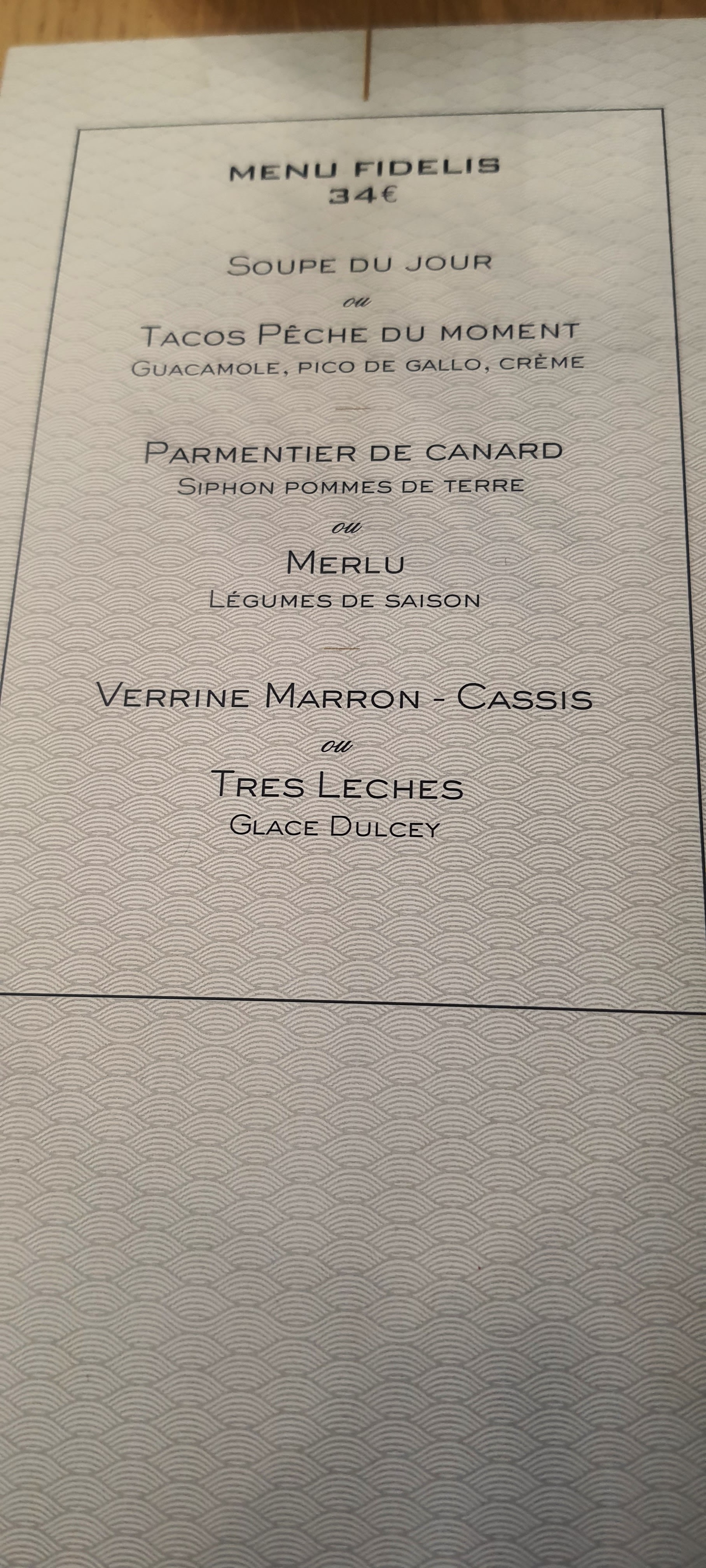 Superbe expérience ! Très bon accueil, serveurs attentionnés et de bons conseils. Menu Fidelis à 32€ Tacos poisson du jour, un délice. Merlu, un peur bonheur Dessert pavlova, une merveille Je recommande vivement, il n'y a eu aucune fausse note, ce qui est rare.