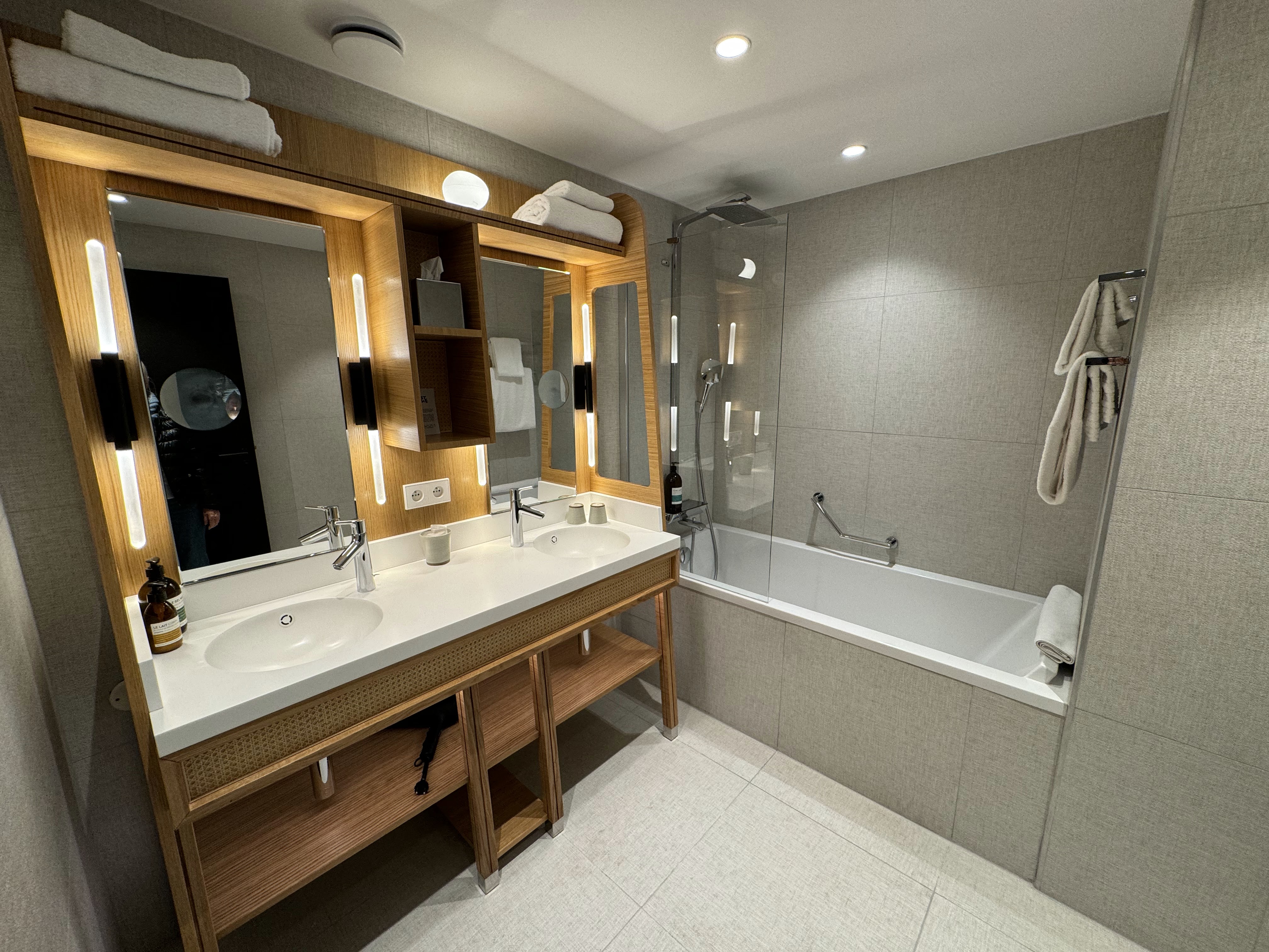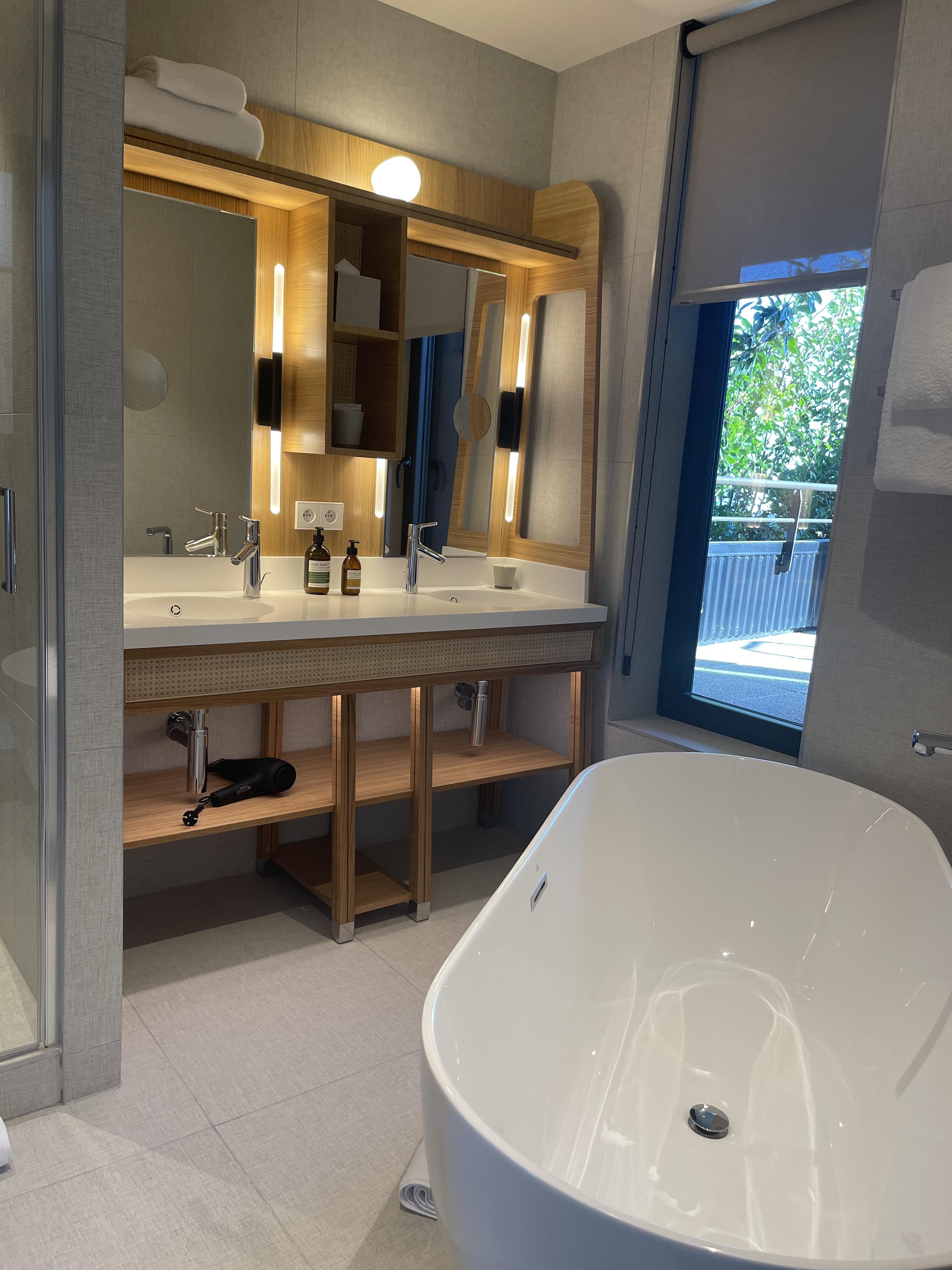 Ce nouvel hôtel ajouté à Hyatt n'était ouvert que 30 jours avant mon arrivée. Il est indiqué comme catégorie 5, mais je vois un chemin vers la catégorie 6. Le personnel professionnel, courtois et serviable a rendu mon personnel inoubliable !! L'enregistrement n'était pas traditionnel derrière un comptoir, mais juste à côté de vous, comme s'ils vous accueillaient dans votre séjour sanctuaire. De superbes informations sur la ville, y compris les principales attractions, les sites et, mieux encore, un code QR qui recommande une variété de choses à faire, des endroits où manger, etc. C'était merveilleux pour moi puisque Bordeaux était une décision de dernière minute. La chambre était confortable, avec une literie luxueuse, des oreillers, une baignoire et une douche entièrement séparées et un patio avec vue sur la ville, une table de chaises longues et un sauna en forme de tonneau de vin. De toute évidence, ce fut un séjour agréable. Le petit-déjeuner offrait d'excellentes options, j'ai choisi une omelette végétarienne, une crêpe, une friandise au chocolat, du café et du jus d'orange. Délicieux. Je recommande vivement FirstName Bordeaux et la suite collector.