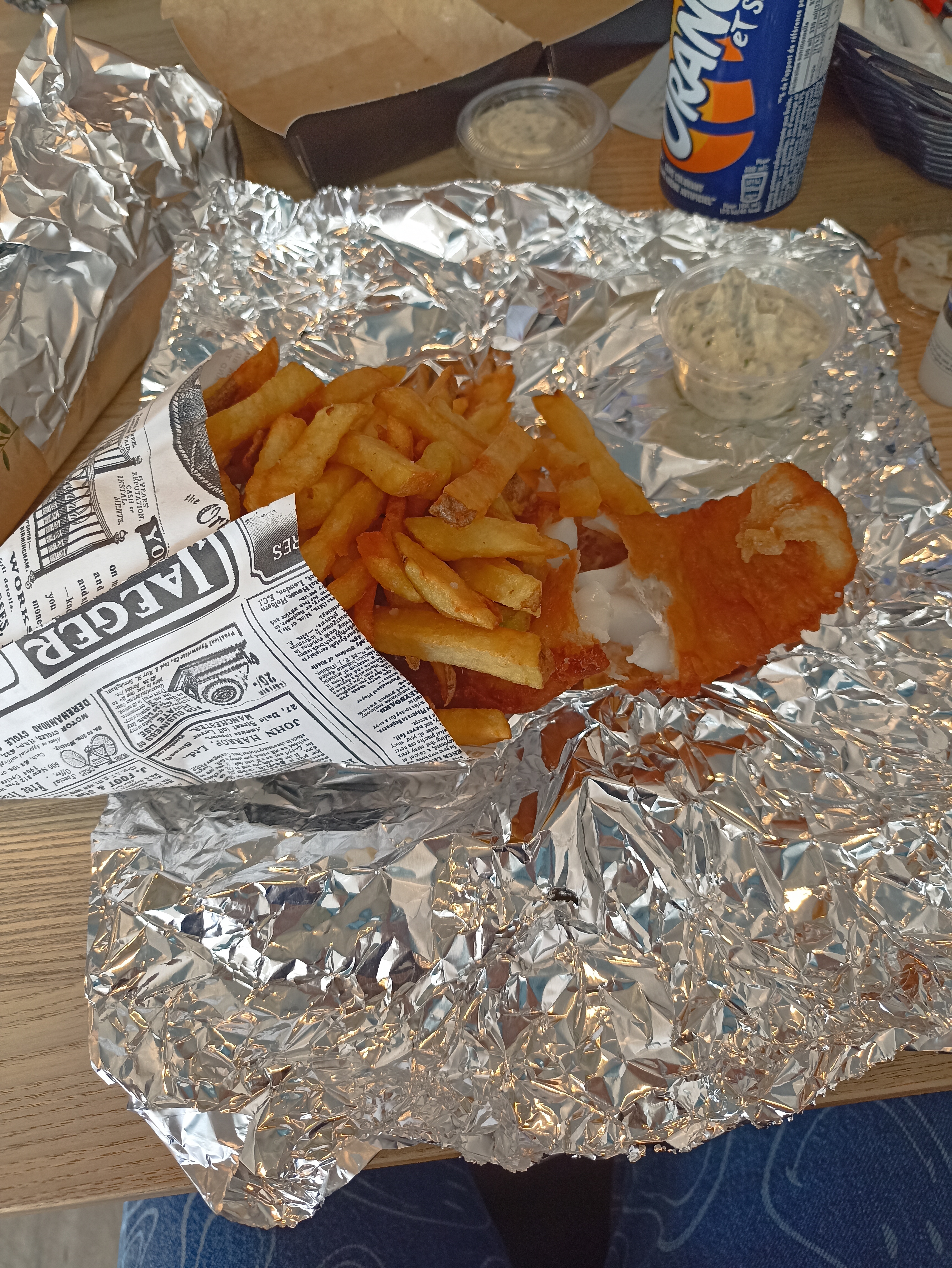 Fish and ships a emporter, arrivée en bord de mer, frite pas salée et trop de petite frite dure (genre fond de friteuse) pas de sauce, pas de citron, poisson pas de goût. Bref seul le coca était bon.