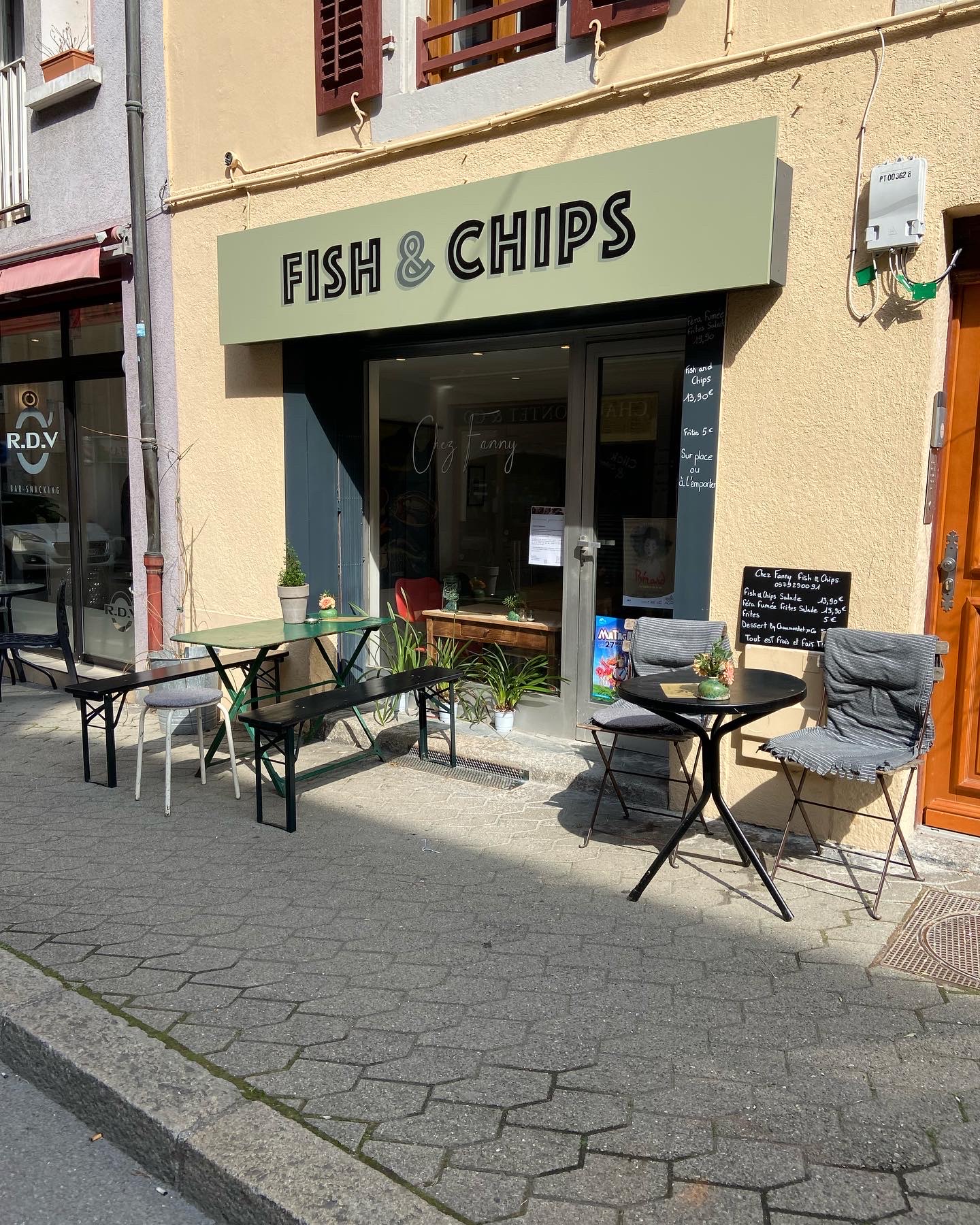 Un petit lieu coince entre deux. Chez fanny est un joli petit endroit où manger. J'étais pressé par le temps, mais je ne regrette pas de l'être arrêté là. Service rapide et souriant, un très bon plat de fish and chips avec une belle petite sauce curry. Je recommande !