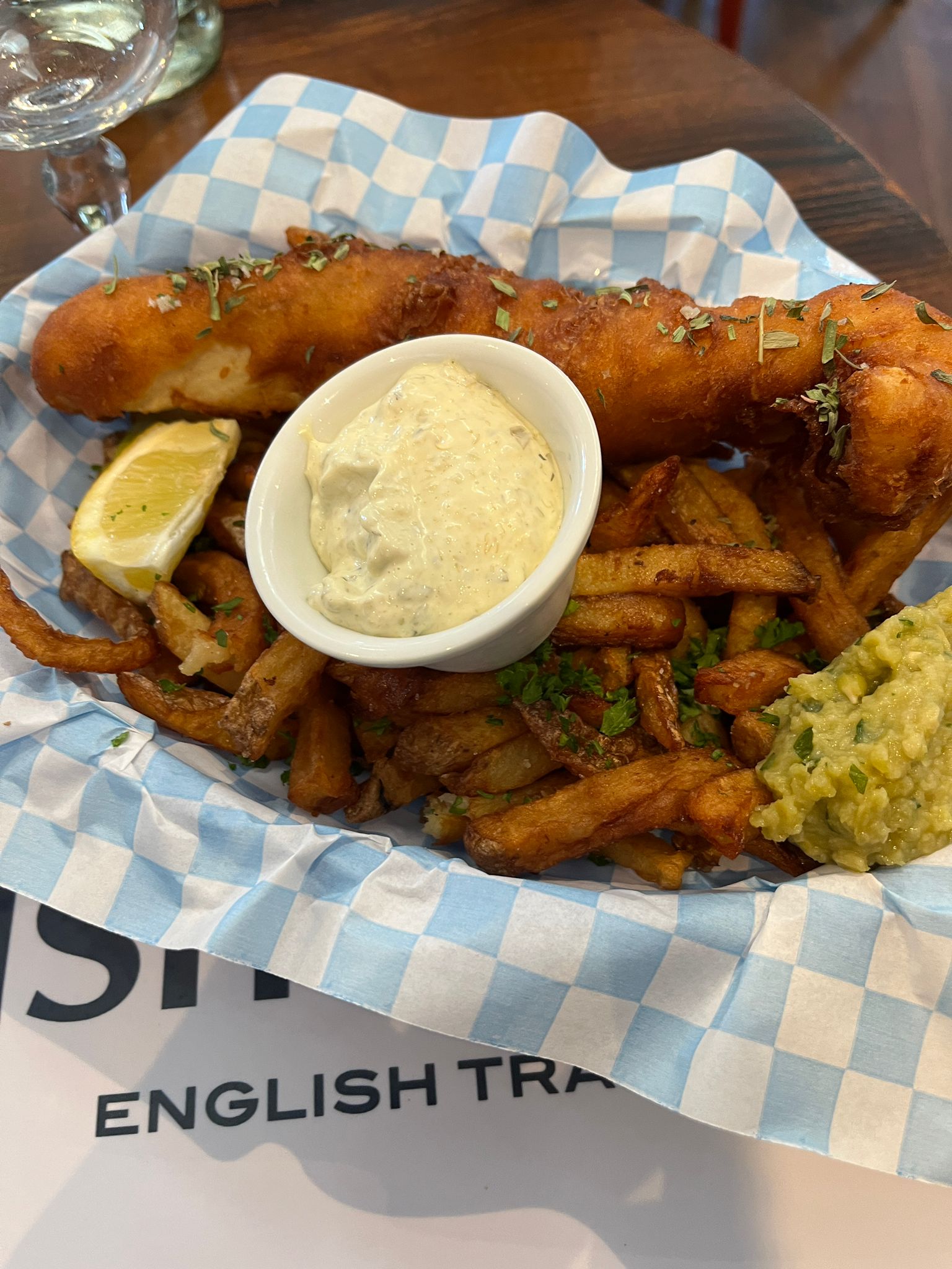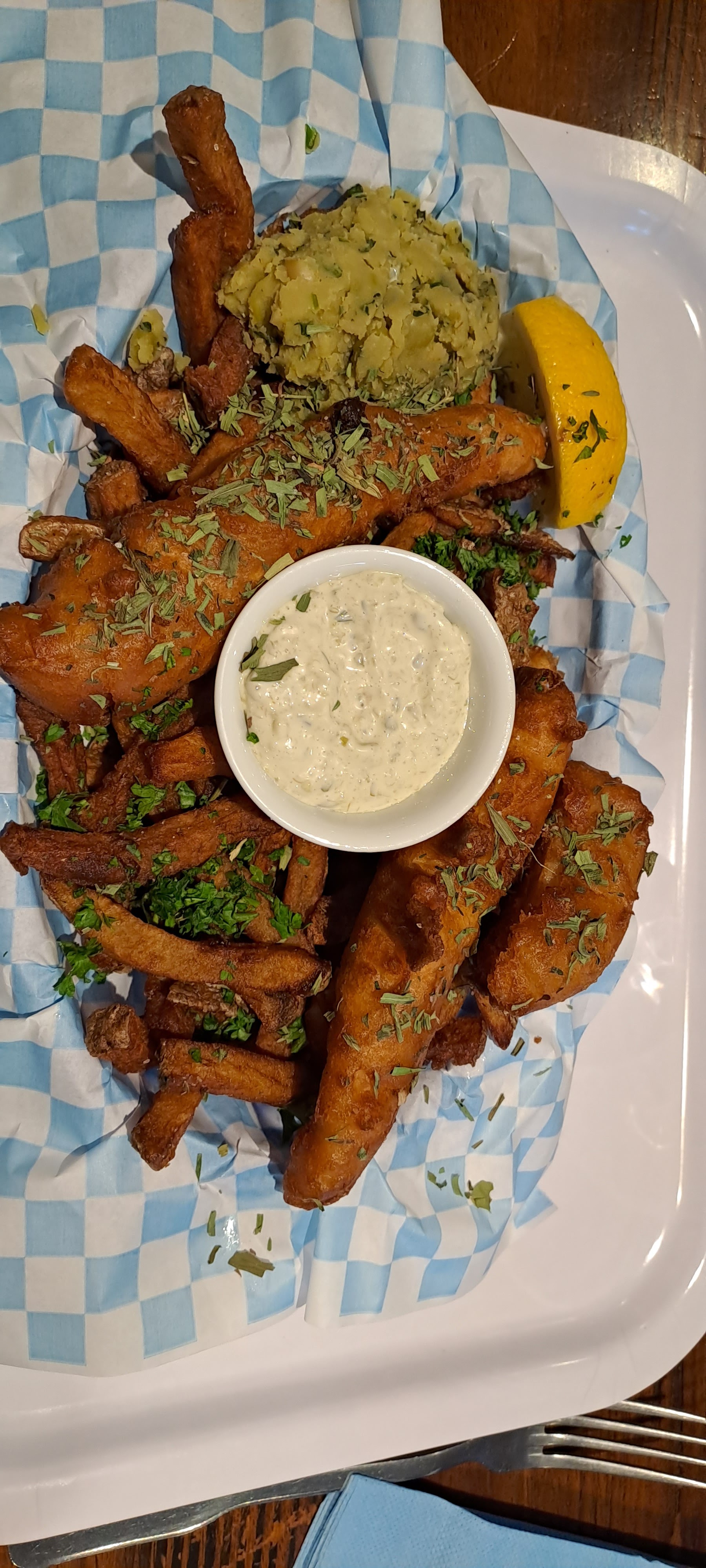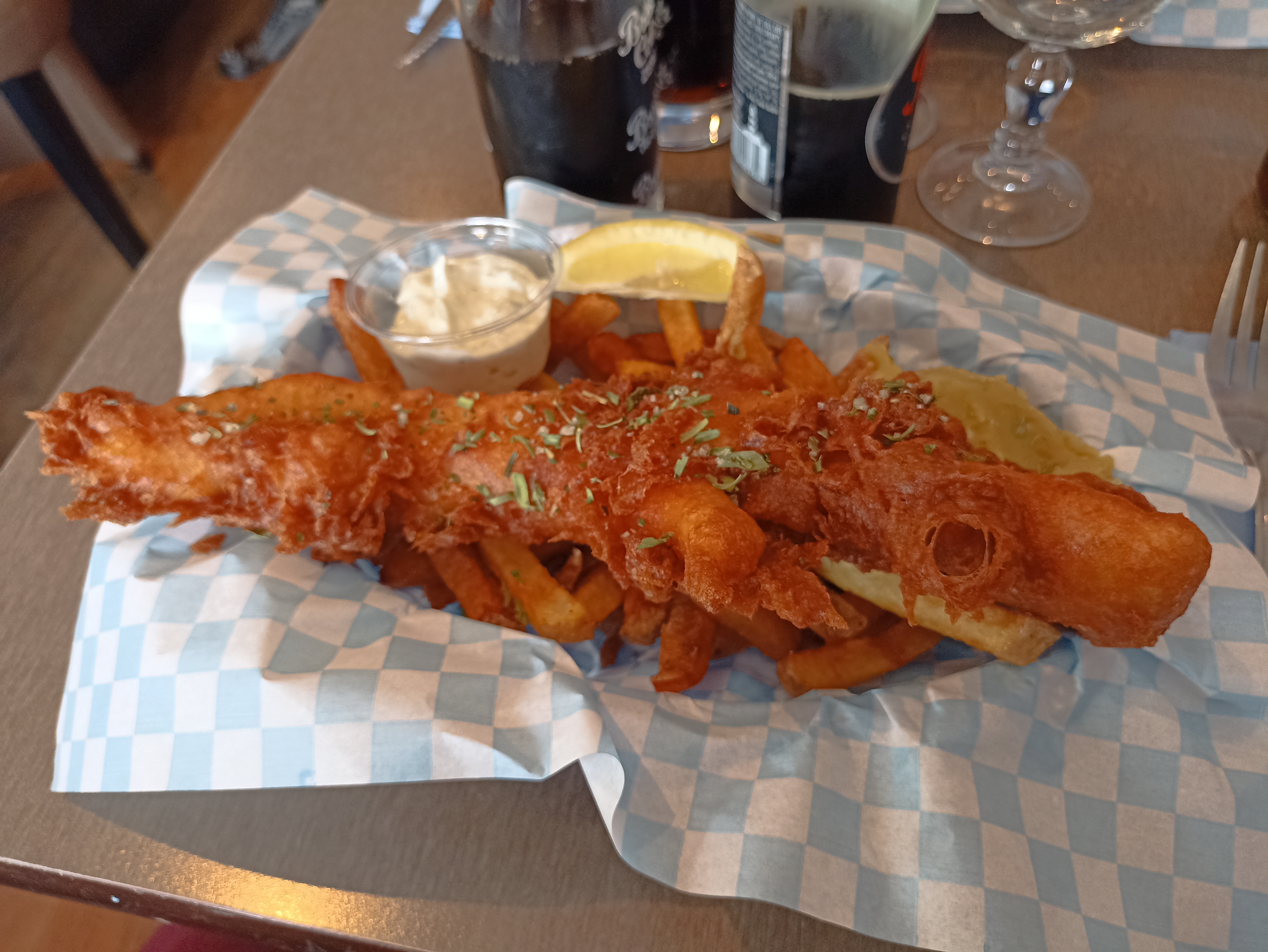 Très bel accueil, j’ai opté pour le classique fish’n chips. Le poisson est tout simplement excellent. La sauce tartare l’est aussi ! Les frites en revanche beaucoup moins. Manque de cuisson, elles étaient beaucoup trop fermes.