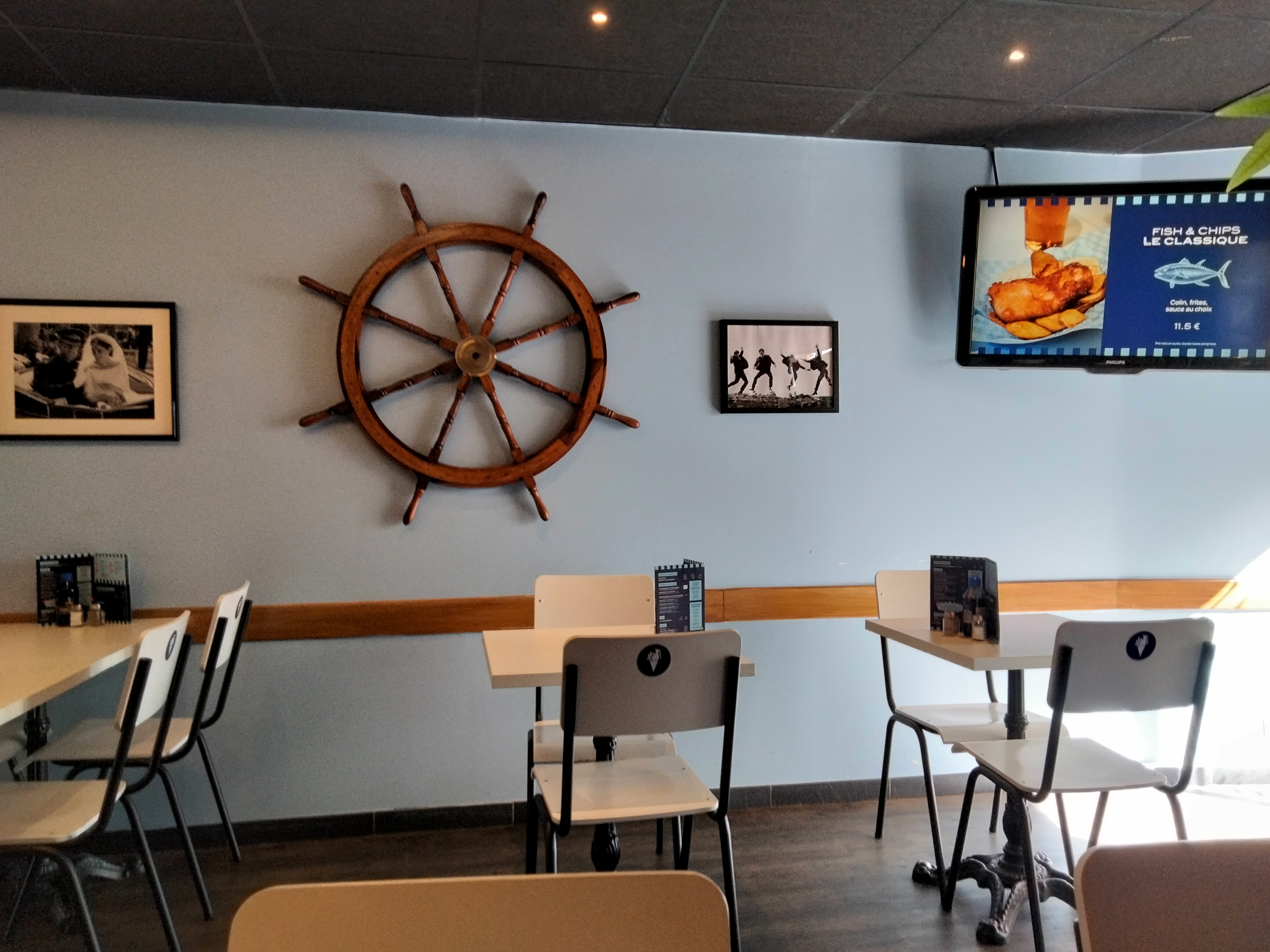 Très bonne expérience ce soir : - Décoration, ambiance, musique de fond, tout est là pour nous transportés soit en angleterre soit au bord d’un port ! - La nourriture est très bonne, frite au top, le burger rien à dire, le supplément cheddar parfait aussi ainsi que la mayonnaise épicé maison ! Repas tres et suffisamment copieux. Pour le classique un léger problème sur la panure mais qui n’affecte pas les 5 ⭐️, mais pourquoi ? … - …. Parce que : Serveur très ( très ) agréable et à l’écoute des clients. Je recommande ce restaurant pour passez un bon moment ainsi qu’un bon repas