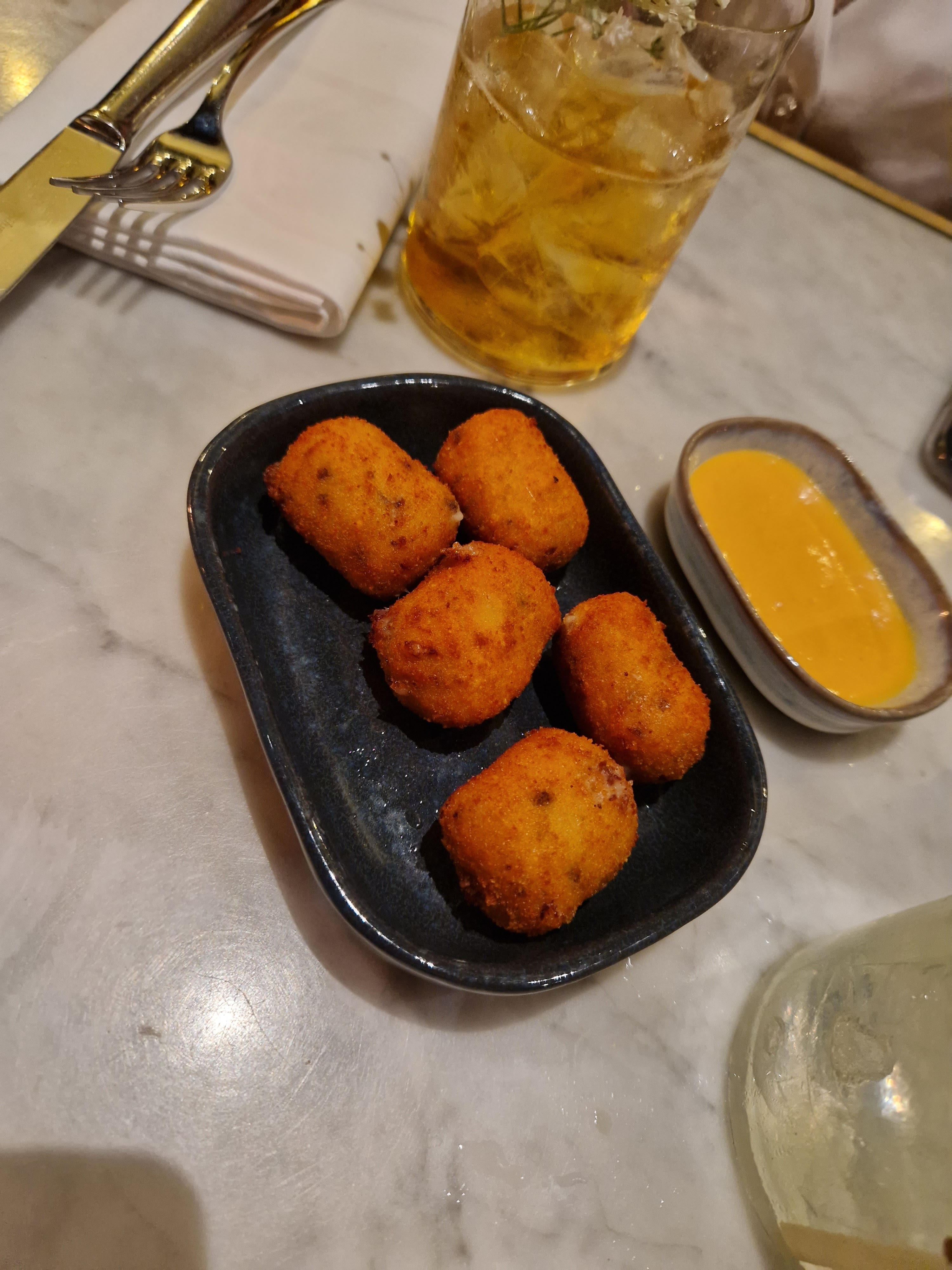 Réservations à 21h30, la table n'était pas prête avant 10h30 donc nous avons dû attendre au bar ce qui n'était pas un gros problème pour nous. J'ai commandé un tas d'entrées et de plats différents qui étaient tous excellents, à l'exception du Tomahawk qui était un gros échec, insuffisamment cuit par endroits et trop cuit dans d'autres. Personnellement, j'aime bien Fitzgerald, mais si vous ne pouvez pas cuisiner un plat, ne l'inscrivez pas dans votre menu.