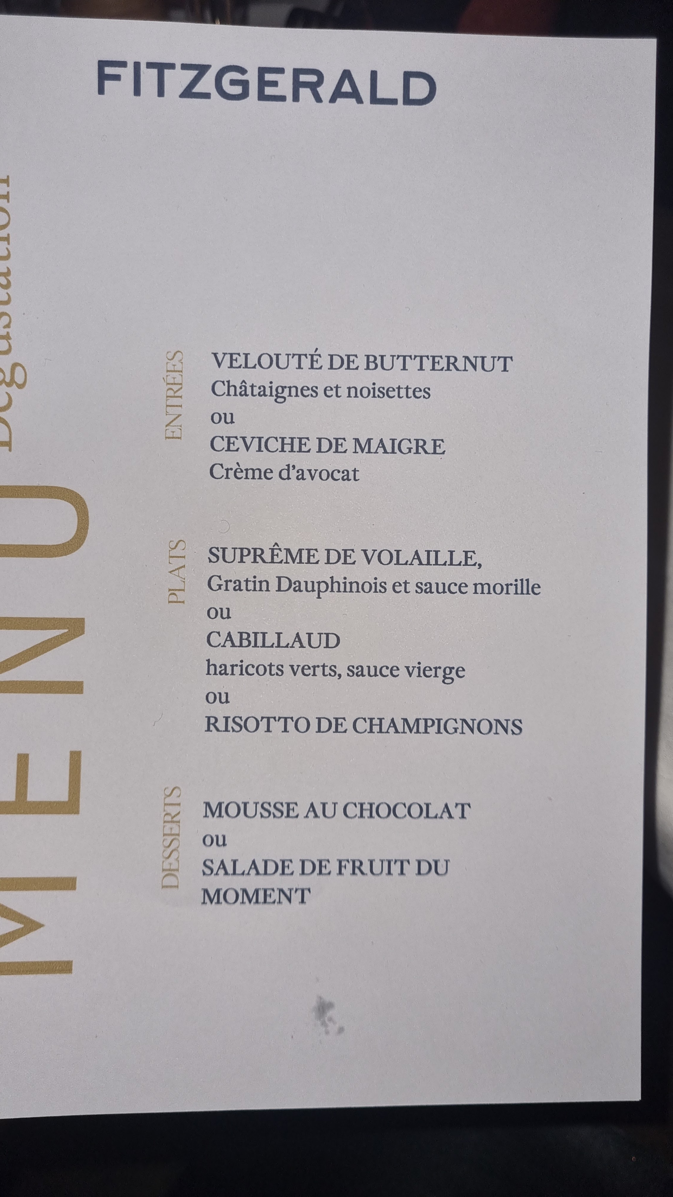 Une jolie adresse sur Paris. Plus adapté à des tablées joyeuses qu’à des dîners en tête-à-tête. Il y a une envie de fête au Fitzgerald ! La carte est suffisamment large. Notre lotte rôtie au vin jaune était réussie. Les mets sont de qualité. On aime vraiment l’ambiance.