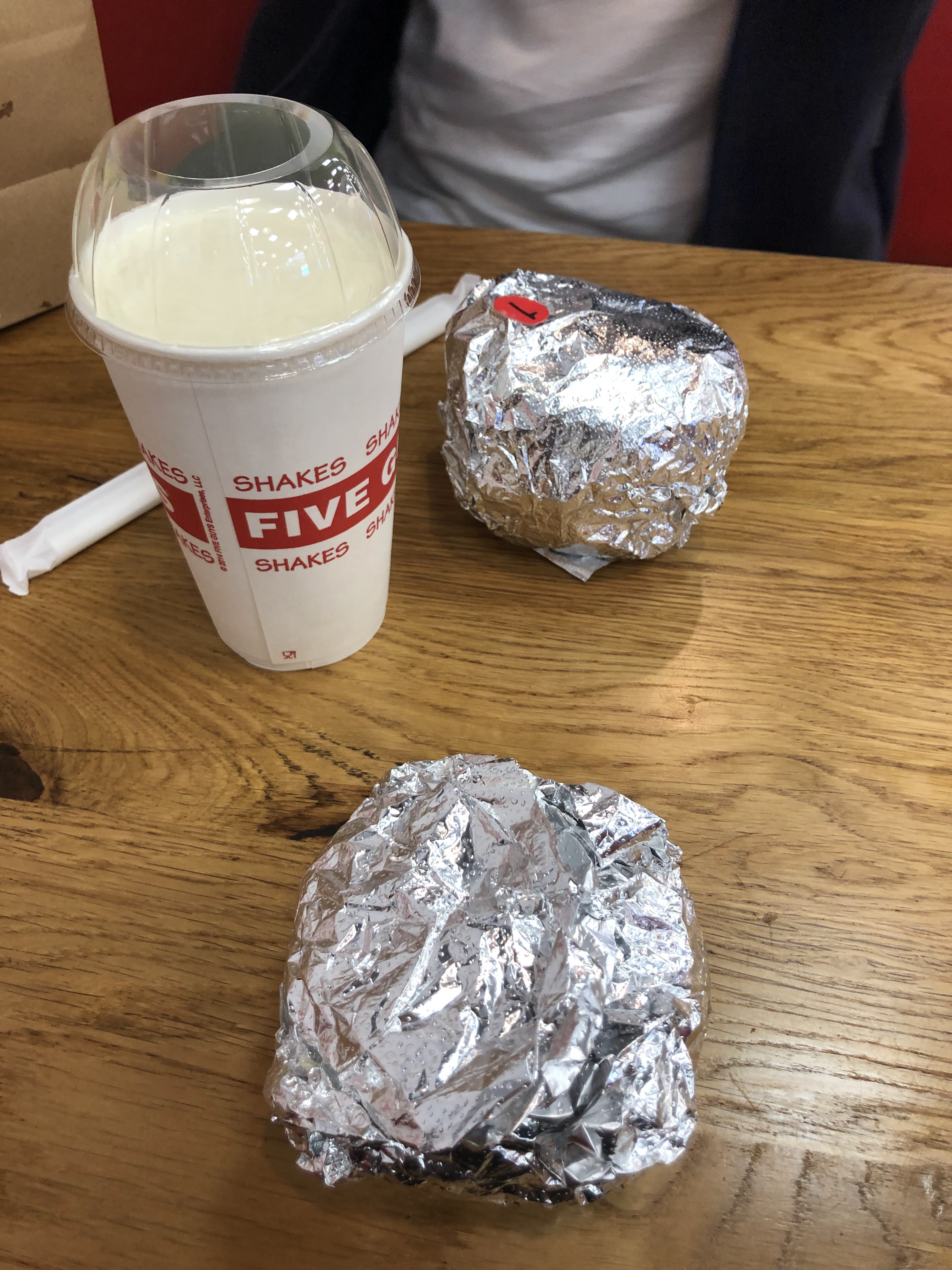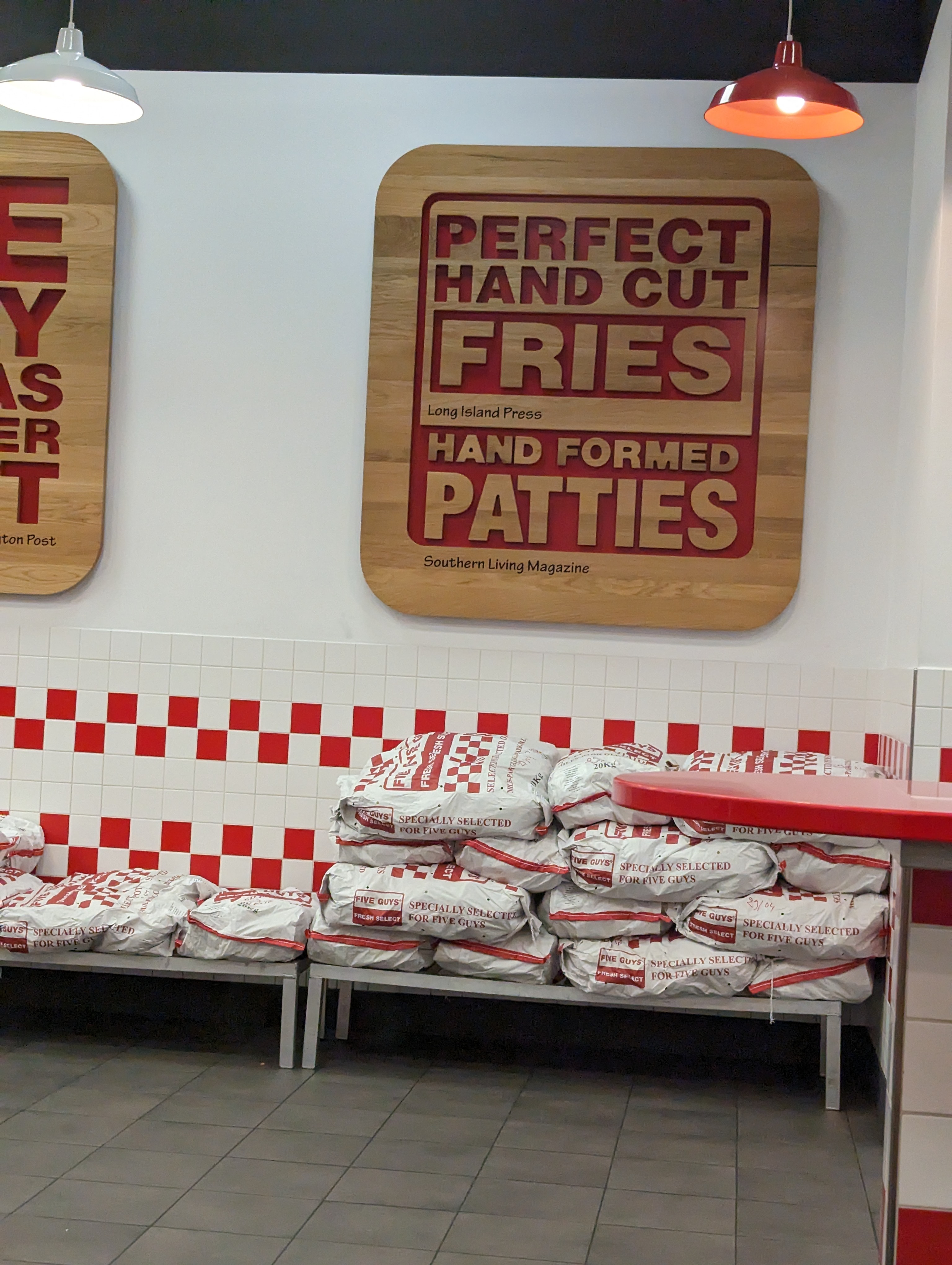 Personnel pas très accueillant, ni souriant Attente très longue pour retard et surtout que notre commande qui etait prête est restée de côté donc repas froid .... inadmissible quand on voit le prix des hamburgers qui sont quand même bons mais j'ai vu mieux dans un autre Five Guys. Mauvaise organisation dans la cuisine Même pas de plateau pour manger sur place .