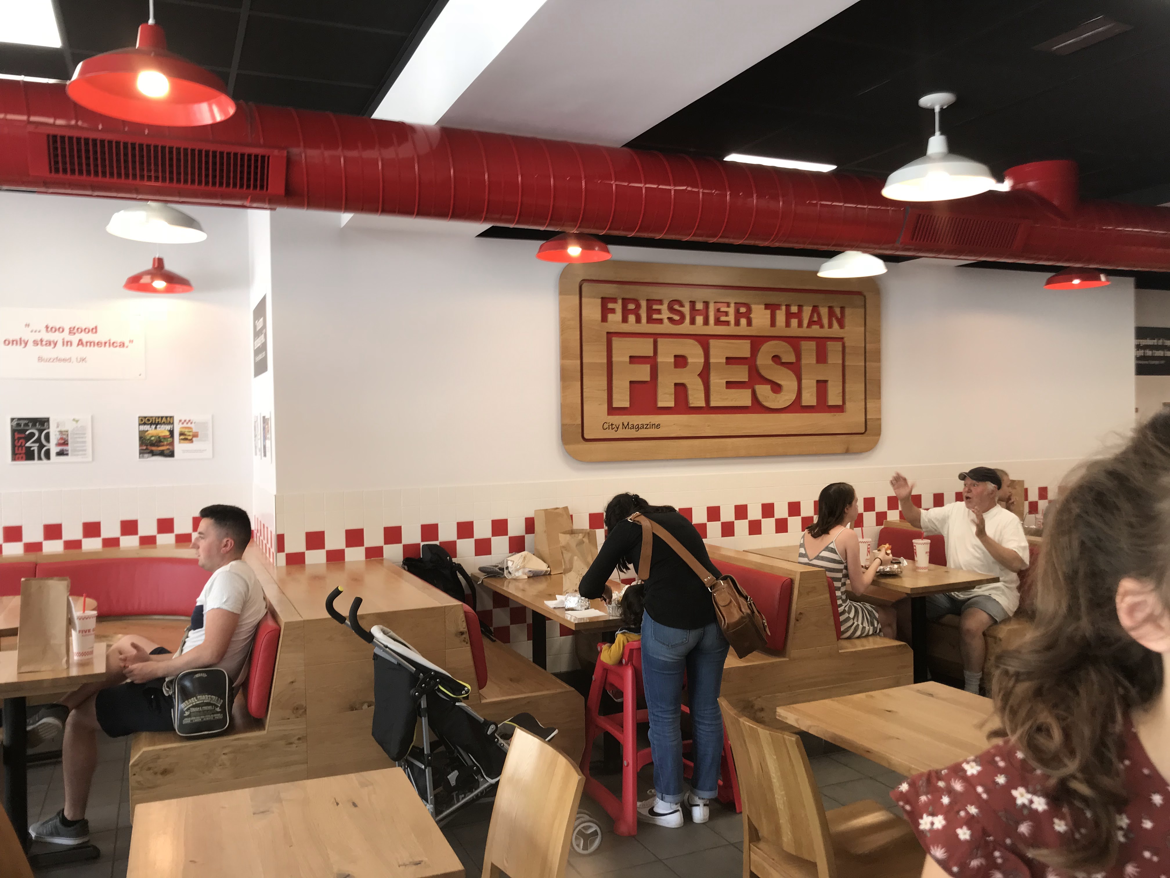 Bon restaurant avec des produits frais chez fives guys la qualité prime.la salle est propre le service est agréable mais les prix un peu cher