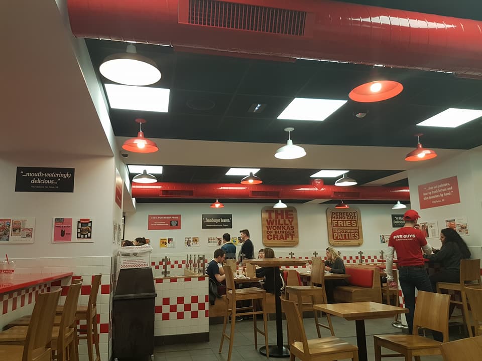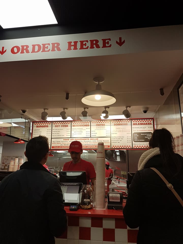 Five guys propose de très bon Burger et des frites maison au top, le seul point négatif étant le prix, cela reste chère pour une simple « burger frites ». Les cuisines sont propres, le service au top et il y’a une bonne ambiance. Je recommande ce fast-food !