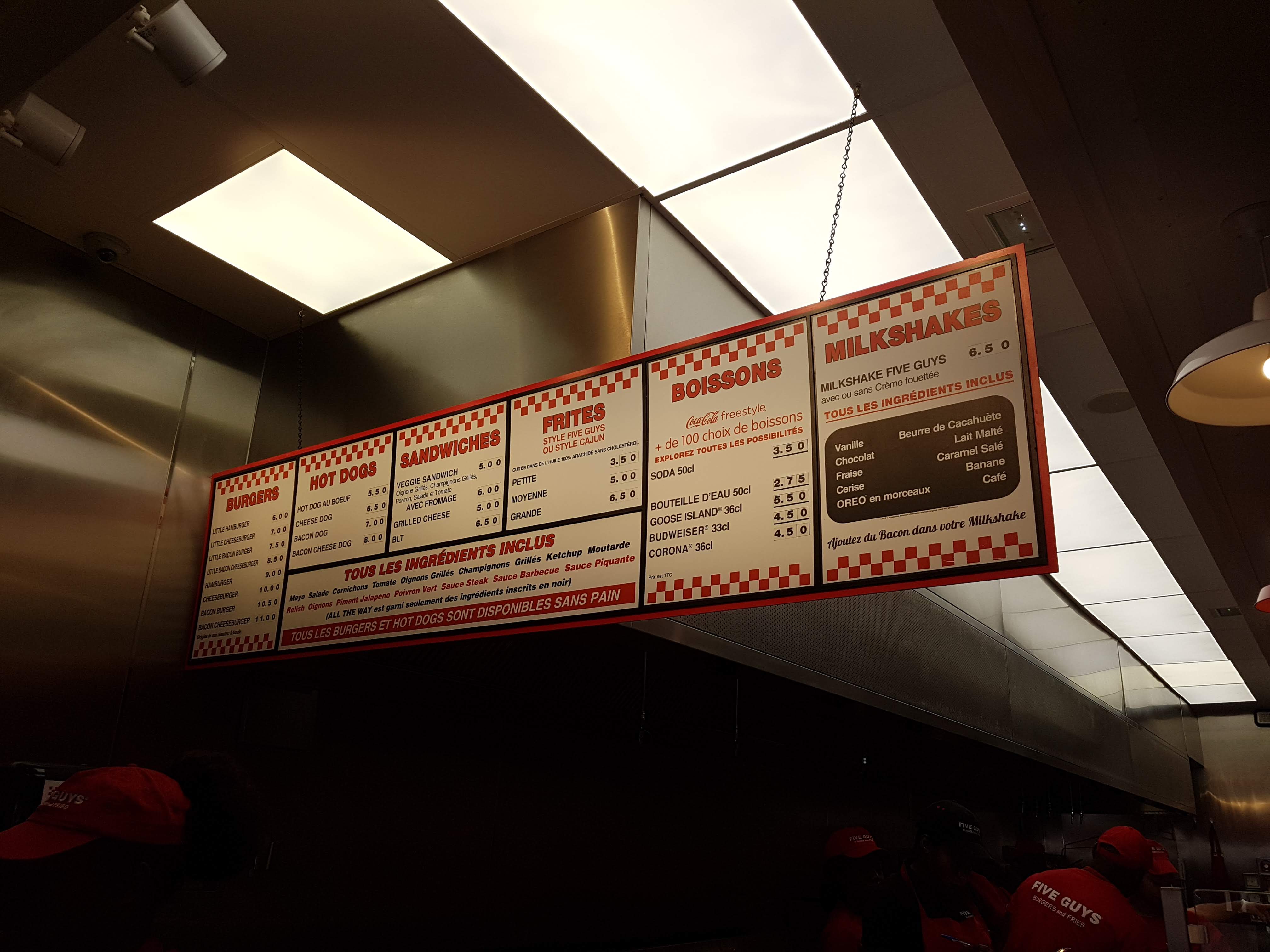 Première fois chez Five Guys. Alors, premier conseil, ne pas se fier aux menus habituel des autres fast-food. Un hamburger de chez eux en vaut deux d'un concurrent. Gustativement parlant, c'est assez correct. On compose son hamburger avec un choix de quinze ingrédients. Deux légers bémols me poussant à ne mettre que 4 étoiles : les frites sont bonnes mais HYPER salées (peut être erreur du jour...) Et les prix sont assez élevés. Alors la qualité y est mais les boisons viennent clairement plomber le truc (3€ la bouteille d'eau. Et presque 4€ un verre de soda insipide sans bulle...). Bref, expérience sympa, mais prix un peu chers.