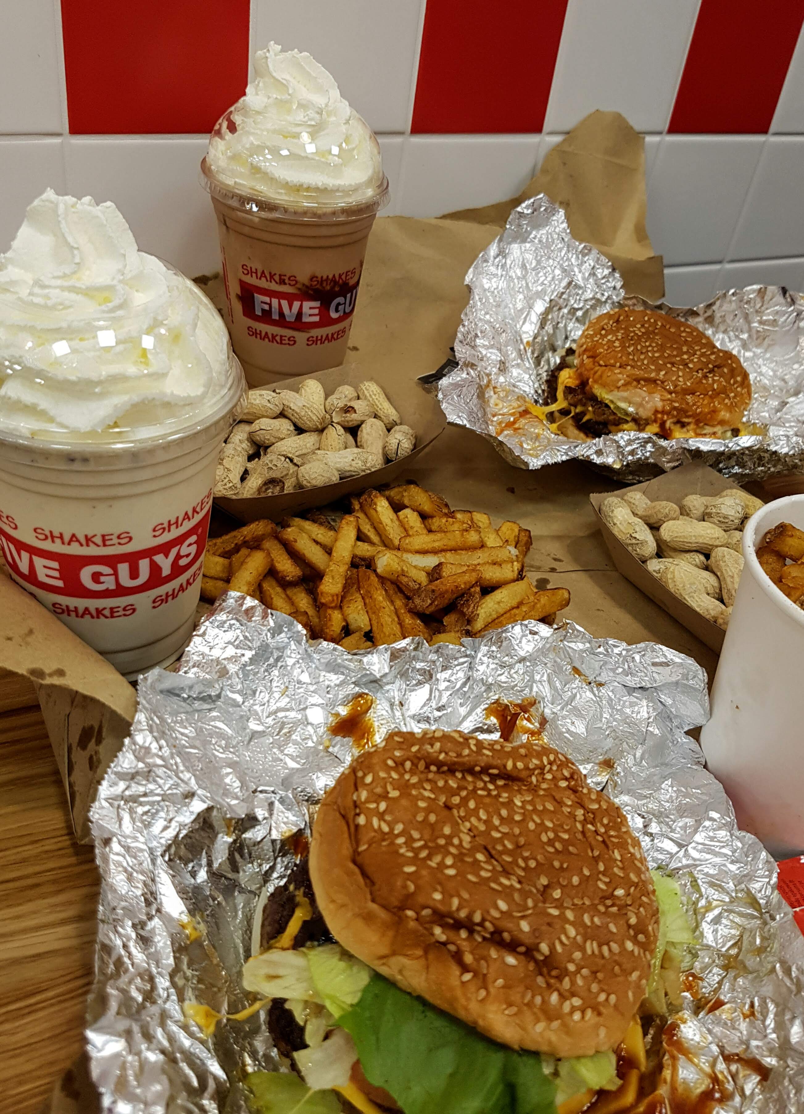 Manger chez Five Guys c'est comme n'importe quelle fast food mais en mieux 😅 Je conseille les hot dog qui sont délicieusement bons (saucisse coupée en deux et grillée 🤩), et le milkshake vanille Oreo avec bien sûr de la crème fouettée dessus 🤯 pour les plus farouches un peu de bacon avec l'oreo ramène un peu de salé 😅 Pas obligé de prendre des frites, les cacahuètes vont très bien en complément