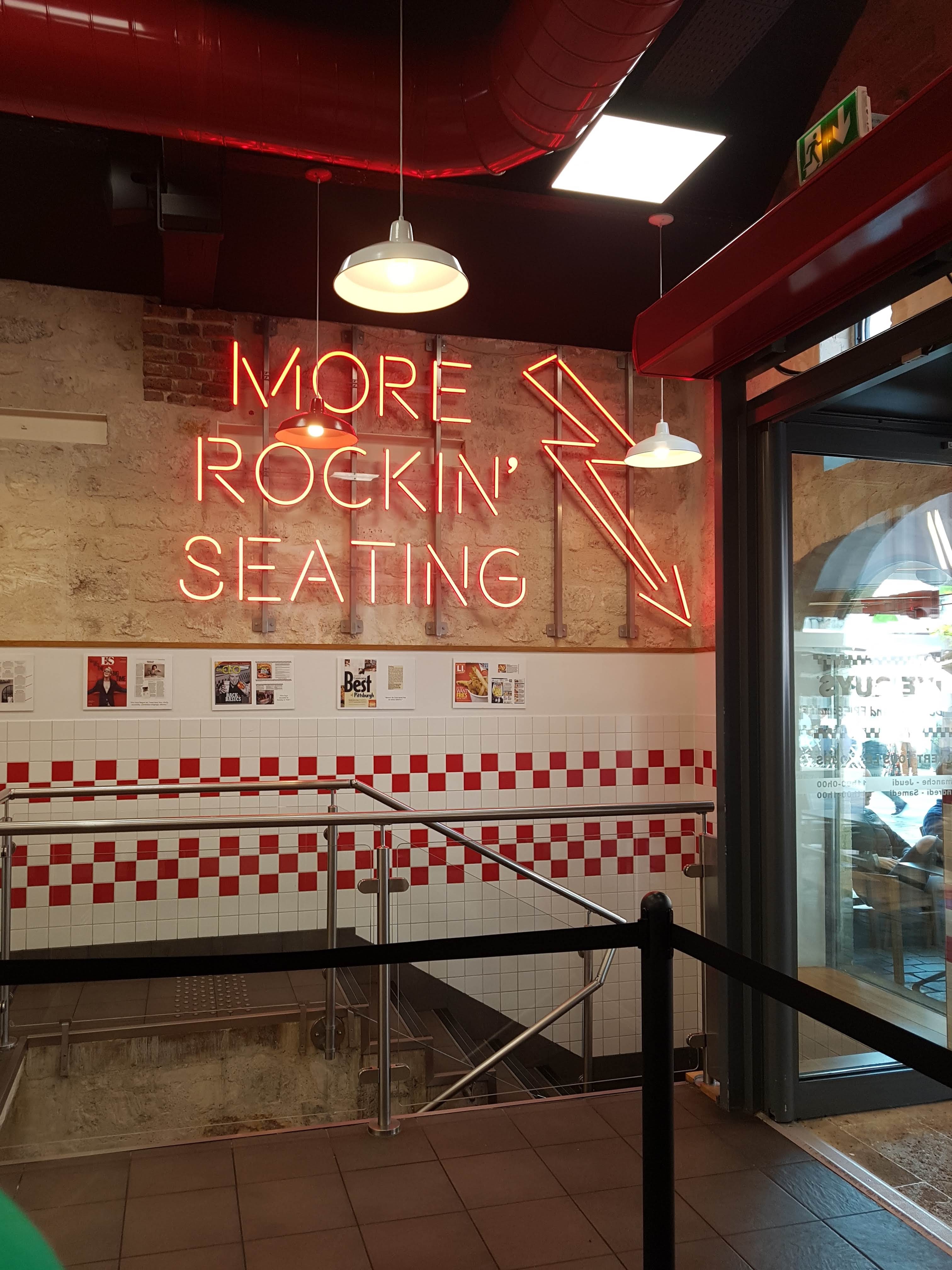 Je suis venu le samedi 8 juin. Une bonne expérience, je ne connaissais pas cette chaîne de fast food et je ne suis pas déçu. J'ai pris un cheesburger bacon avec une moyenne frite et un milkshake a l'oreo. Les frites sont bonnes, le Burger malgré qu'il soit un peu froid était appétissant et le milkshake goûteux mais trop sucré à mon goût. L'ambiance y est agréable, plongé dans le monde des USA le concept de mettre des cacahuètes à volonté est une super idée originale. Le service y est plutôt bien avec un personnel majoritairement aimable. Dommage que les toilettes étaient hors service. Le prix est un peu trop élevé à mon goût mais une fois ressortit nous sommes bien rassasié. Je conseille pour y manger occasionnellement.