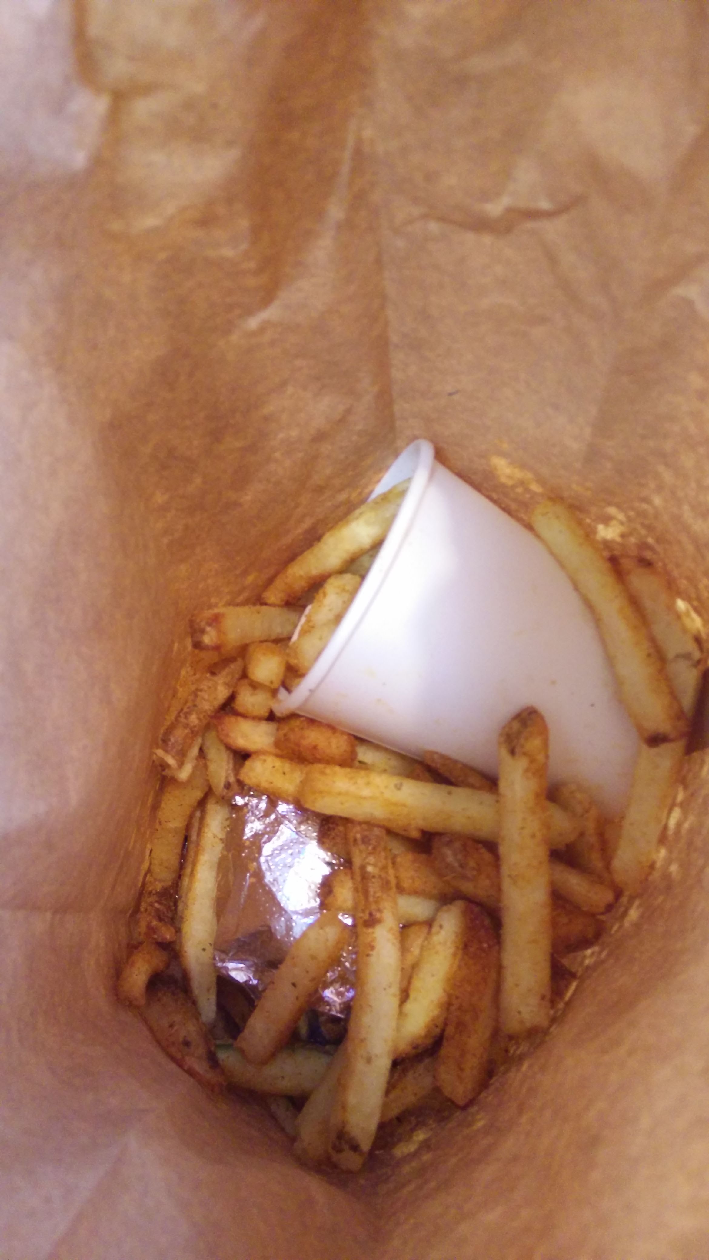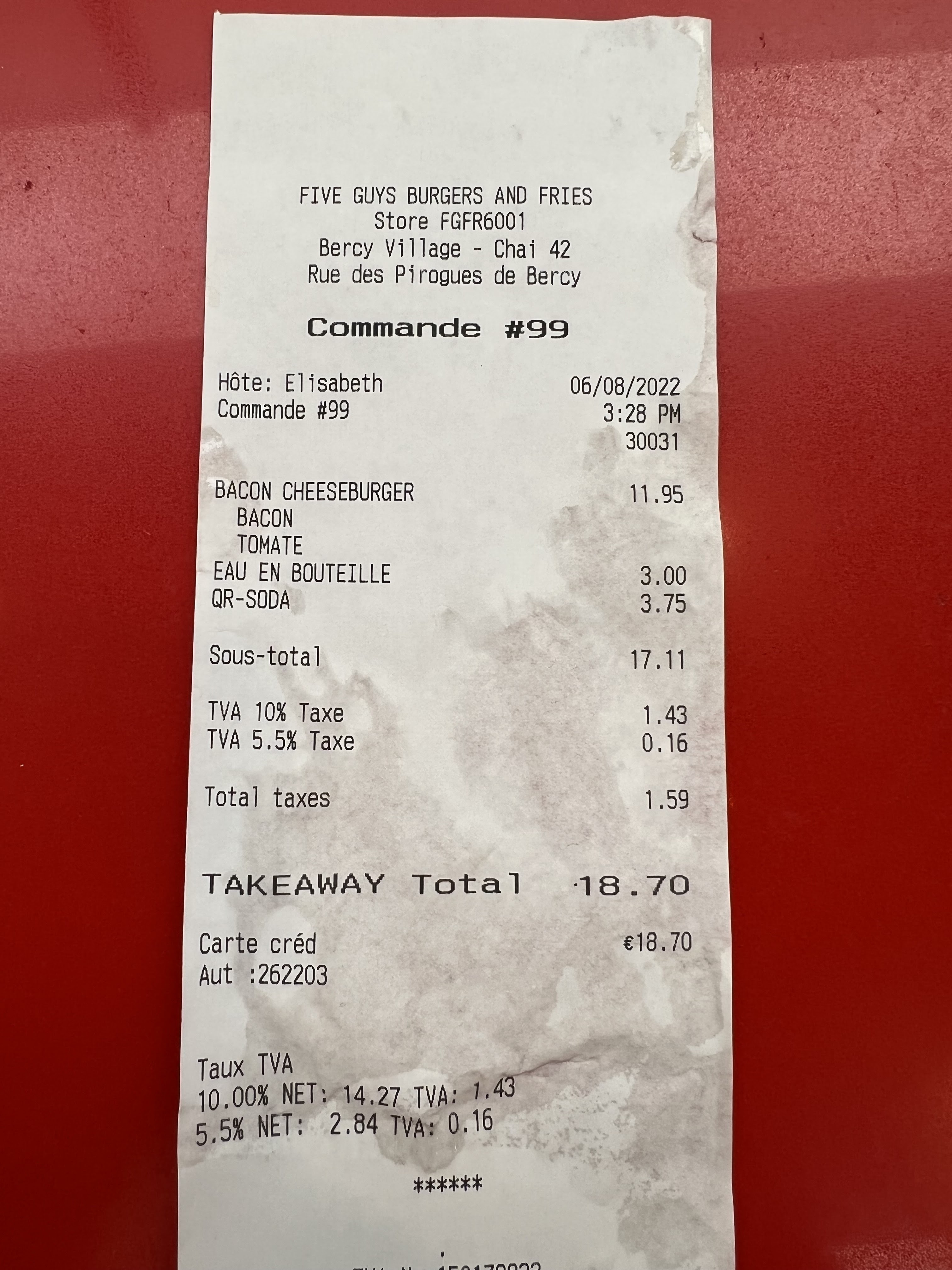 Oh gars y’a 4 articles sur le ticket : 2 burgers, 1 frite, des sauces! D’accord c’est pas cool comme métier de mettre des plats dans un sachet mais même ça tu n’y parviens pas : Qu’est ce tu comprends pas, les frites sans sauce c’est le mal ! et c’est systématique à Five Guys Bercy manque toujours un truc mais je paye toujours 40 balles pourtant