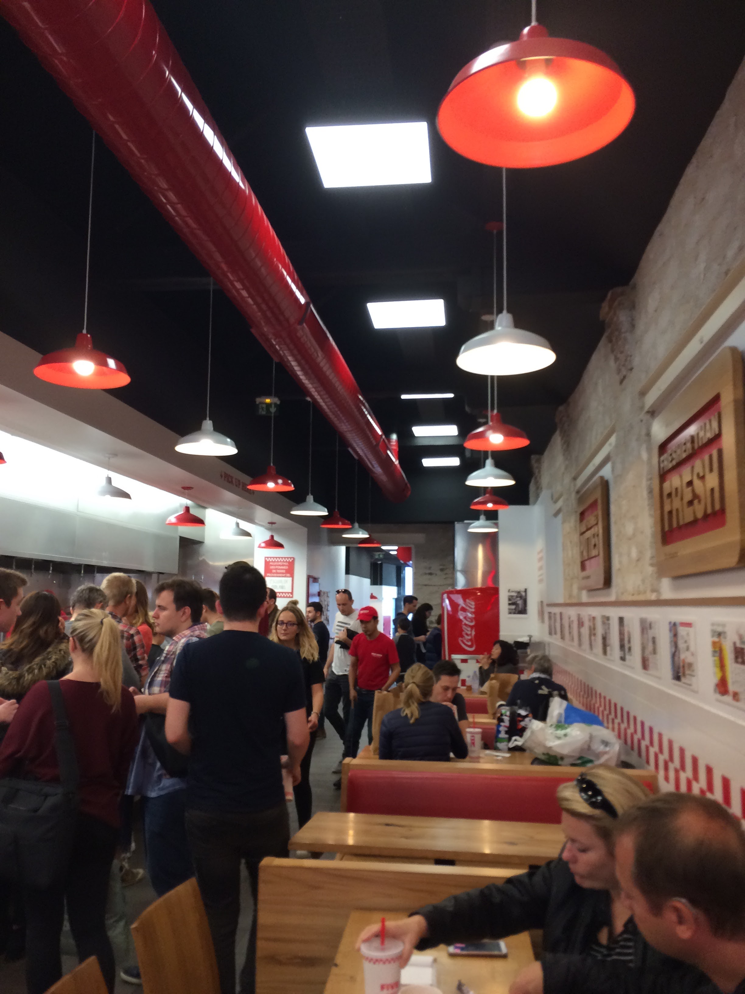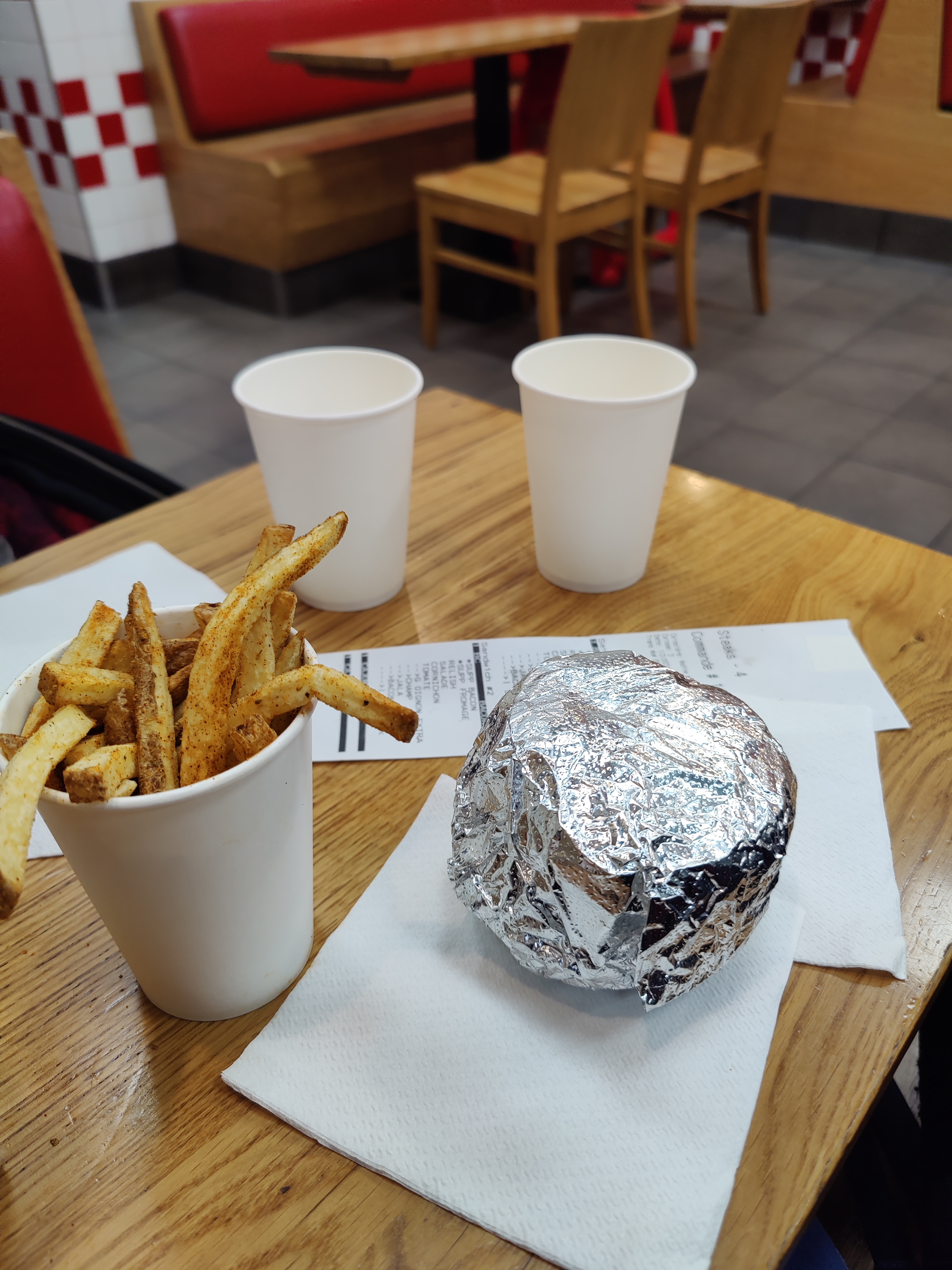 Je ne connaissais pas du tout cette chaîne de restaurant et j’ai été agréablement surpris! Malgré une longue file d’attente, j’ai patienté seulement 5 minutes donc parfait! Le choix pour les burgers est vraiment bien et les portions de frites sont gargantuesques ! Le prix est tout de même un peu élevé...