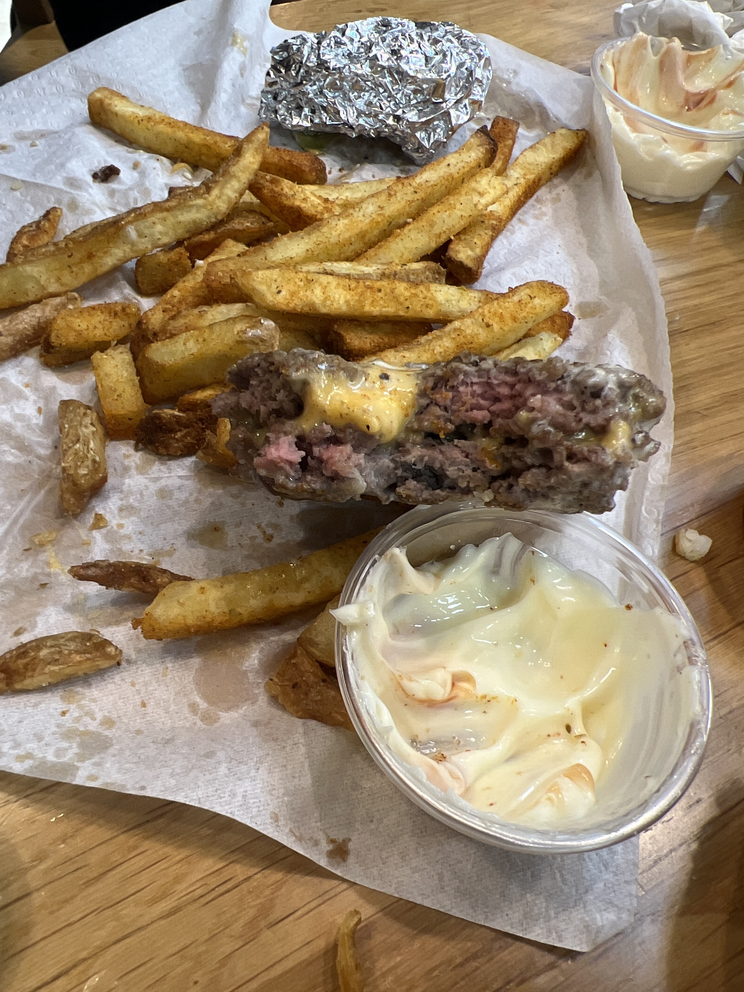 Première fois, Et le cheesburger qu’on pourrait appeller double cheesburger est juste excellent les frite à casiment 7€ suffisent pour 4 personnes comme le vendeur me l’a conseillé. C’est tellement rare de trouver de si bon burger et frite Petit plus les sauces sont à volontés! Et le personnel est sympathique et bonne ambiance en cuisine ça change des fast food qui sont majoritaires en France