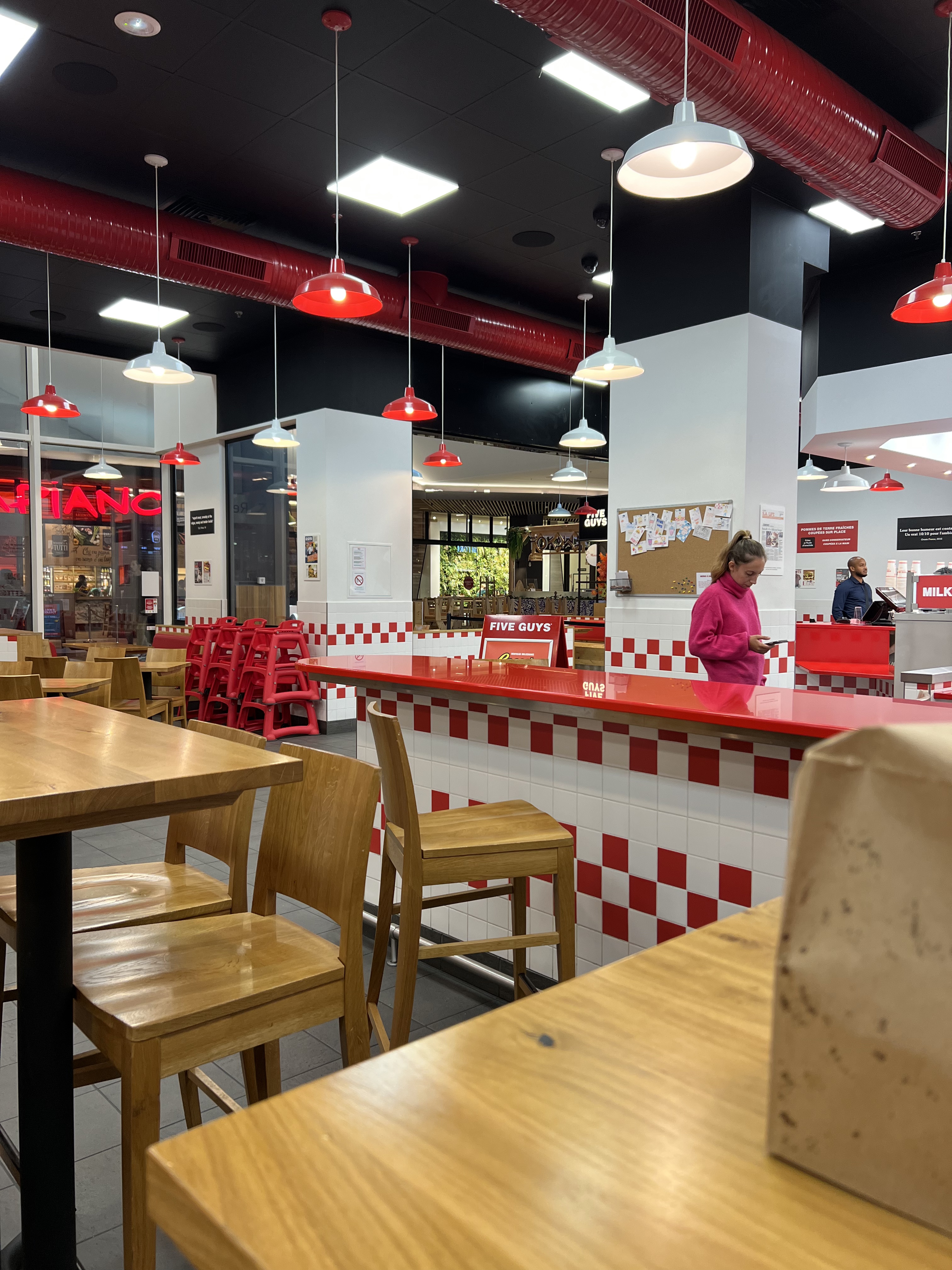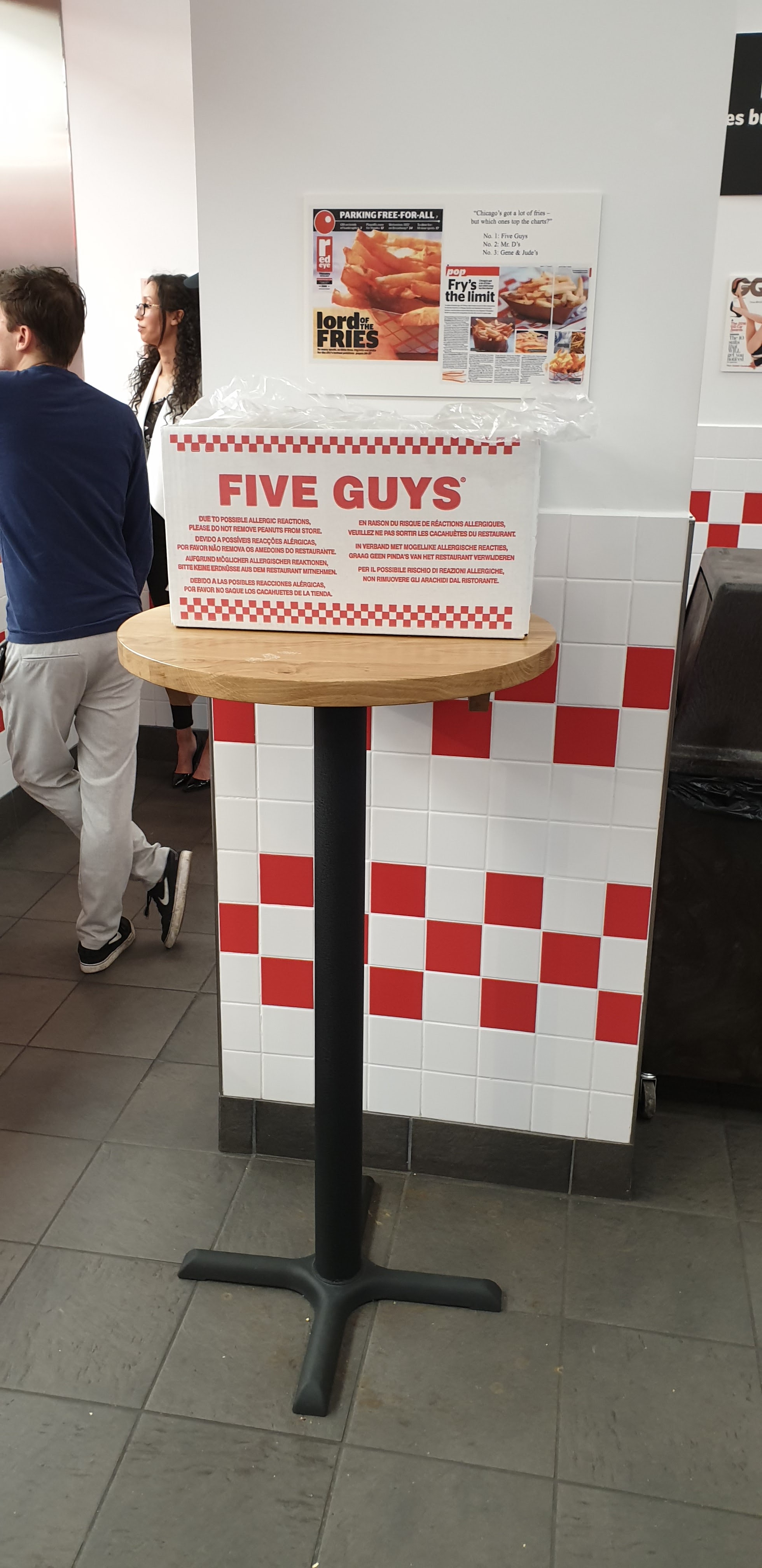Première fois chez five guys...déçu.. c'est bruyant, il y a un écho... questions gout c'est mieux que macdo c est sure mais le prix est 2-3 fois plus cher..clairement ca ne les vaut pas. La quantité n'est pas énorme..bref sans intérêts.