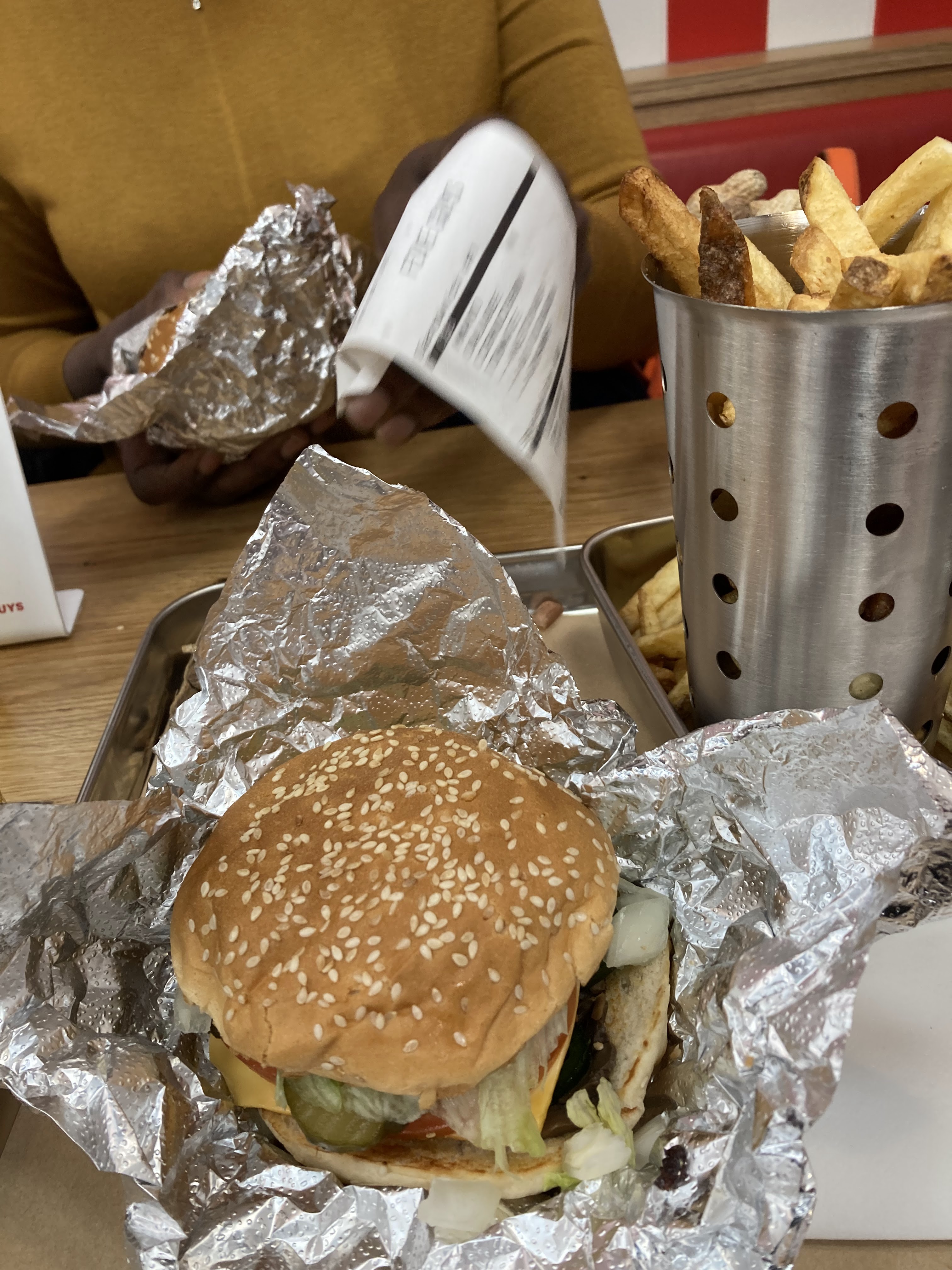 Première fois à Five Guys. Je ne savais pas qu'il n'y avait pas de poulet au menu, seulement du bœuf. Même si je ne mange pas vraiment de bœuf, j'ai apprécié. Les meilleures frites.