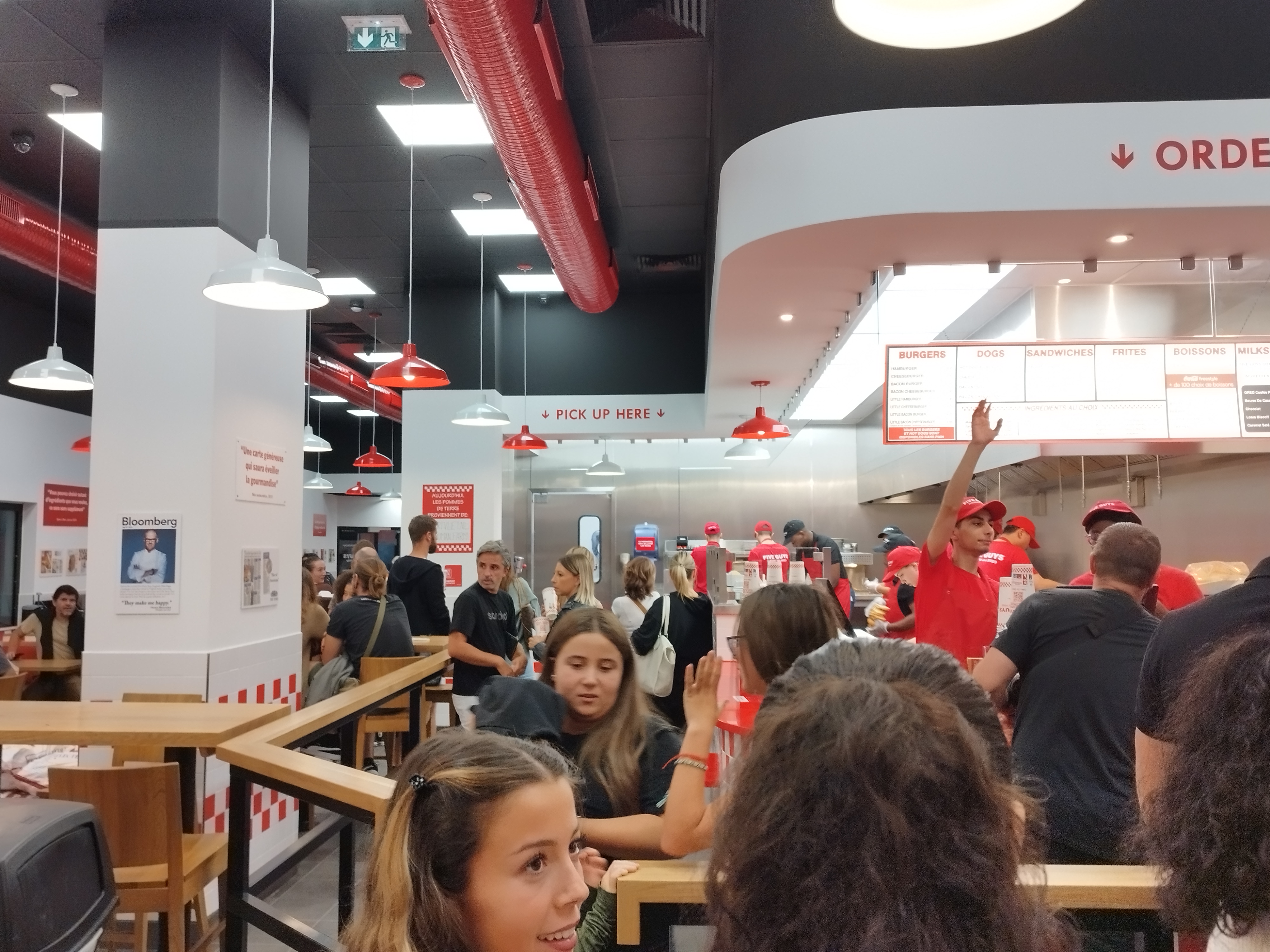 Avis mitigé ! La nourriture est bonne et représente vraiment l'enseigne Five Guys. Cependant, la hauteur sous plafond est immense et la cuisine est dans la même salle que là où les clients mangent résultat : Un brouhaha pire que dans un hall de gare. Il faudrait peut-être installer des panneaux pour isoler le son, ça en devient très dérangeant, on n'entend même pas la musique d'ambiance qui est masquée par les voix et les bips continus des machines. De même pour les tables, il n'y a que des tables de 4 en intérieur donc pour les groupes 5, 6 ou plus il faudra choisir ses compagnons de repas. Pour ce qui est de l'extérieur il n'y a pas assez de places donc le choix est vite limité. Je ne sais pas si je reviendrai manger sur place, peut-être à emporter !